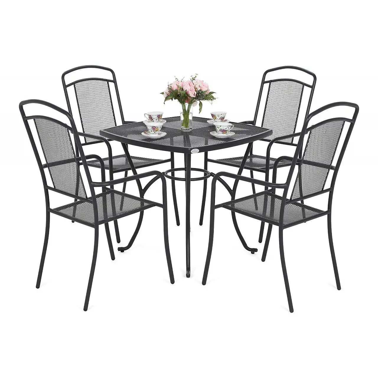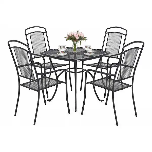 Комплект садових меблів Venezia - це дуже елегантний і міцний набір сталевих меблів, пофарбованих високоякісною порошковою фарбою. Конструкція стільців і столу дуже міцна і стійка до погодних умов. Міцна сталева сітка, яка гарно інтегрована в стільницю столу та стільця, надає меблям унікальний характер. Меблевий гарнітур буде ідеально виглядати в будь-якому саду або на терасі.