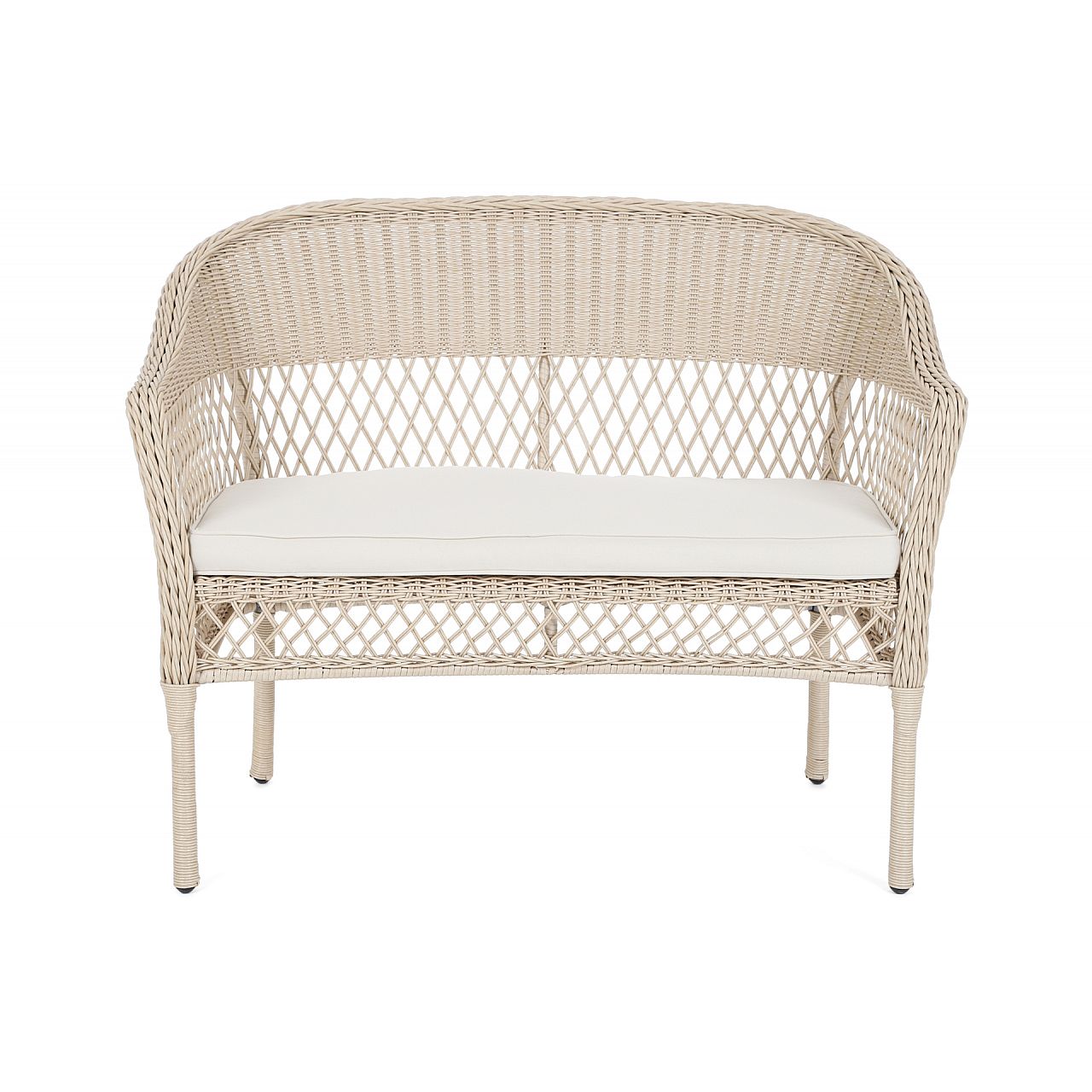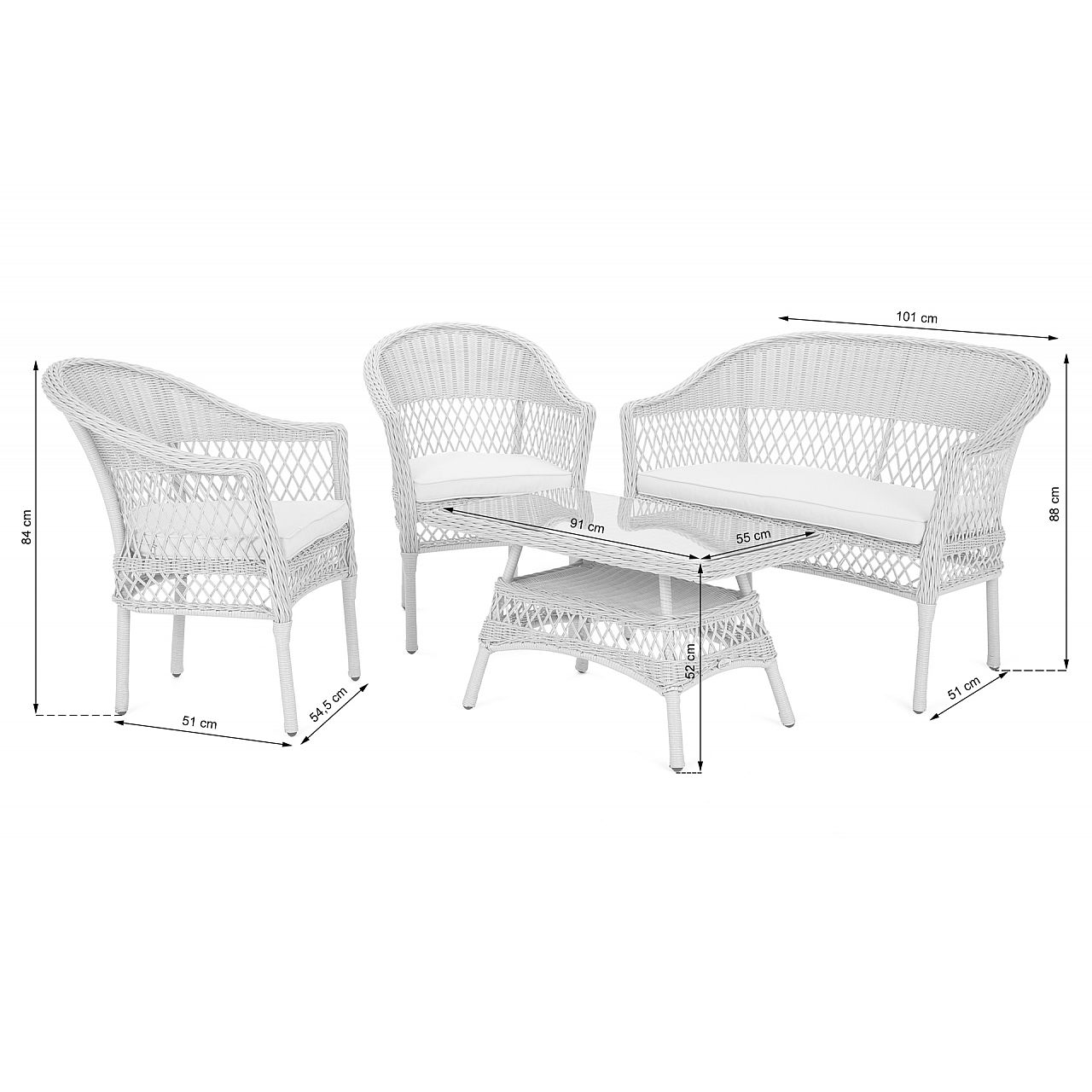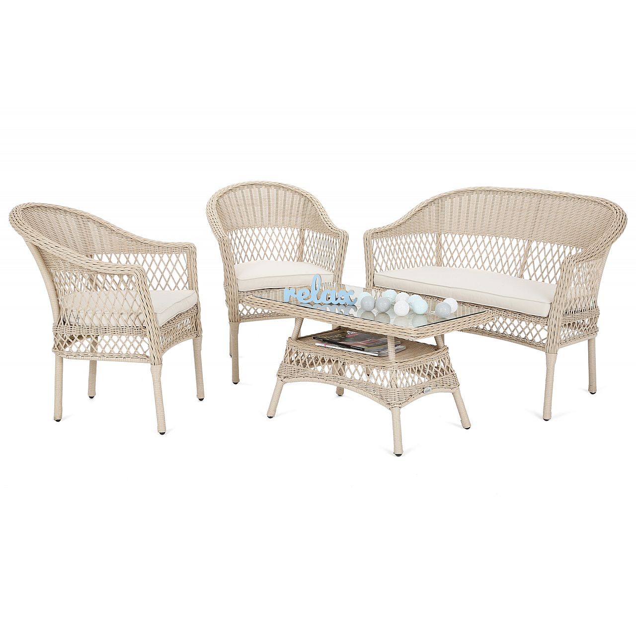 Набір розрахований на 4 особи, які зручно розмістяться на дивані та двох кріслах. Вся конструкція виготовлена з техноратгана - синтетичного матеріалу, який легко чистити та пересувати. Алюмінієвий каркас робить диван, крісла і стіл більш міцними. Завдяки регульованим ніжкам весь набір стійко стоїть на будь-якій поверхні, навіть на нерівних газонах.