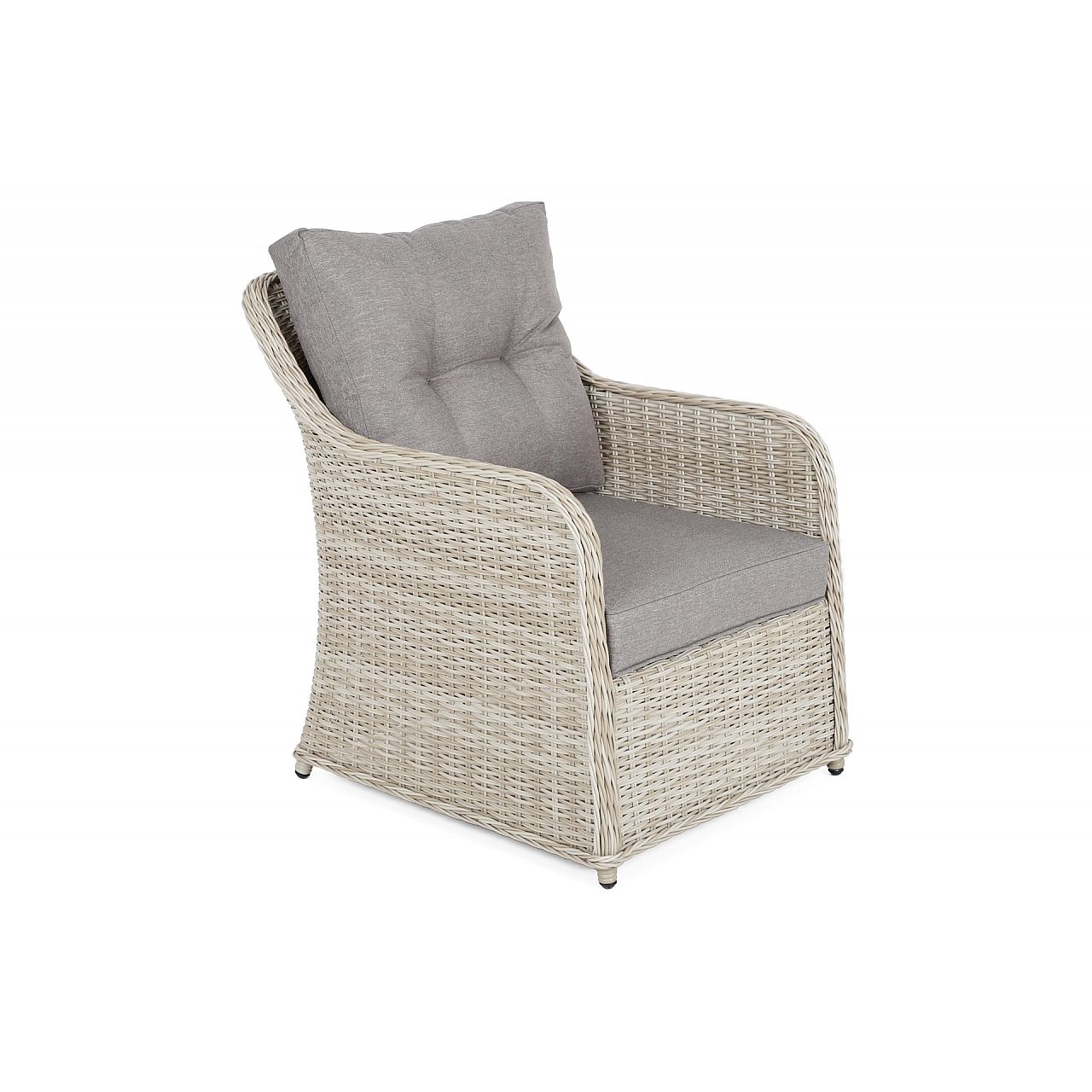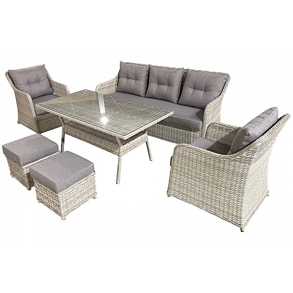 Покриття з техноратанга, міцного матеріалу, стійкого до несприятливих погодних умов і надлишку сонця, робить комплект Bergamo схожим на плетений. Рамна конструкція з алюмінію додає міцності. До кожного сидіння в комплекті додаються зручні подушки. Подушки сидінь мають знімні чохли, тому ви легко позбудетеся від випадкового забруднення. Набір Bergamo може використовуватися до 7 осіб - це ідеальне рішення для садових зустрічей теплими вечорами. Пропозиція включає різні кольорові версії, тому набір можна адаптувати до облаштування всього саду.