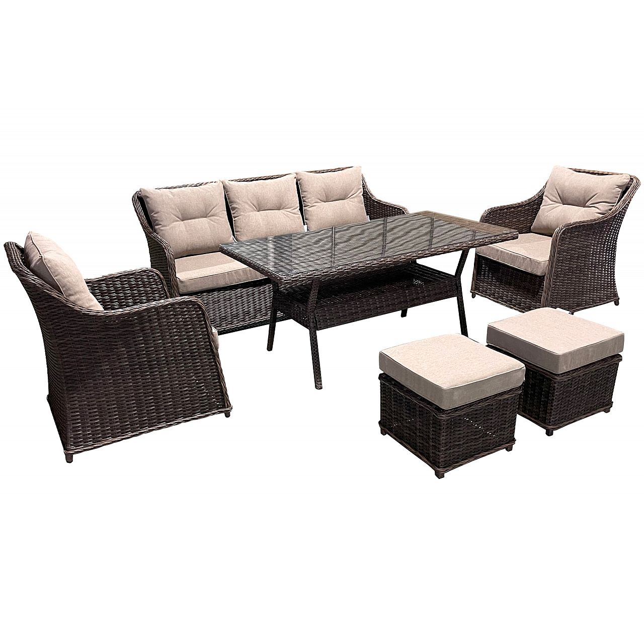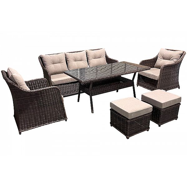 Покриття з техноратанга, міцного матеріалу, стійкого до несприятливих погодних умов і надлишку сонця, робить комплект Bergamo схожим на плетений. Рамна конструкція з алюмінію додає міцності. До кожного сидіння в комплекті додаються зручні подушки. Подушки сидінь мають знімні чохли, тому ви легко позбудетеся від випадкового забруднення. Набір Bergamo може використовуватися до 7 осіб - це ідеальне рішення для садових зустрічей теплими вечорами. Пропозиція включає різні кольорові версії, тому набір можна адаптувати до облаштування всього саду.