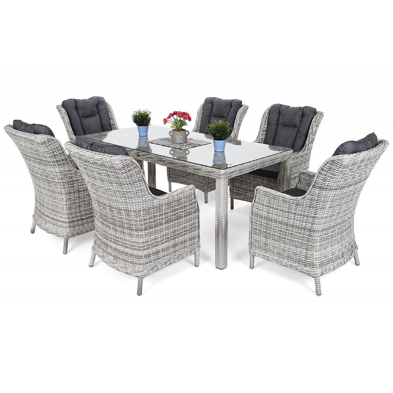 Набір меблів з техноротанга для їдальні, ідеально підходить для тераси або для організації урочистих заходів з найближчими друзями. Зручний і комфортний, він задовольнить найвишуканіші смаки. Набір складається зі столу з міцною стільницею із загартованого скла товщиною 5 мм і 6 зручних крісел з подушками. Конструкція столу виготовлена з алюмінієвих профілів, покритих техноротангом ручної роботи в елегантному стилі. Текстура техноротанга нагадує лозу, гладка і приємна на дотик. Подушки оброблені водонепроникним матеріалом, який легко знімається та чиститься за допомогою блискавки. Садові меблі Bristol - це розкіш для людей, які цінують цікавий дизайн і функціональність.