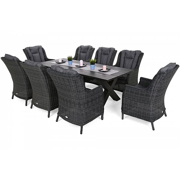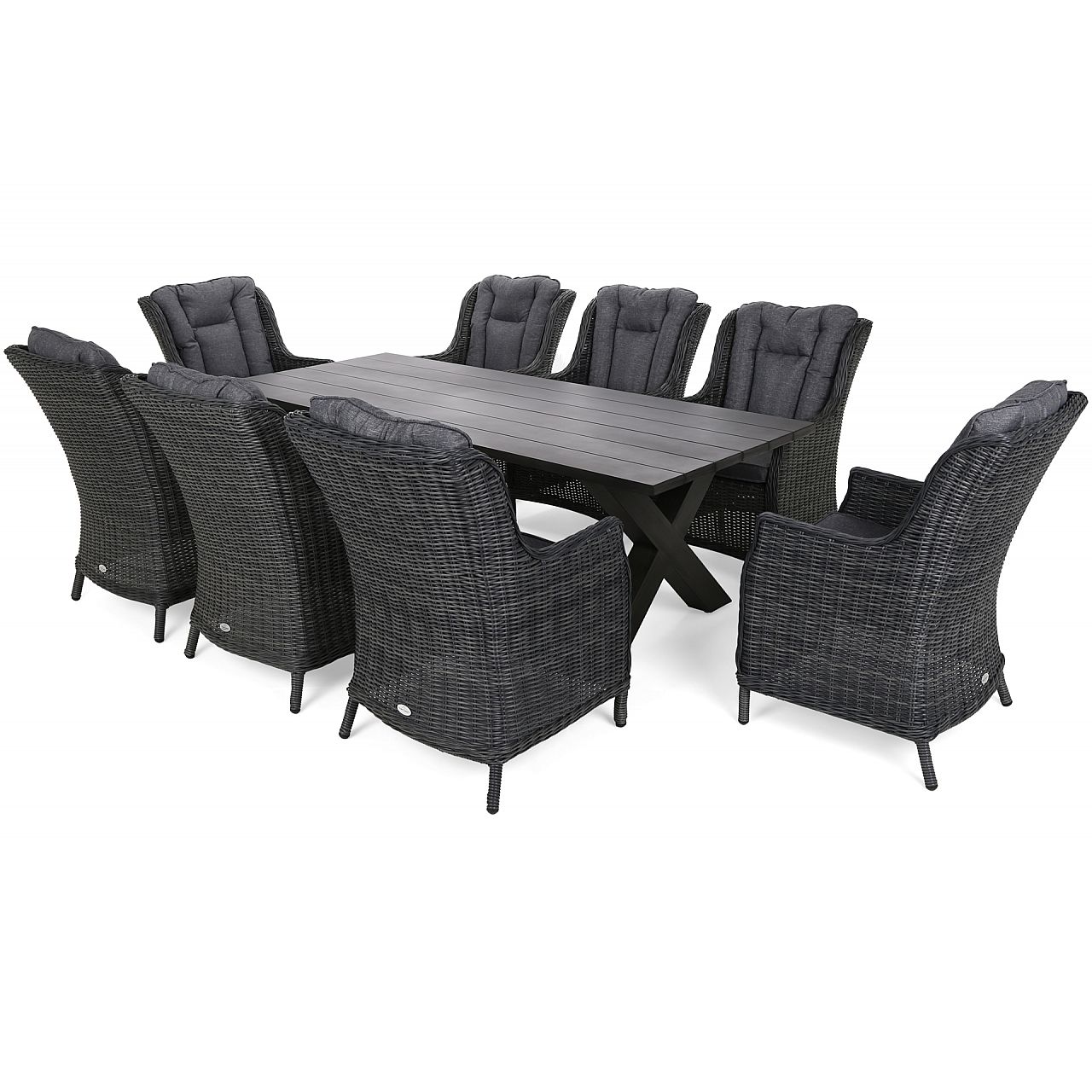 Садові меблі з технораттанга з колекції Bristol чудово підійдуть для трапези великою компанією. Пропозиція розрахована на 8 осіб, тому за столом можна вдало сісти всією родиною або компанією запрошених друзів і знайомих. Комфорт забезпечує особлива конструкція крісел (відповідно профільоване сидіння та спинка) та приємні м’які подушки. Великий стіл надасть кожному повну свободу і дозволить подати багато страв.
