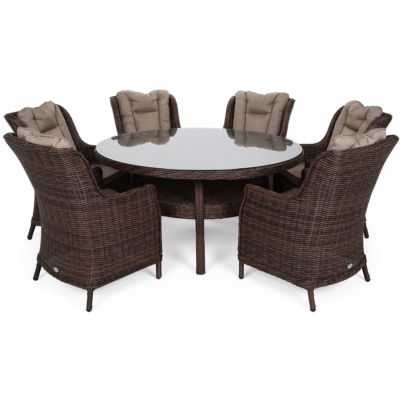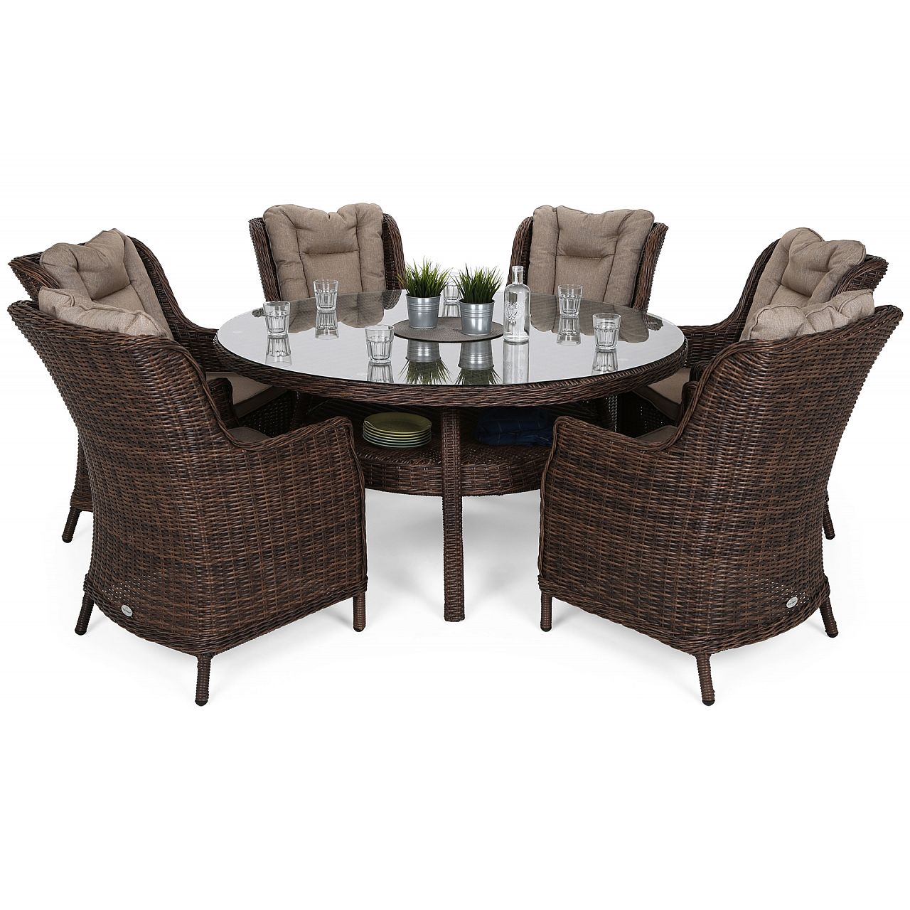 Bristol Round Elegant 150 см - відмінний варіант для тих, хто шукає набір садових меблів трохи компактнішого розміру. У комплект входять шість зручних крісел, м'які подушки і вишуканий столик. Набір виготовлений з комбінації техноратангу та алюмінію з порошковим покриттям, що гарантує, що він буде міцним і прослужить своєму власникові довгі роки. Скляна стільниця столу надає набору сучасний і універсальний вигляд.
