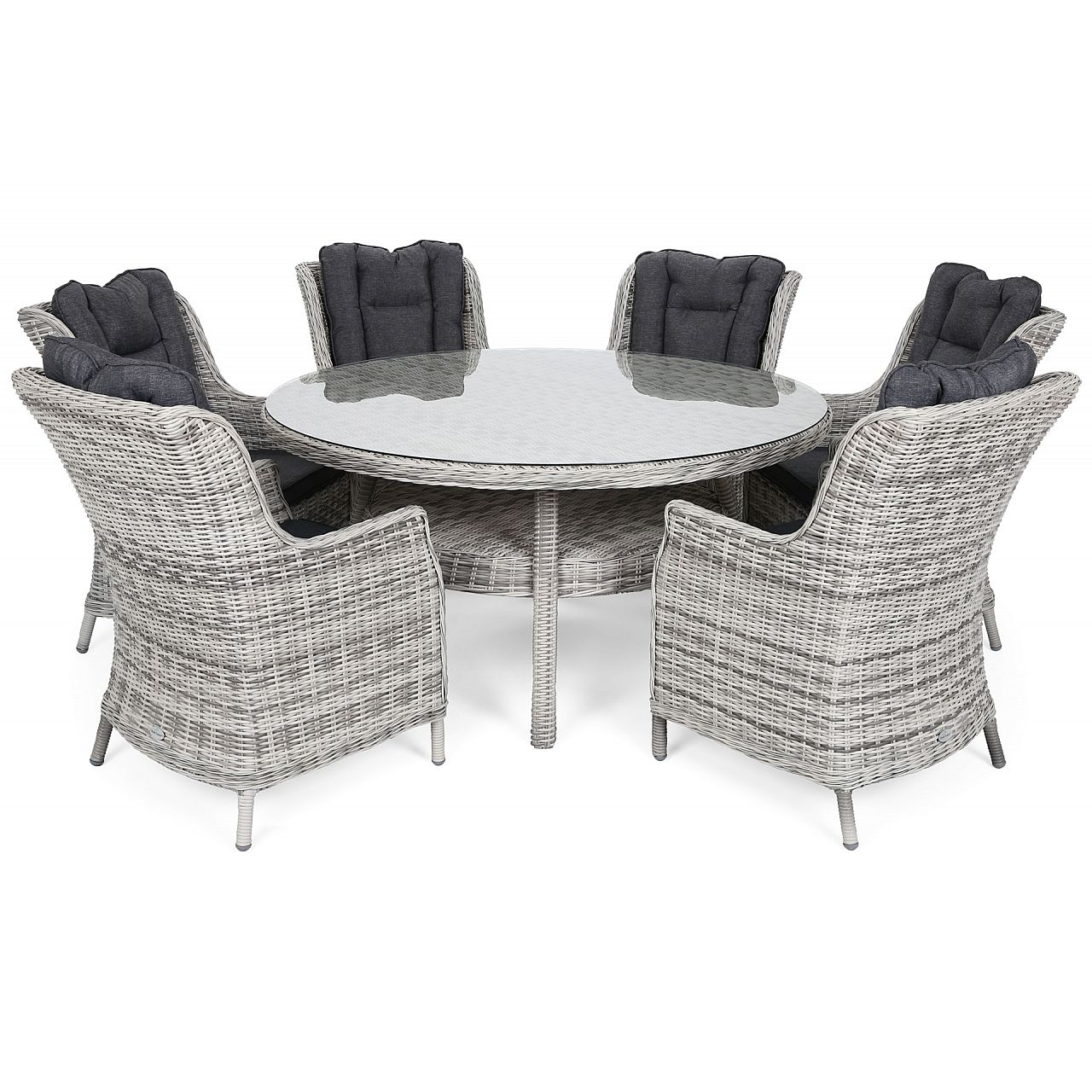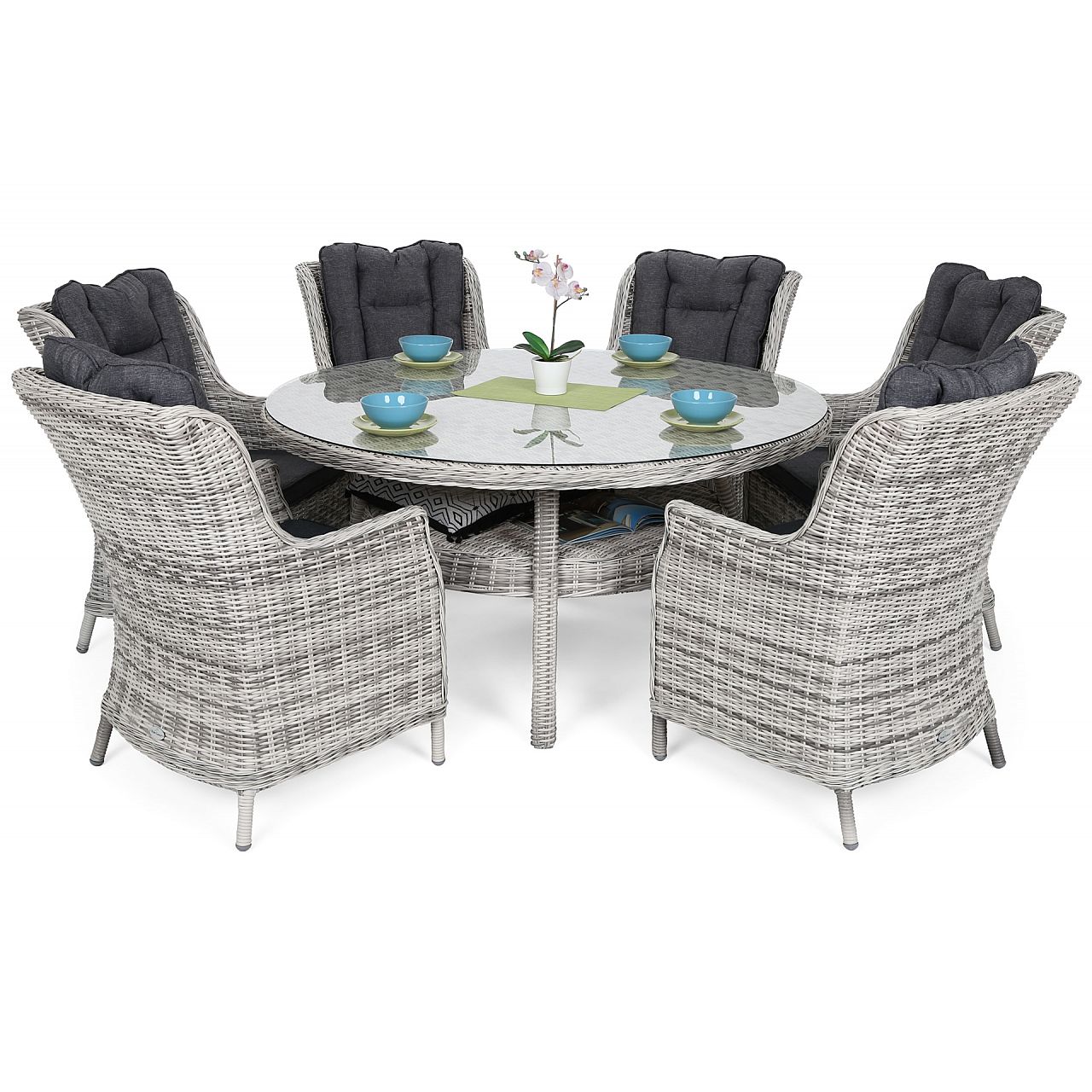 Bristol Round Elegant 150 см - відмінний варіант для тих, хто шукає набір садових меблів трохи компактнішого розміру. У комплект входять шість зручних крісел, м'які подушки і вишуканий столик. Набір виготовлений з комбінації техноратангу та алюмінію з порошковим покриттям, що гарантує, що він буде міцним і прослужить своєму власникові довгі роки. Скляна стільниця столу надає набору сучасний і універсальний вигляд.