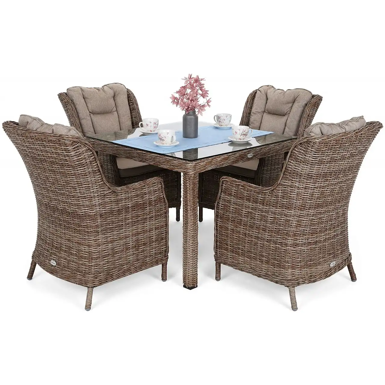 Садові меблі з технораттанга з колекції BRISTOL SQUARE - це надзвичайно зручний і водночас надзвичайно привабливий комплект, який забезпечить користувачам максимальний комфорт і оригінально прикрасить будь-яку елегантну терасу. Набір складається з квадратного столу з міцною стільницею із загартованого скла та 4 вражаюче зручних крісел, сидіння та спинка яких оснащені красиво стьобаними подушками. Це ідеальна пропозиція для всіх, хто шукає комфорт у найкращому стилі.