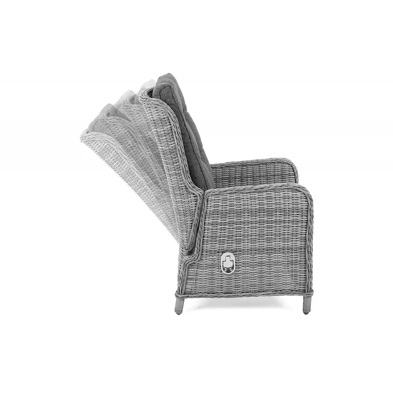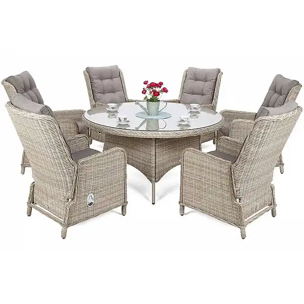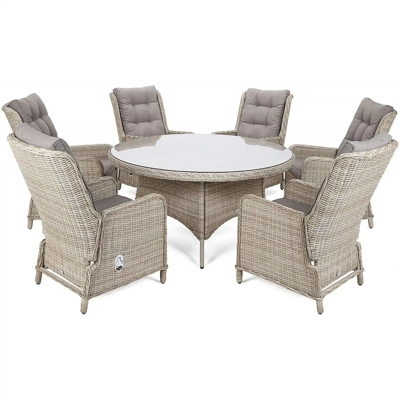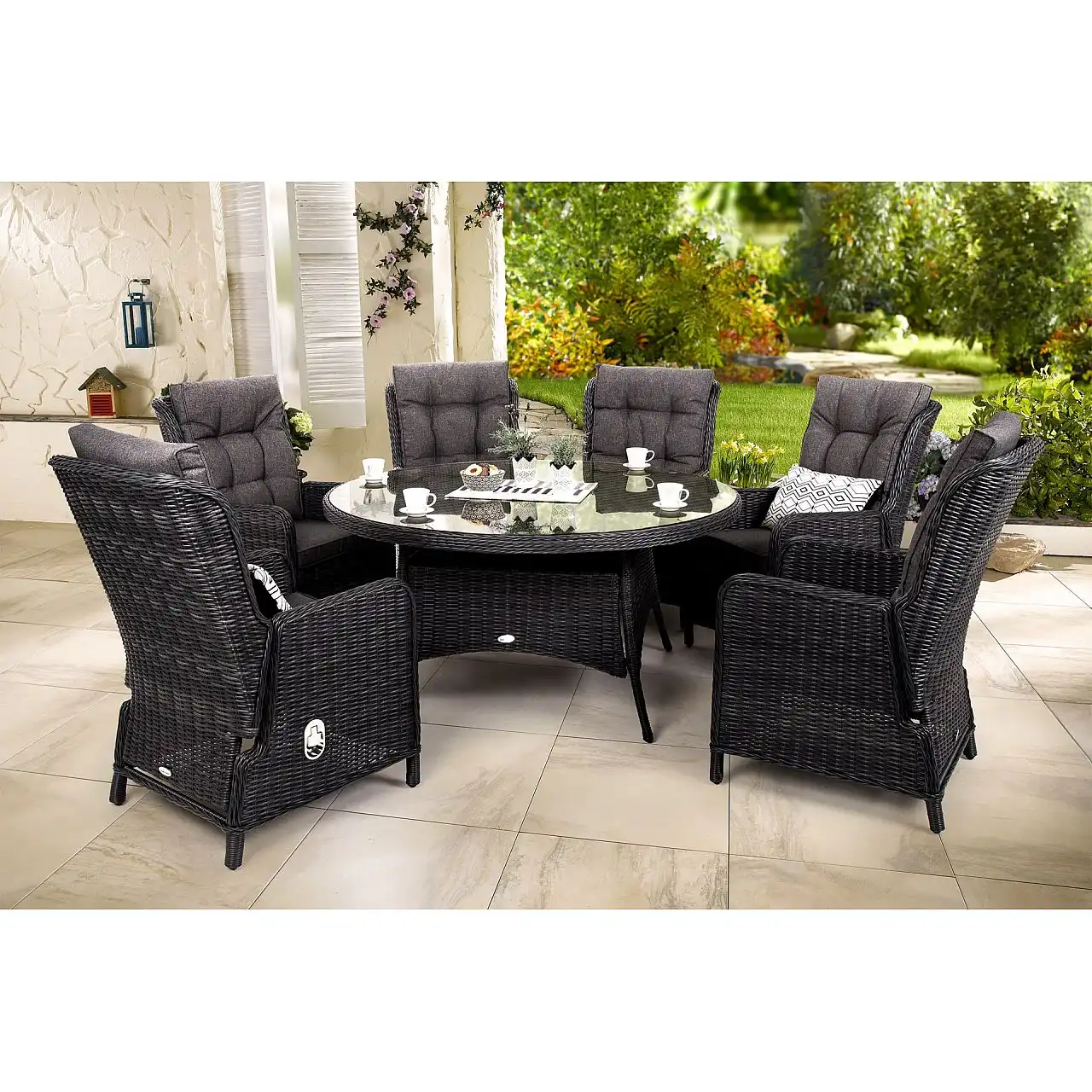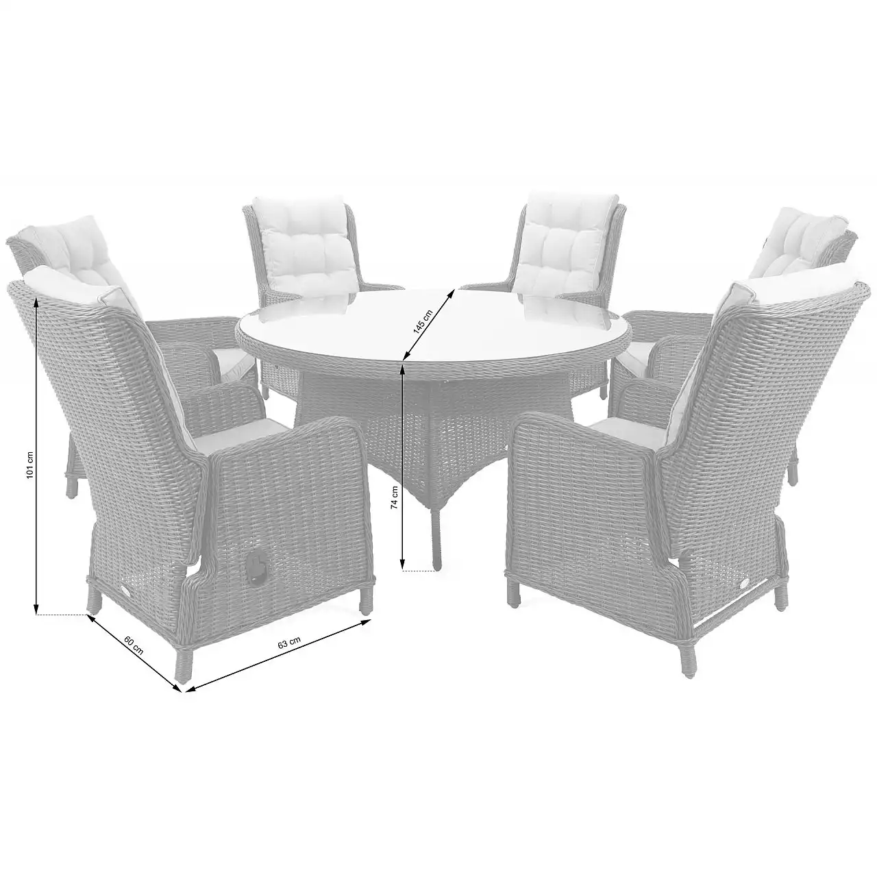 Шість зручних крісел, оснащених регульованою спинкою з важелем і товстими стьобаними подушками, забезпечують комфортний відпочинок і тривале сидіння в зручному положенні. Круглий, стильний стіл - це поєднання високоякісного техноратанга ручної роботи із загартованим склом товщиною 5 мм. Це не тільки ефектно виглядає, але і створює практичний і довговічний предмет меблів.