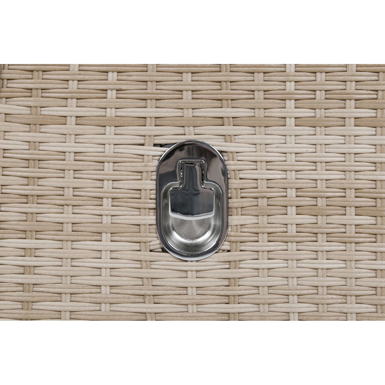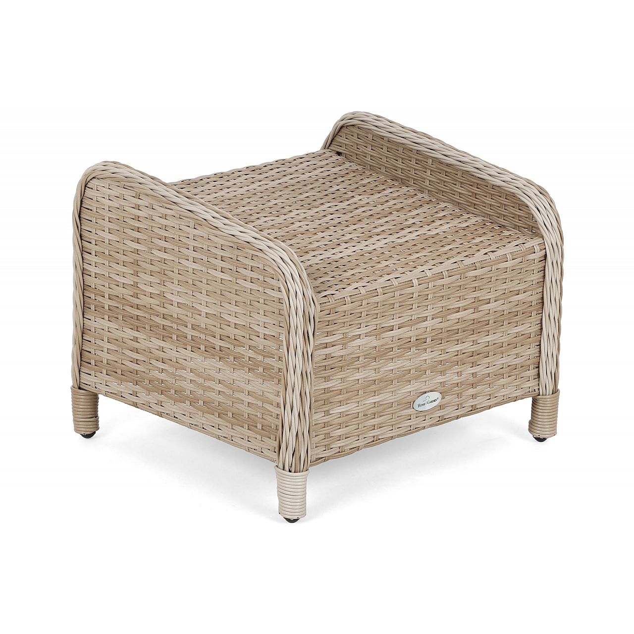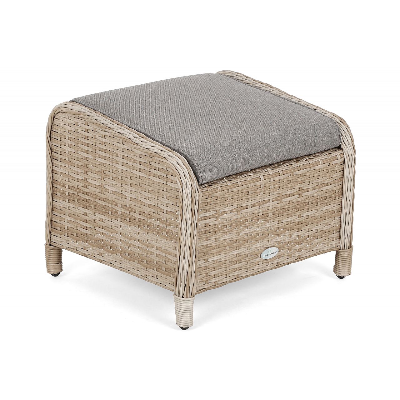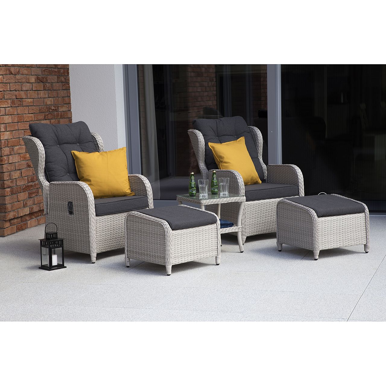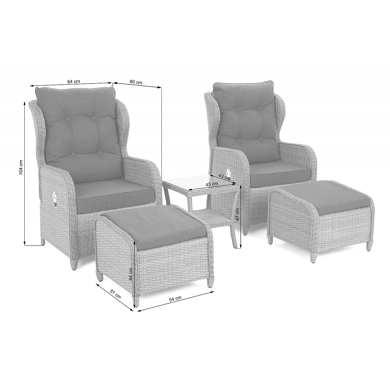 Комплект складається з двох зручних, надзвичайно містких крісел з регульованим нахилом спинки, двох підніжок (пуфів) і невеликого, але дуже функціонального столика. Меблі пропонують все необхідне для повноцінного відпочинку на терасі! Все це доповнюється приємними м’якими подушками на кріслах і підніжках.
