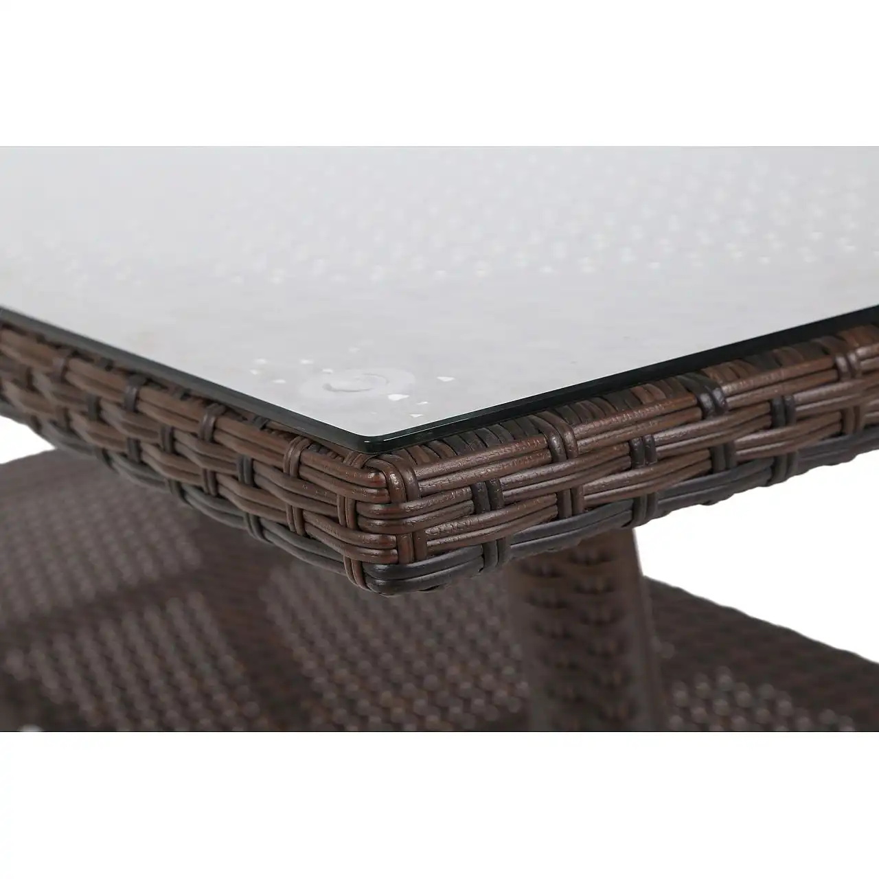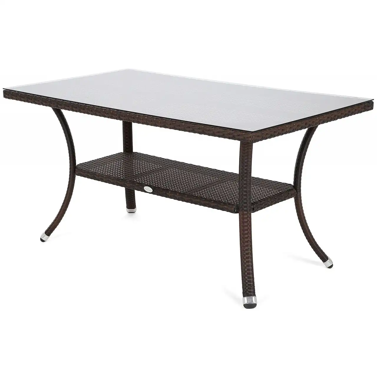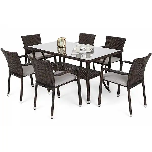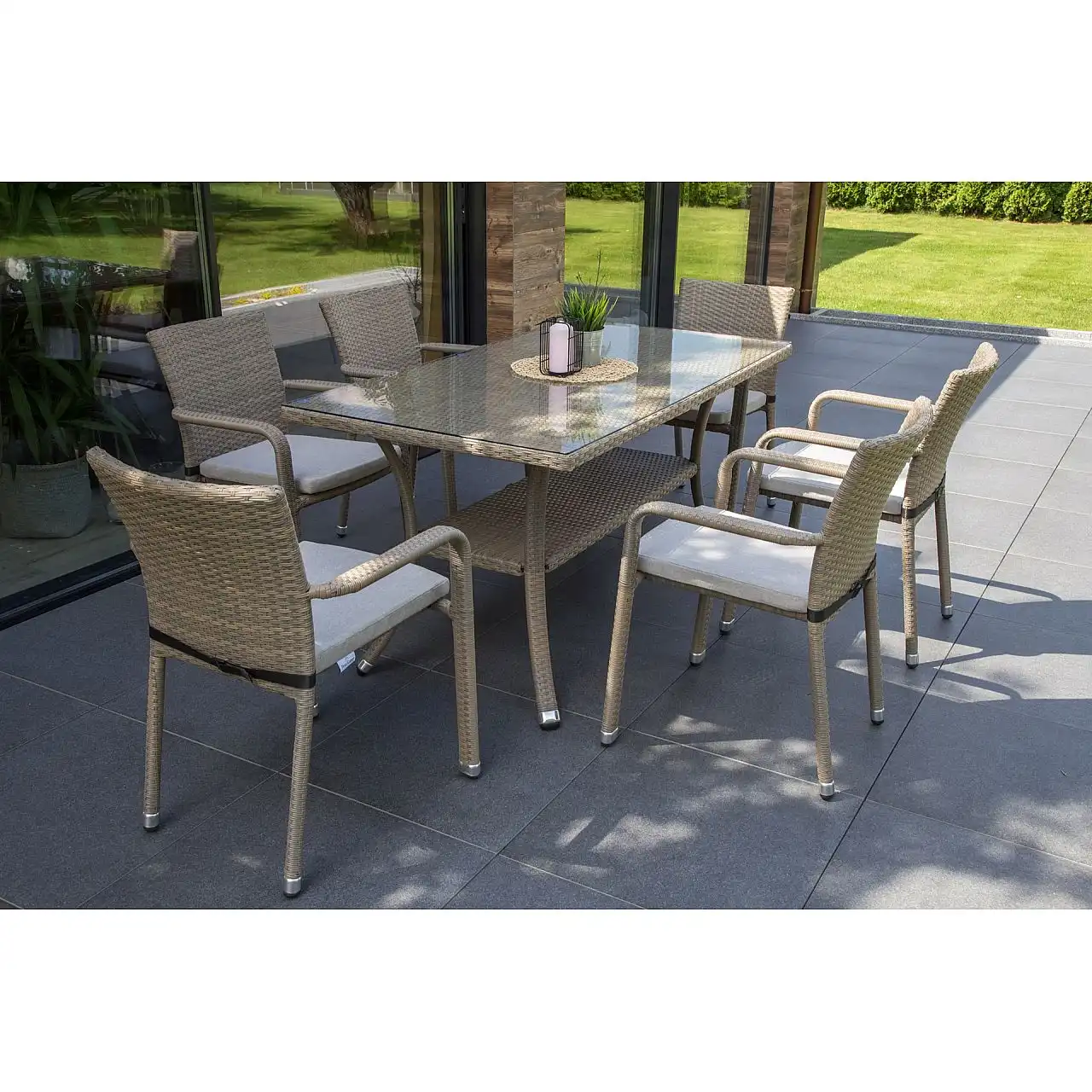 Елегантні садові меблі з техноротангу Sumba - ідеальна пропозиція для сімей, які люблять проводити час на свіжому повітрі, і для людей, які цінують садові зустрічі біля барбекю. Це рішення чудово виглядає на будь-якій терасі, незалежно від її сучасного чи класичного характеру. Комфортний набір на шість осіб складається з стійкого столу з товстим і міцним вікном із загартованого скла, за яким можна комфортно поїсти, випити кави або пограти з дітьми, а також 6 стільців зі зручними м'якими подушками та підлокітниками.