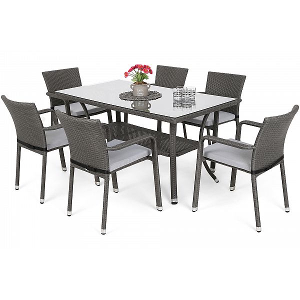 Елегантні садові меблі з техноротангу Sumba - ідеальна пропозиція для сімей, які люблять проводити час на свіжому повітрі, і для людей, які цінують садові зустрічі біля барбекю. Це рішення чудово виглядає на будь-якій терасі, незалежно від її сучасного чи класичного характеру. Комфортний набір на шість осіб складається з стійкого столу з товстим і міцним вікном із загартованого скла, за яким можна комфортно поїсти, випити кави або пограти з дітьми, а також 6 стільців зі зручними м'якими подушками та підлокітниками.