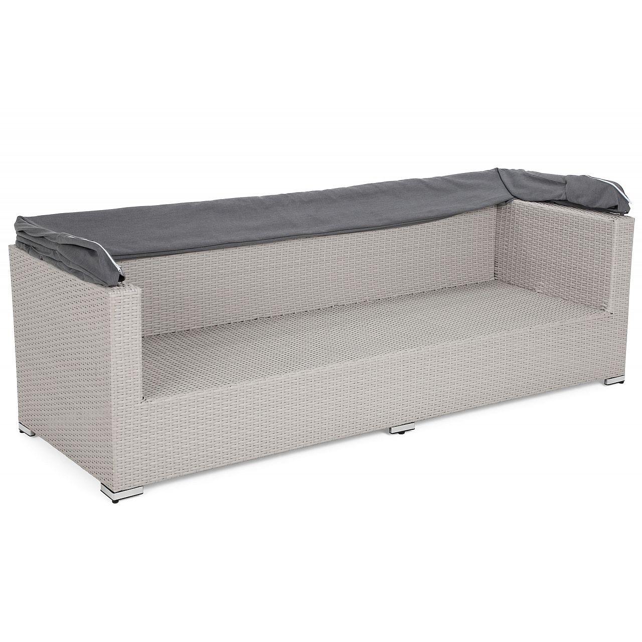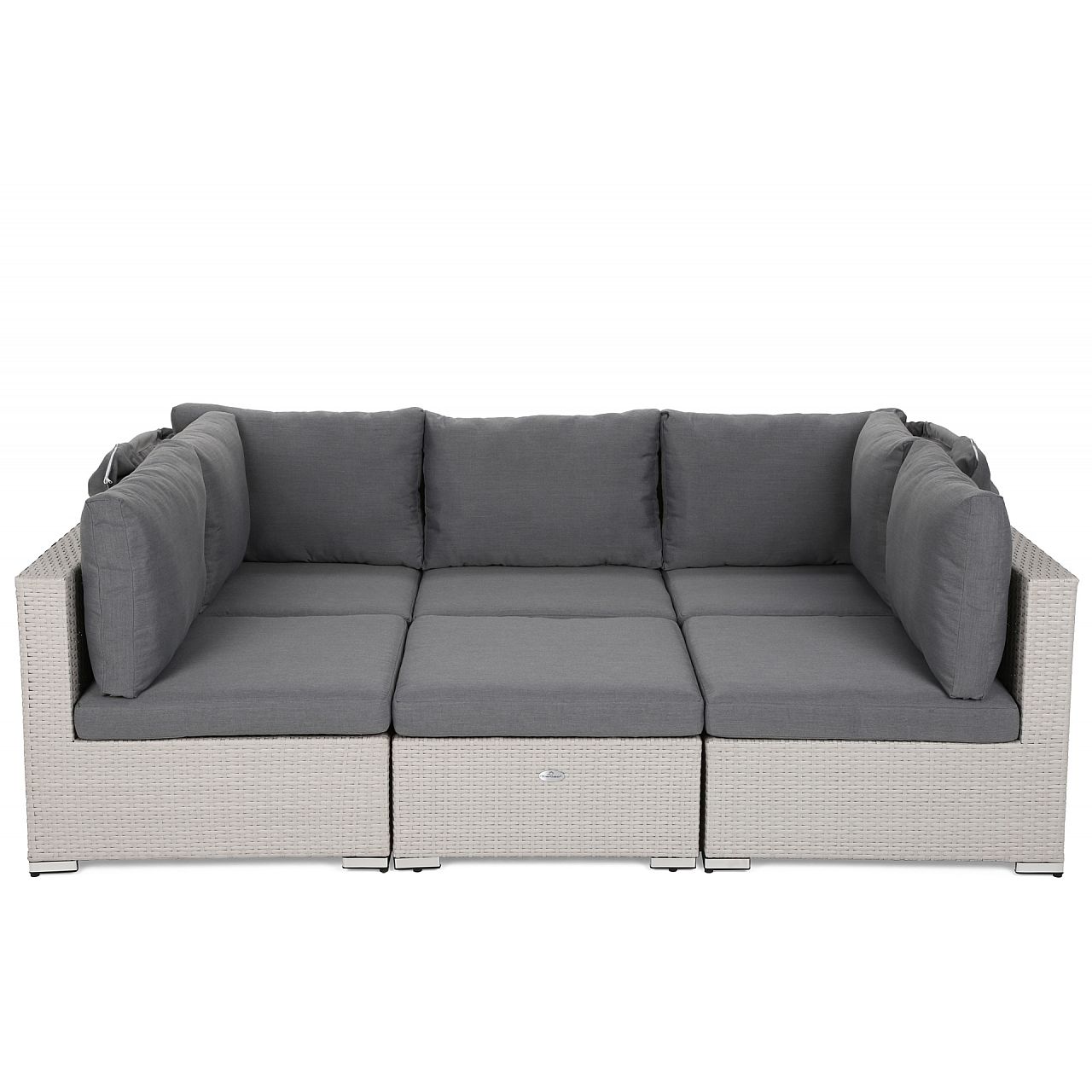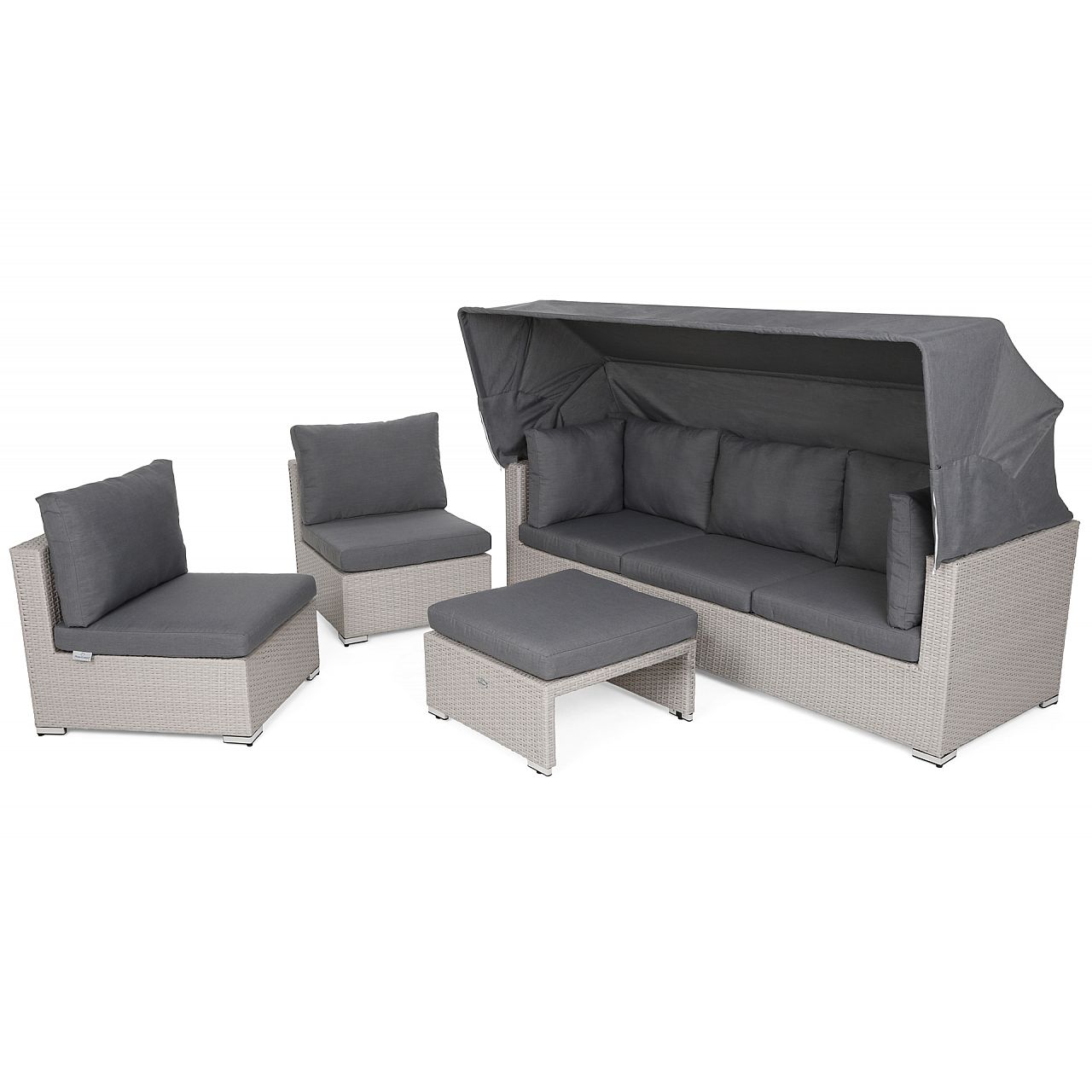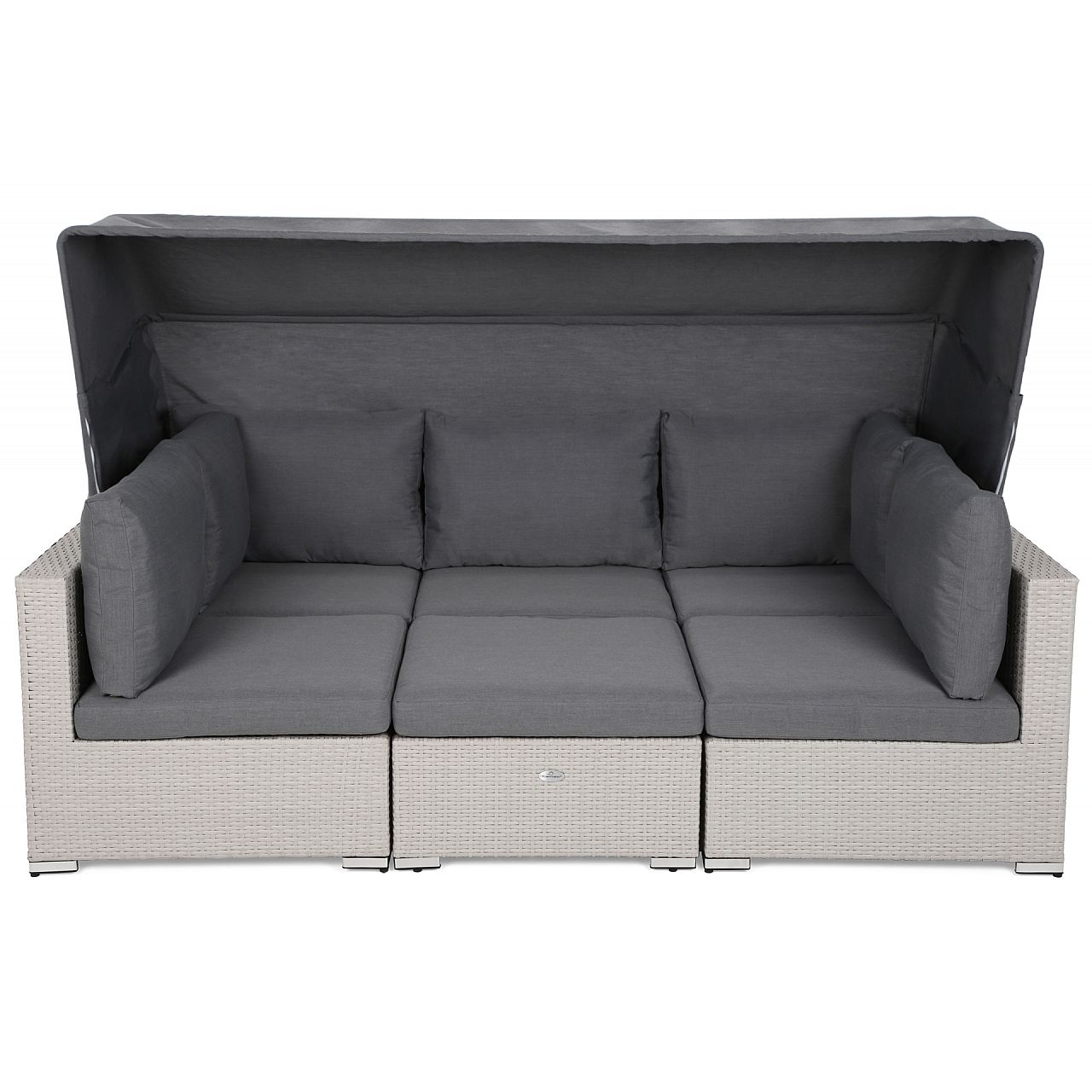 Vigo - оригінальний предмет садових меблів, що складається з сегментів: дивана з розкладним балдахіном, 2 додаткових спальних місць і столика, який також можна використовувати як пуф. Таким чином, це досить практичний набір, який пропонує місце для 6 осіб. Завдяки модульній конструкції його можна використовувати як кутовий диван або диван з додатковими одномісними місцями. Коли ви використовуєте деякі елементи на терасі, ви можете розмістити решту в іншому місці.
