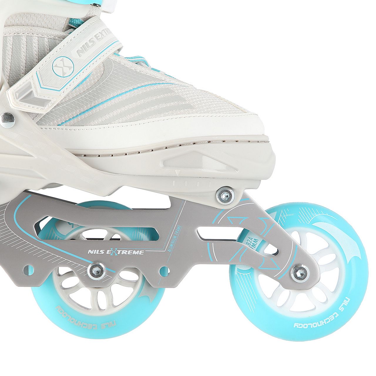 Використовуючи просту систему регулювання, ви можете легко і швидко підлаштувати розмір під ногу користувача. Оксамит, піна високої щільності, сітка та система вентиляції безпосередньо підвищують комфорт користувача. Ролик оснащений спеціальними алюмінієвими полозами. У свою чергу, великі колеса та підшипники ABEC 7 дозволяють знизити опір коченню. Якісні підшипники, особливо колеса з дуже великим діаметром, гарантують дуже швидку їзду.