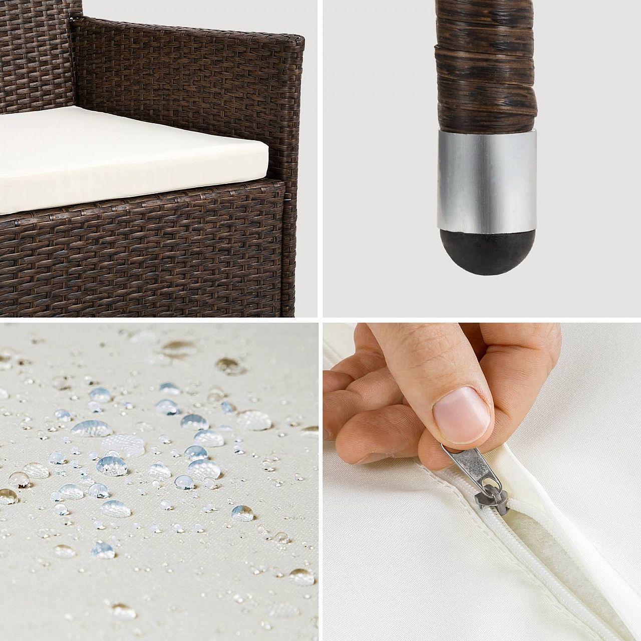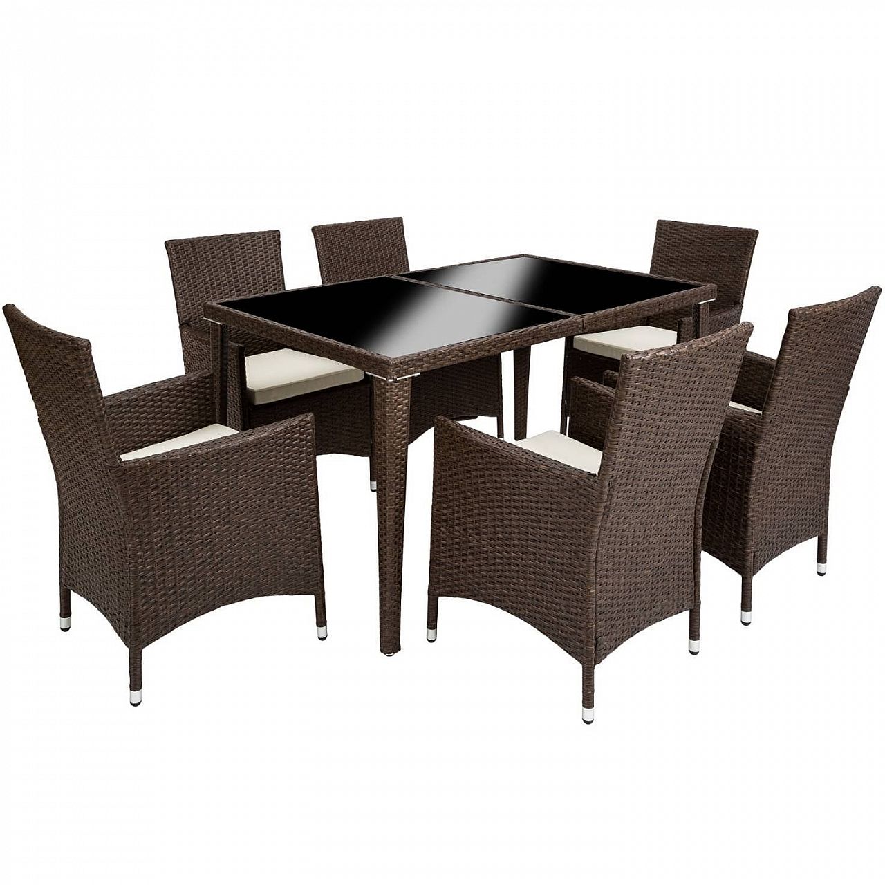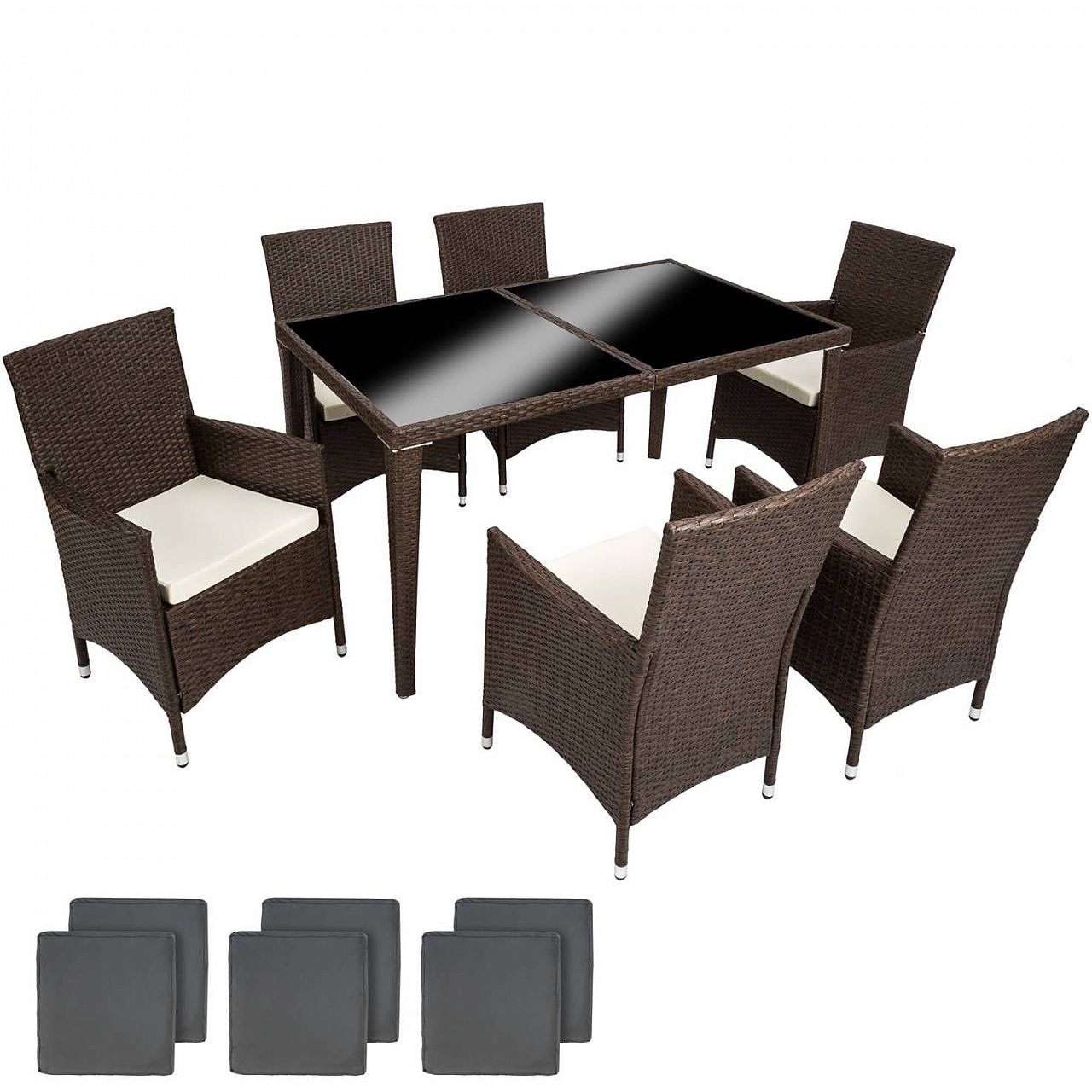 Чи то в саду, чи в приміщенні. Наш набір із поліраттану дуже універсальний. Зручні стільці та елегантний стіл ідеально підходять для чарівного годинника. Наш набір з ротанга не тільки виглядає красиво, але й стійкий до погодних умов, ультрафіолетового випромінювання та має тривалий термін служби. Міцний матеріал дозволяє меблям залишатися на вулиці протягом усього року - навіть у вітряні, дощові або снігові дні. Завдяки невеликій вазі меблі легко транспортуються. Поверхня столу із 3 скляними елементами виглядає дуже елегантно та легко миється. Дуже зручні бежеві сидіння з поліестеру поєднуються з кольором поліратанових меблів, ззаду застібаються на блискавку, тому ви можете легко чистити оббивку. Щоб захистити подушку від попадання вологи, поверхня чохлів була просочена, тому бруд та краплі води просто стікають униз.