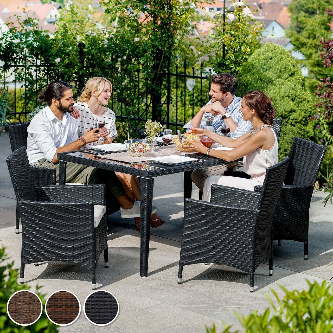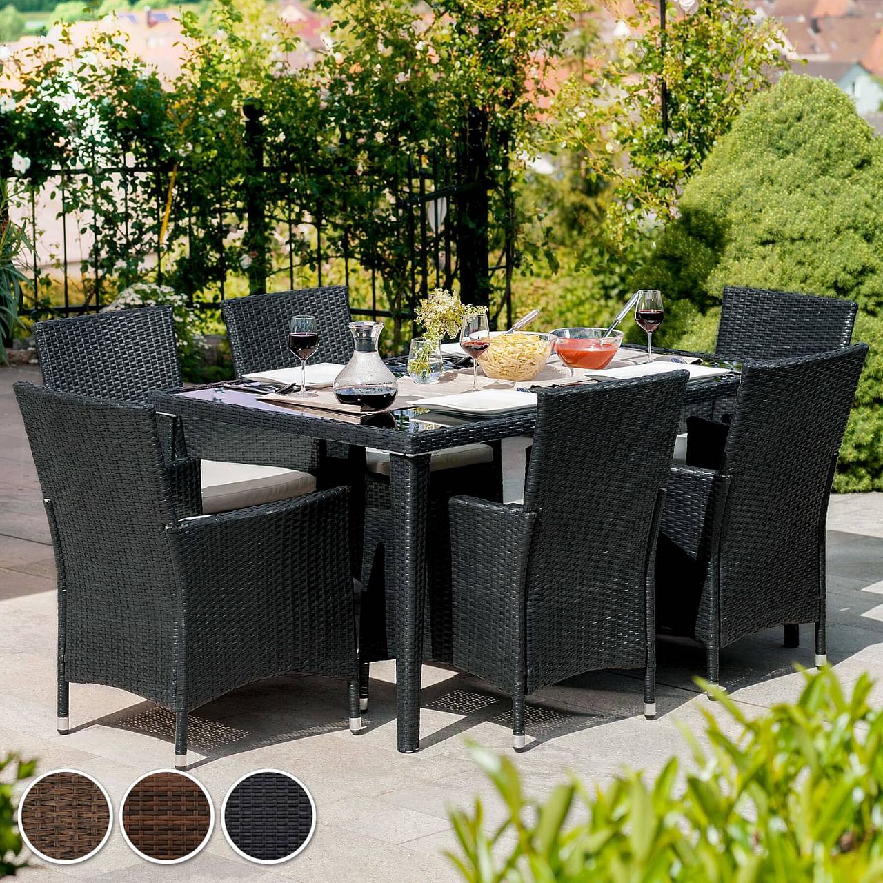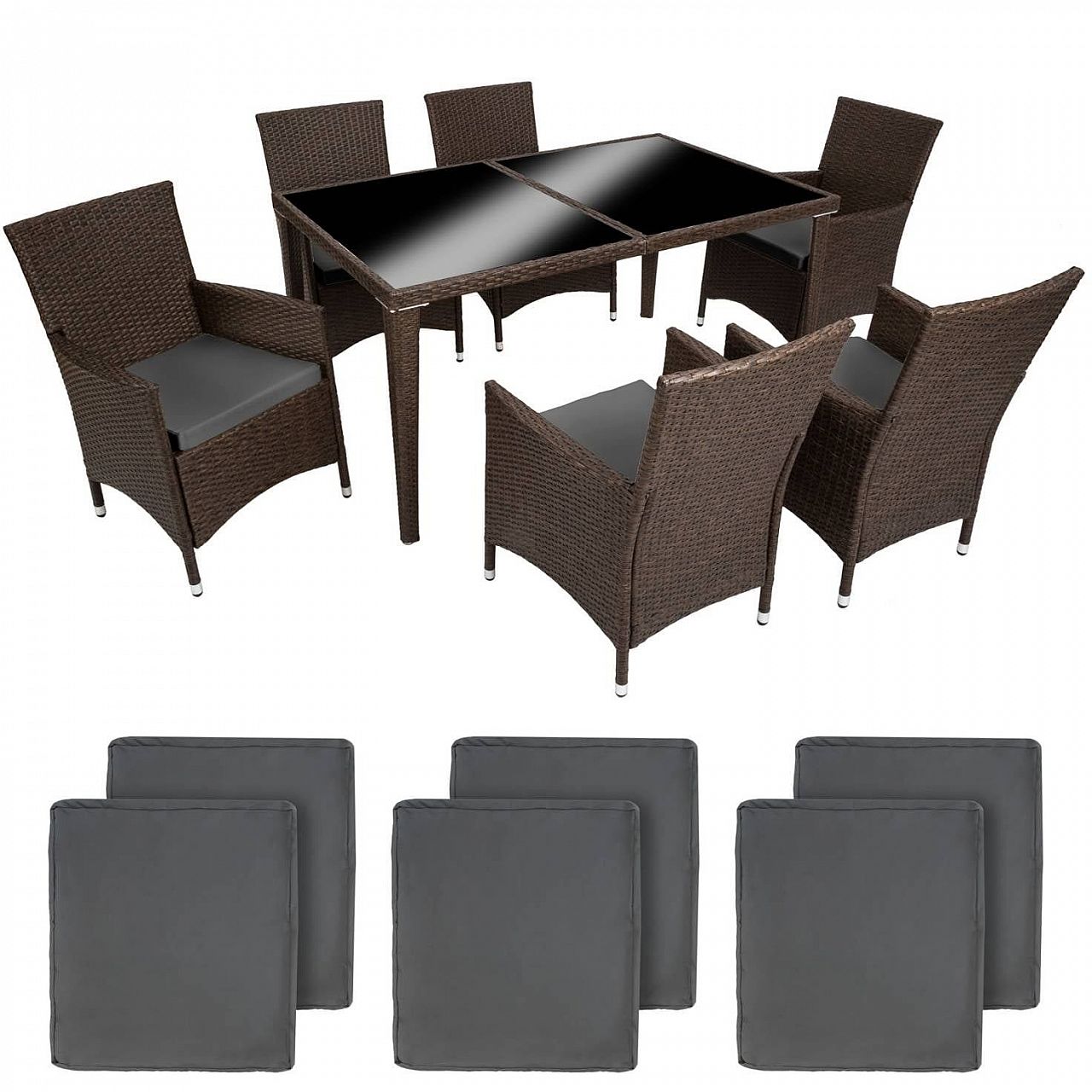 Чи то в саду, чи в приміщенні. Наш набір із поліраттану дуже універсальний. Зручні стільці та елегантний стіл ідеально підходять для чарівного годинника. Наш набір з ротанга не тільки виглядає красиво, але й стійкий до погодних умов, ультрафіолетового випромінювання та має тривалий термін служби. Міцний матеріал дозволяє меблям залишатися на вулиці протягом усього року - навіть у вітряні, дощові або снігові дні. Завдяки невеликій вазі меблі легко транспортуються. Поверхня столу із 3 скляними елементами виглядає дуже елегантно та легко миється. Дуже зручні бежеві сидіння з поліестеру поєднуються з кольором поліратанових меблів, ззаду застібаються на блискавку, тому ви можете легко чистити оббивку. Щоб захистити подушку від попадання вологи, поверхня чохлів була просочена, тому бруд та краплі води просто стікають униз.
