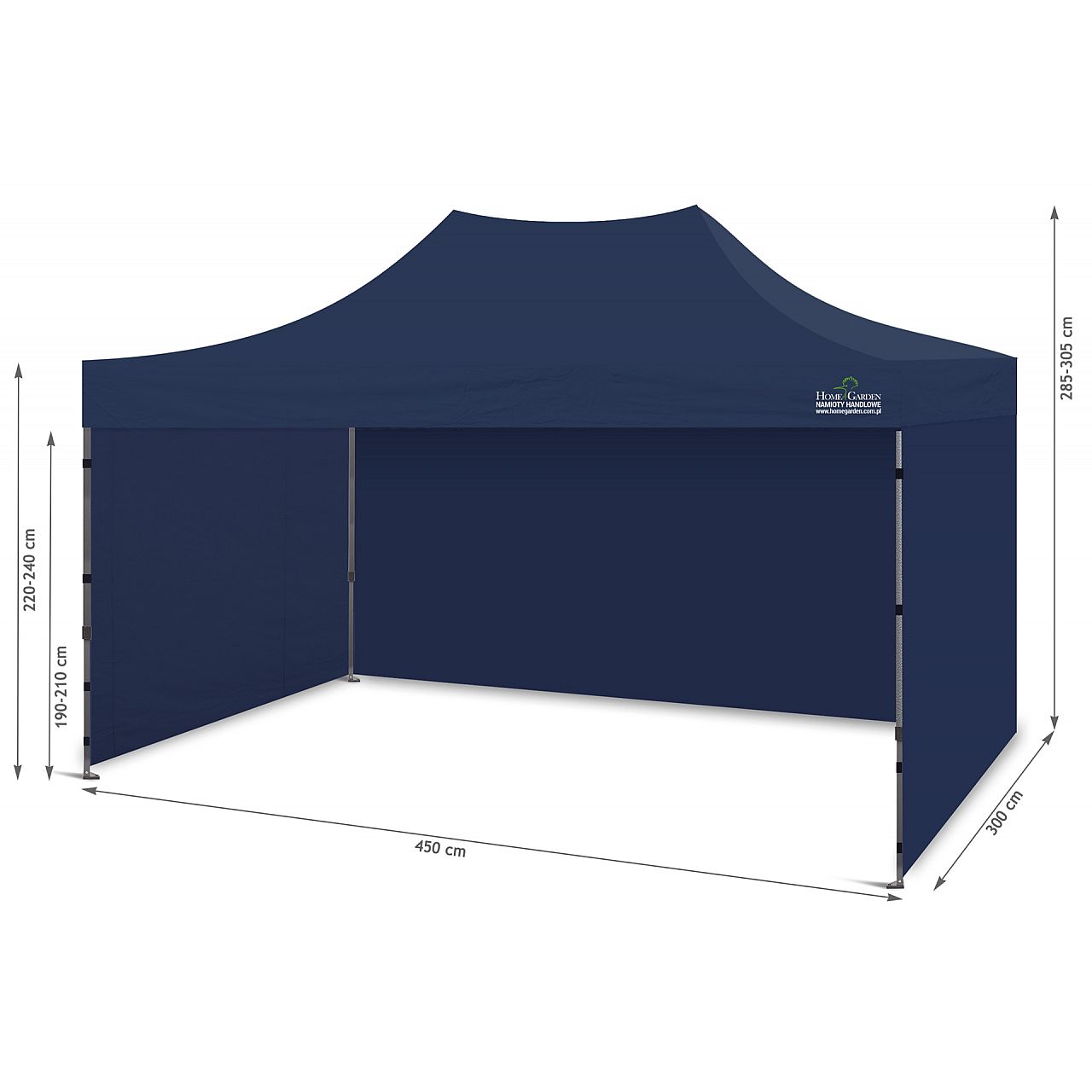 Експрес- торговий намет 450 x 300 см. Намет підходить для торгівлі та громадського харчування як дах для виставок, ярмаркових експозицій, захист від сонця та дощу, скрізь, де нам потрібно покрити велику площу за короткий час. Конструкція каркаса дозволяє швидко зібрати намет за лічені хвилини. Каркас виготовлений з металевих профілів, пофарбованих високоякісною порошковою фарбою. Профілі, зібрані за допомогою міцних з'єднувачів ( 5-річна гарантія на з'єднувачі), оснащені системою легкого складання рами (ножицеподібна конструкція). Дах виготовлений з 300-грамового поліестеру, а стінки з поліестеру оснащені блискавкою, яка дозволяє з'єднувати їх між собою. Весь чохол намету прогумований, а шви вулканізовані, що гарантує 100% водонепроникність намету.