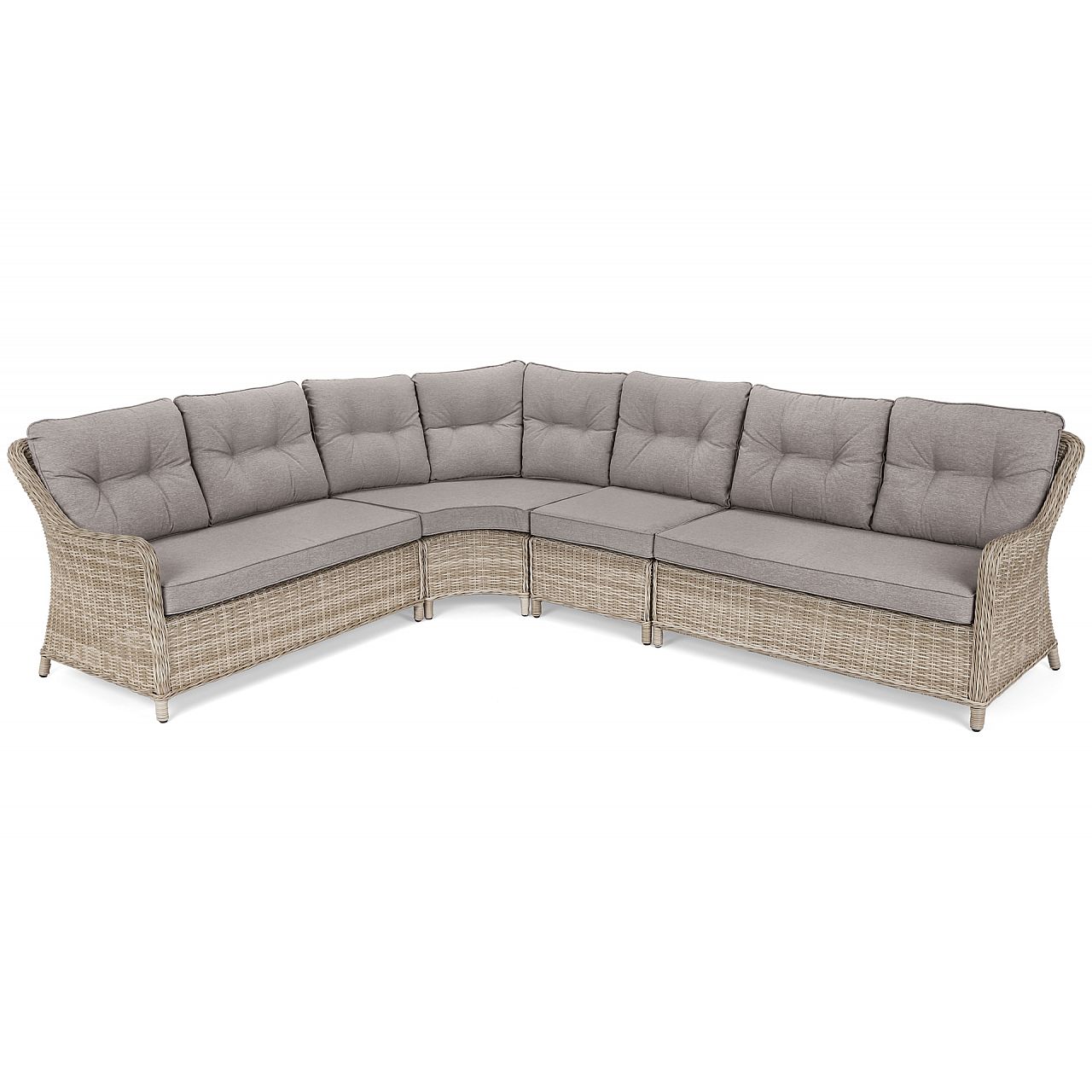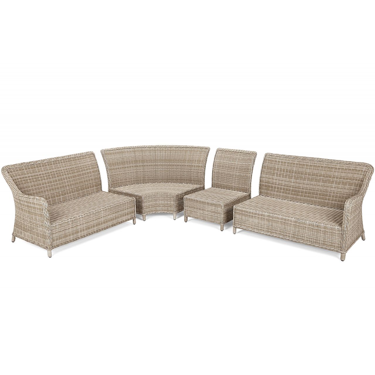 Windsor — чудовий вибір, якщо ви плануєте вечірку в саду для більшої кількості людей. Кутовий диван оснащений зручними великими подушками для сидіння та 8 меншими м’якими подушками для спинки. Кожен з них має знімний чохол, який можна прати. Такі ж подушки можна знайти на кожному з 4 крісел. Завдяки їм ми зможемо зручно розташуватися і насолодитися літнім сонцем з книгою чи холодним напоєм. Незважаючи на те, що весь комплект Windsor виглядає дуже легким і ніжним, його стійкість забезпечує міцний і міцний алюмінієвий каркас, прихований під елегантним техноротангом.