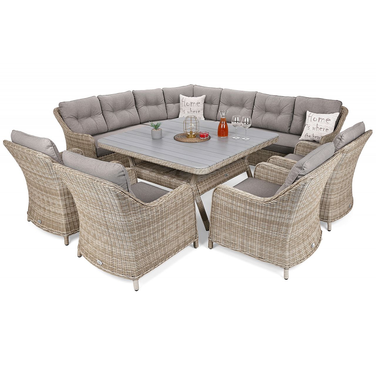 Недаремно назва комплекту садових меблів Windsor відноситься до відомої англійської династії, з якої походять члени королівської сім'ї. Віндзор теж справді королівський, призначений для найвибагливіших любителів садових зустрічей. Комплект забезпечує комфортний відпочинок до 11 осіб і складається з кутового дивана на 7 осіб та 4 крісел. Все це доповнює просторий квадратний стіл з елегантною і міцною стільницею з композитних дощок. Сірий колір стільниці ідеально поєднується з покриттям столу та всього комплекту техноротангом. Такий чохол зручний ще й тим, що матеріал стійкий до дощу, снігу чи сонячних променів, а якщо він забрудниться, його просто протріть вологою ганчіркою.