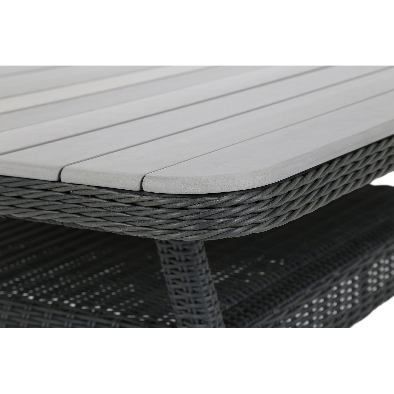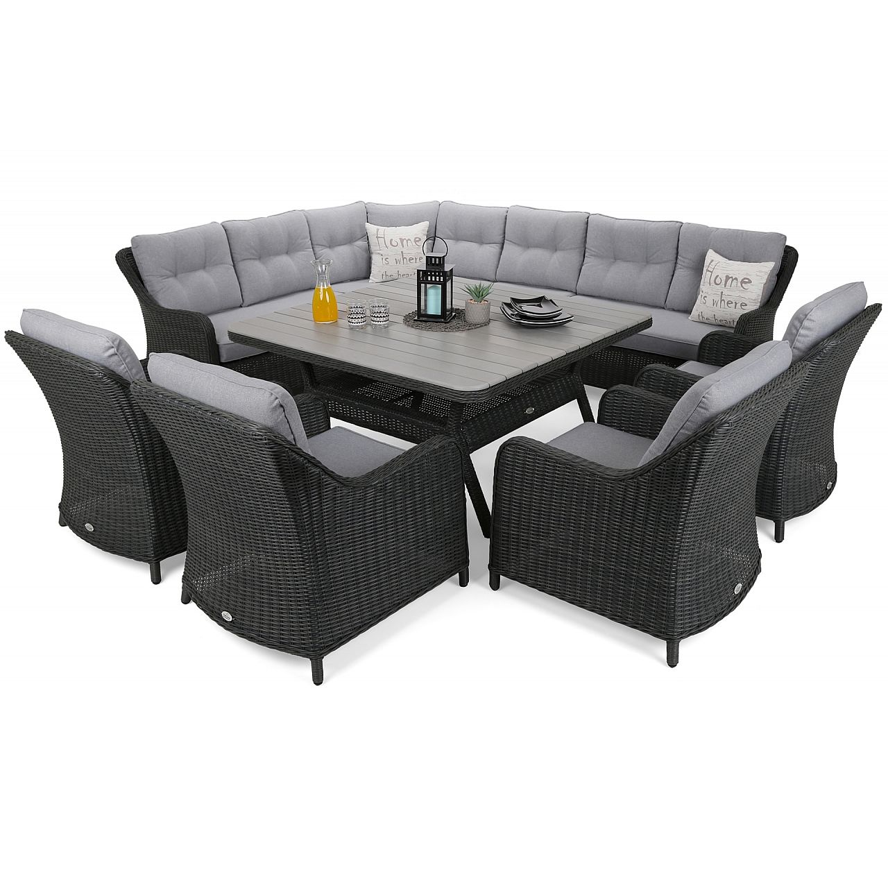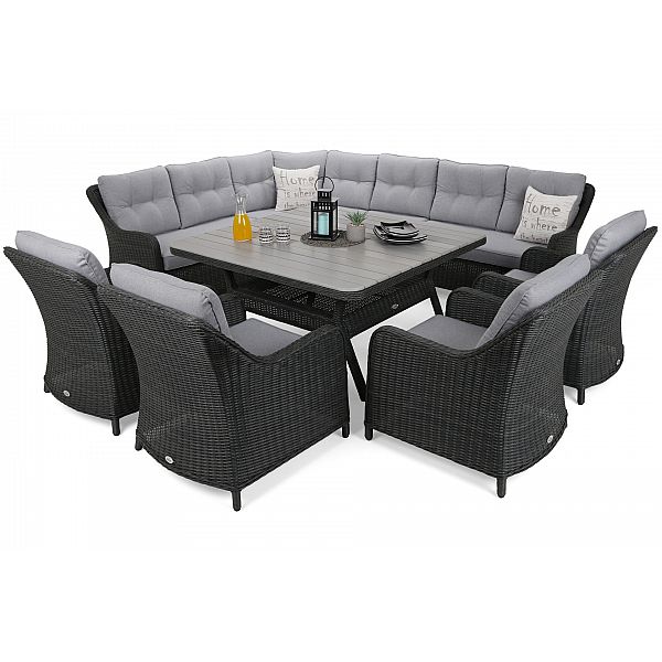 Недаремно назва комплекту садових меблів Windsor відноситься до відомої англійської династії, з якої походять члени королівської сім'ї. Віндзор теж справді королівський, призначений для найвибагливіших любителів садових зустрічей. Комплект забезпечує комфортний відпочинок до 11 осіб і складається з кутового дивана на 7 осіб та 4 крісел. Все це доповнює просторий квадратний стіл з елегантною і міцною стільницею з композитних дощок. Сірий колір стільниці ідеально поєднується з покриттям столу та всього комплекту техноротангом. Такий чохол зручний ще й тим, що матеріал стійкий до дощу, снігу чи сонячних променів, а якщо він забрудниться, його просто протріть вологою ганчіркою.