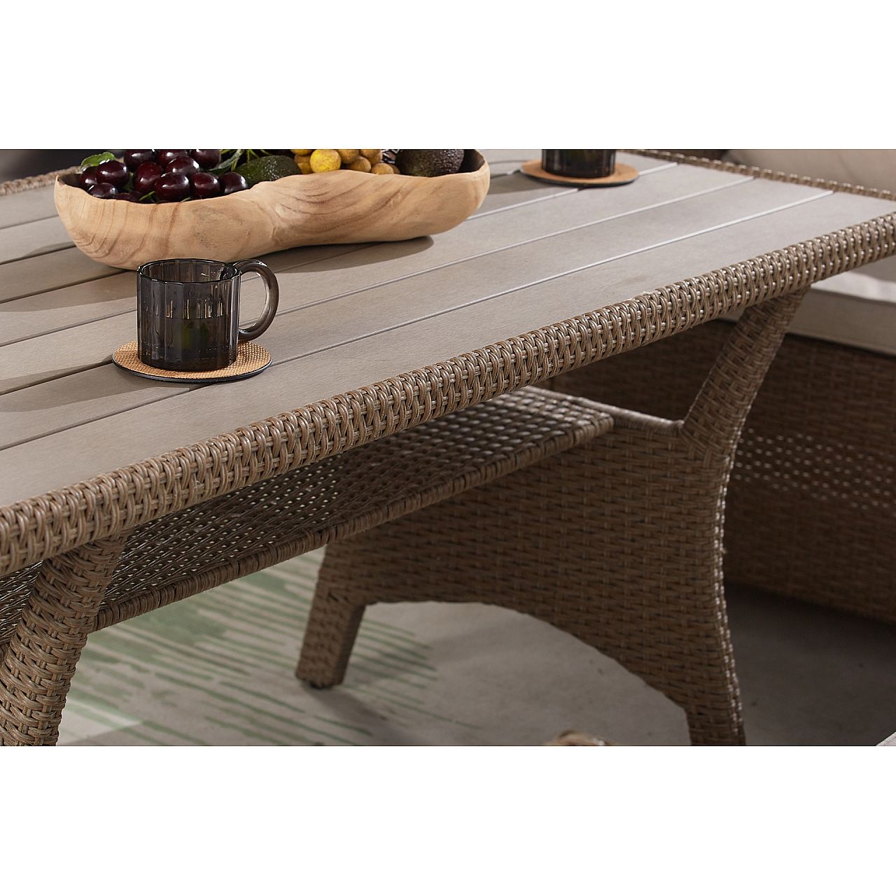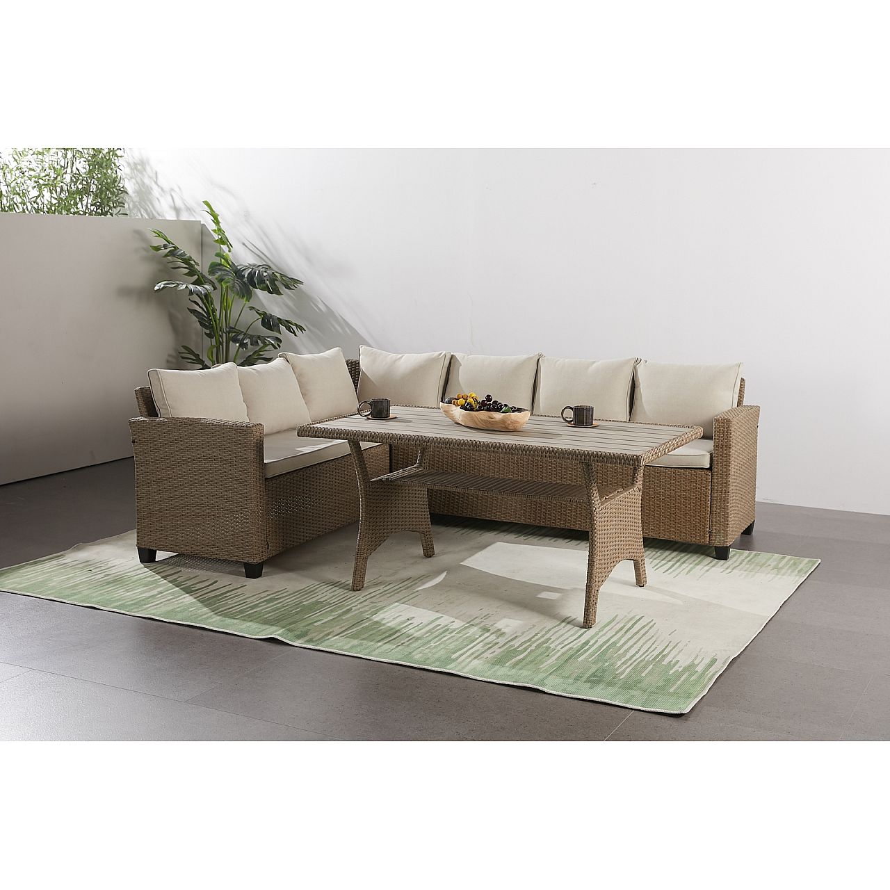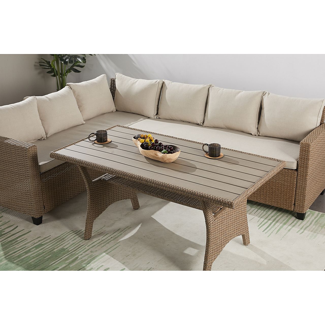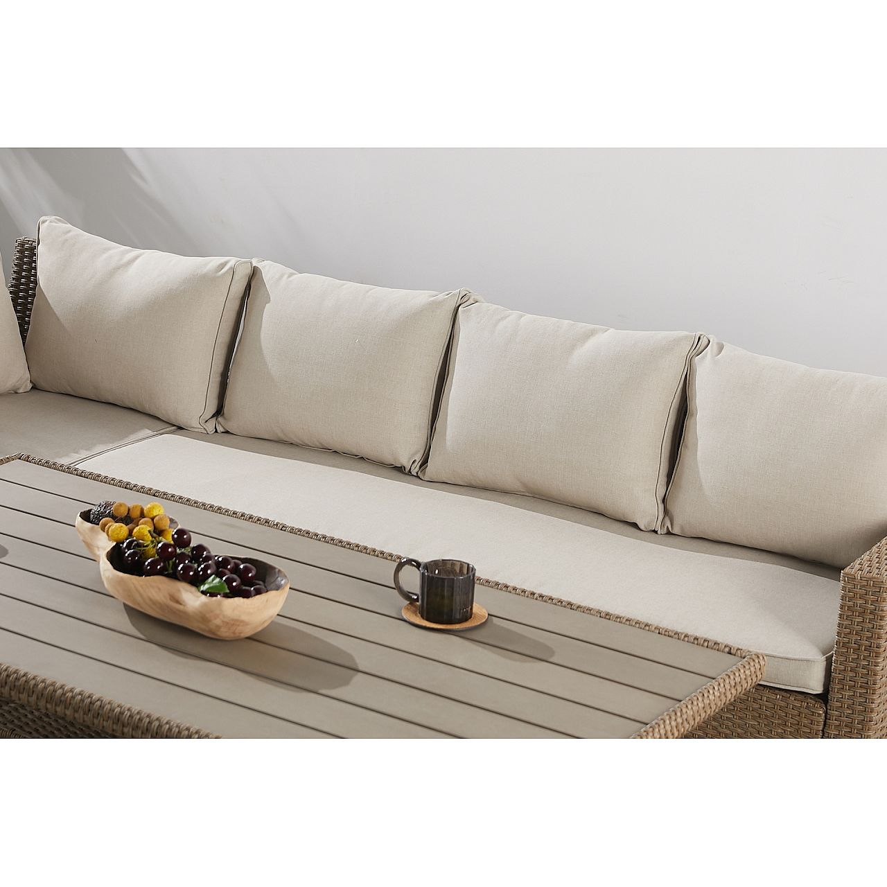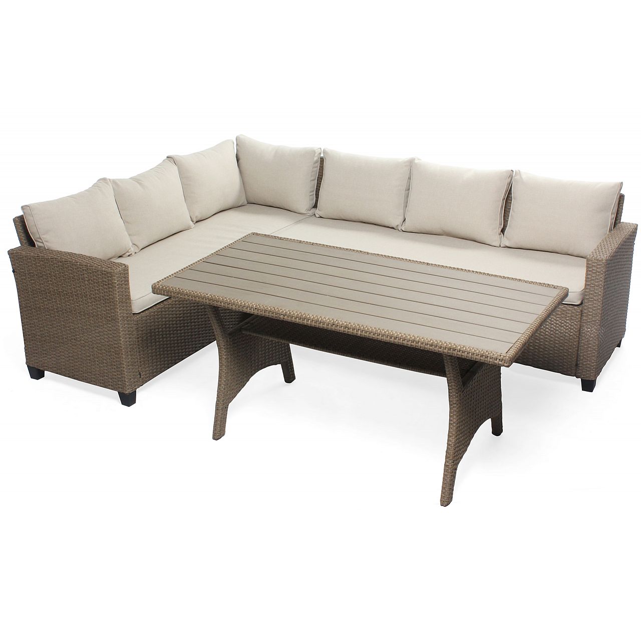 Садовий кутовий диван Lagos з техноратангу додасть шарму вашому саду, терасі чи патіо. Просторі сидіння можуть легко розмістити шістьох осіб, а м’які та елегантні подушки забезпечують комфортний відпочинок. Незважаючи на свої великі розміри, як стіл, так і окремі кутові сегменти дуже легкі. Комплект включає два сегменти кутового дивана, з яких правий важить 17,1 кг, а лівий — 19,4 кг, стіл вагою 18,5 кг та подушки. Загальна вага без упаковки становить 55 кг.
