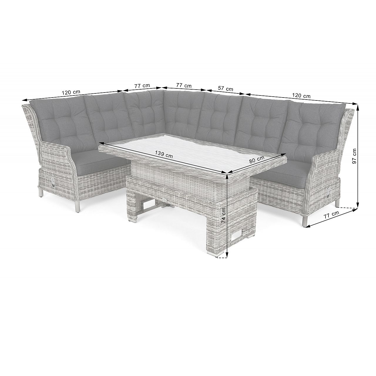 Розміри сегмента (ширина x глибина x висота) | лівий і правий сегменти 120 см x 77 см x 97 см, середній 57 см x 77 см x 97 см, кут 77 см x 77 см x 97 см |