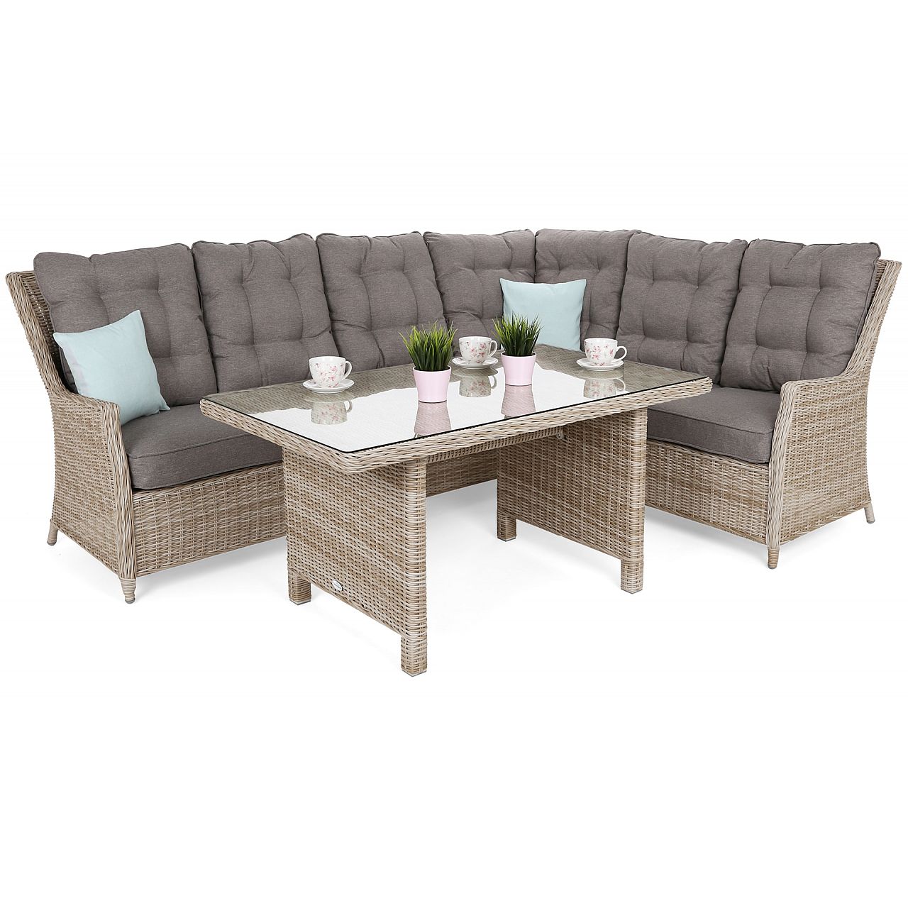 Кутовий диван Alicante техноротанг - садові меблі, на яких можуть розміститися до 6 осіб. Комплект складається зі столу та двох диванів, які створюють садовий куточок. Довговічність забезпечує алюмінієва конструкція з порошковим покриттям, вкрита техноратангом ручної роботи. Товсті подушки і високі спинки забезпечують комфорт використання. Подушки виготовлені з високоякісного поліестеру, який гарантує стійкість до несприятливих погодних умов. Застібка-блискавка, яка використовується в подушках, дозволяє швидко та легко знімати та чистити. Аліканте – це комфорт і найвища якість.