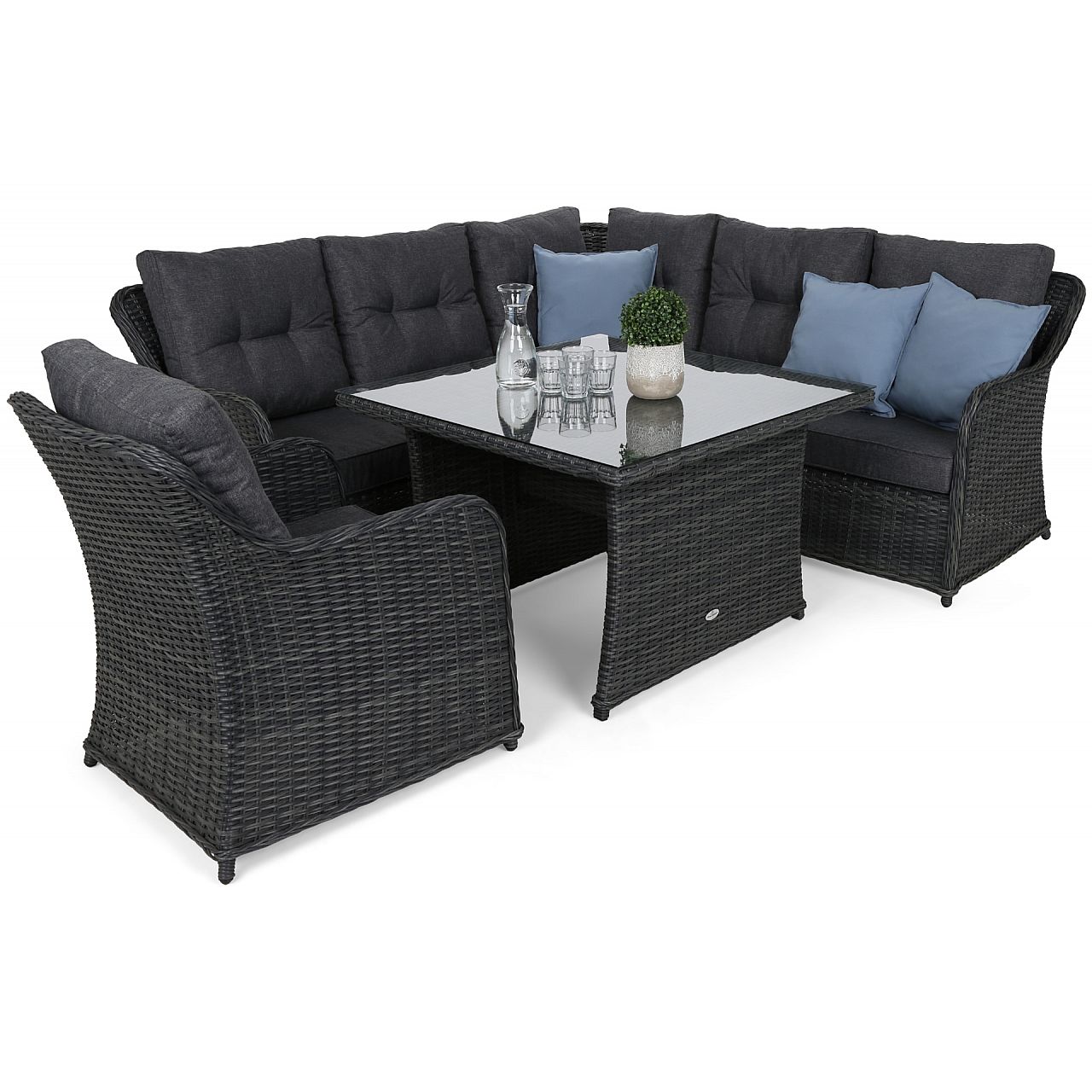 Набір садових меблів Bergamo grey надзвичайно міцний і стійкий до зовнішніх умов завдяки використанню високоякісного техноратанга, алюмінію та скла. Ці матеріали забезпечують стійкість меблів до різних погодних умов, що гарантує, що вони прослужать багато святкових сезонів у ідеальному стані. Завдяки використанню цих матеріалів садові меблі Bergamo grey надовго зберігають свій унікальний зовнішній вигляд.