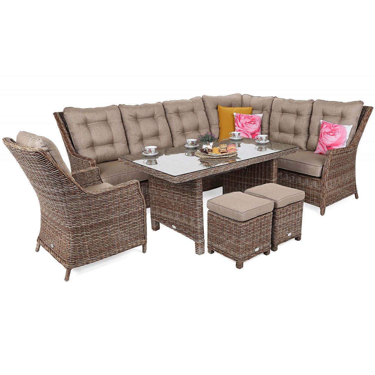 Кутовий набір садових меблів Alicante з пуфами - це садові меблі, які вміщають до 9 осіб. Комплект складається зі столу, крісла, двох пуфів і двох диванів, які створюють садовий куточок. Довговічність забезпечує алюмінієва конструкція з порошковим покриттям, вкрита техноротангом ручної роботи. Товсті подушки і високі спинки забезпечують комфорт використання. Подушки виготовлені з високоякісного поліестеру, який гарантує стійкість до несприятливих погодних умов. Застібка-блискавка, яка використовується в подушках, дозволяє швидко та легко знімати та чистити. Аліканте – це комфорт і найвища якість.