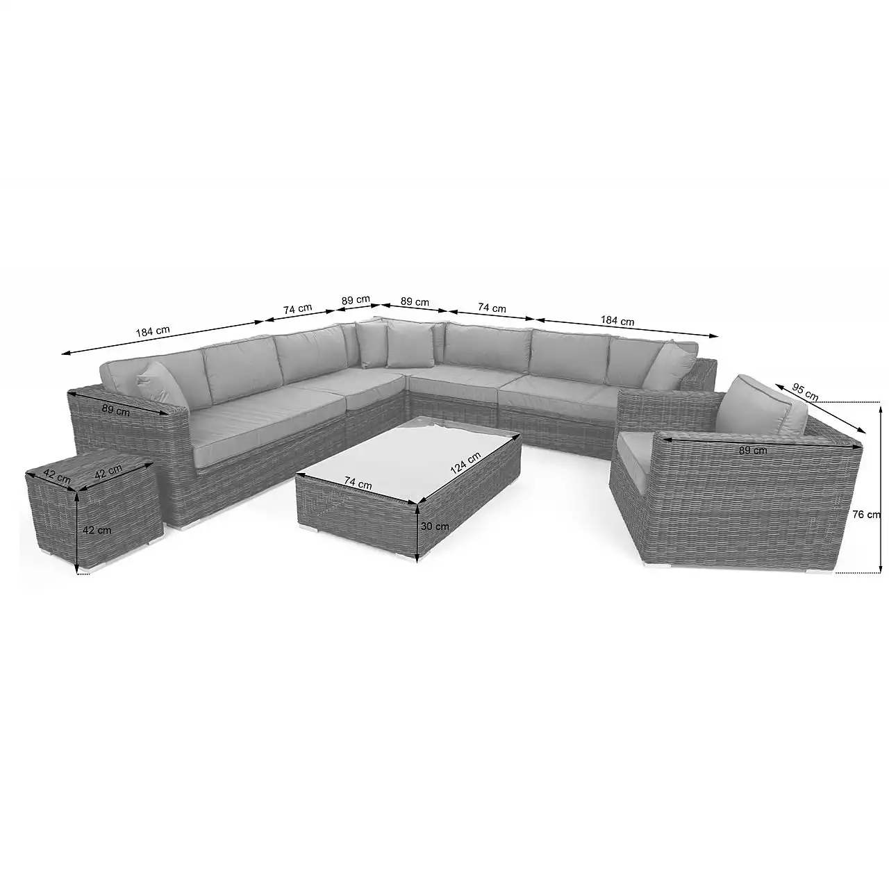 | Висота сидіння:всі елементи: 40 см, Подушки:Подушки на сидіння: 6 шт., Подушки на спинки: 9 шт., Декоративні подушки: 4 шт. | |