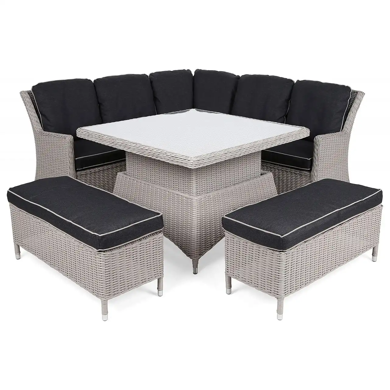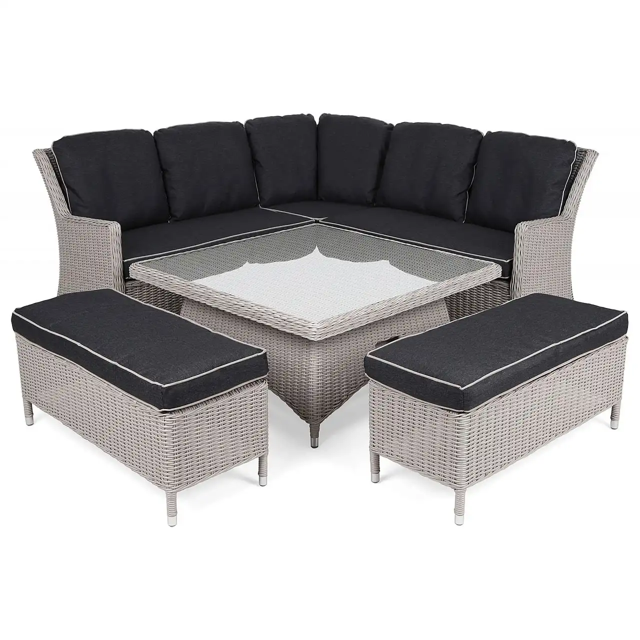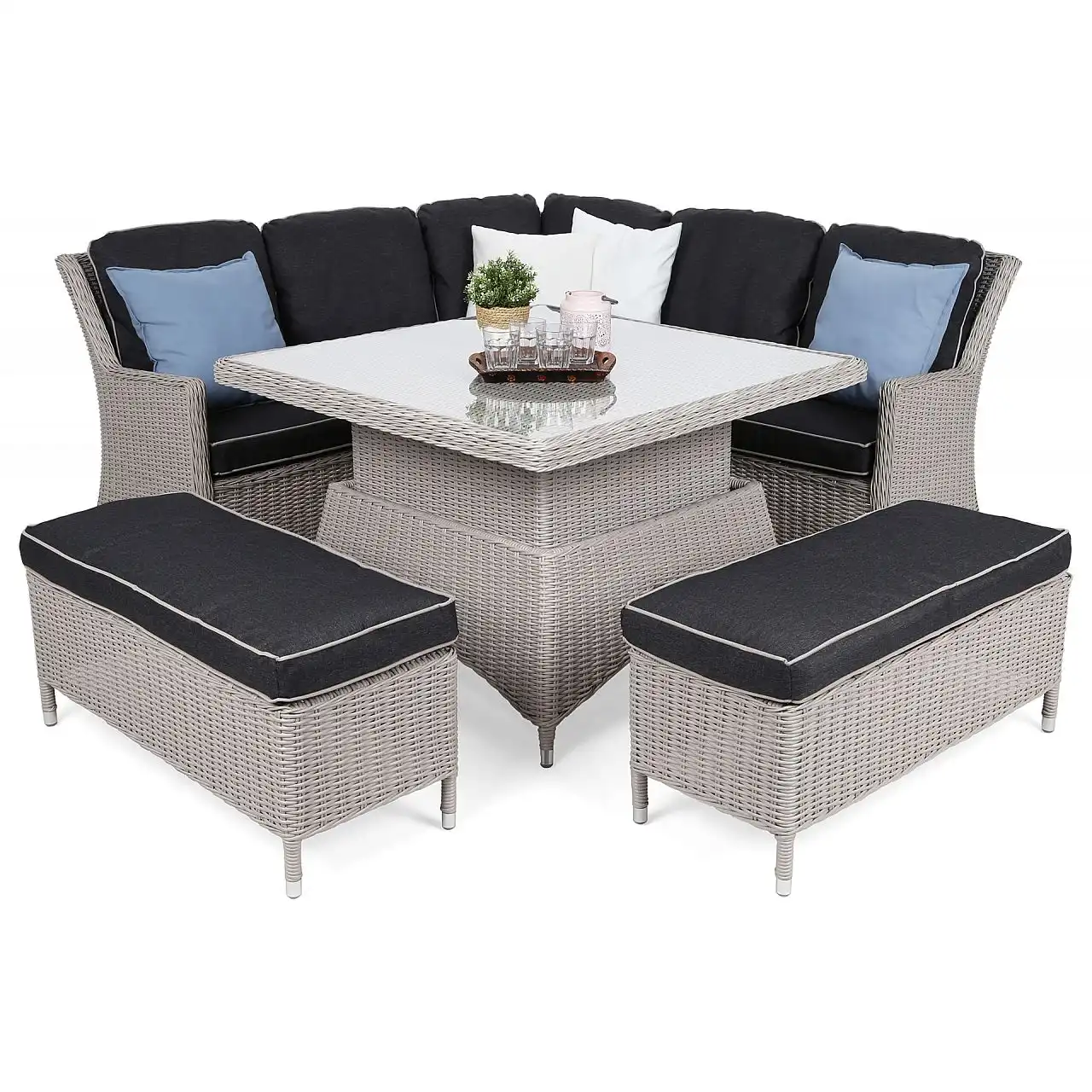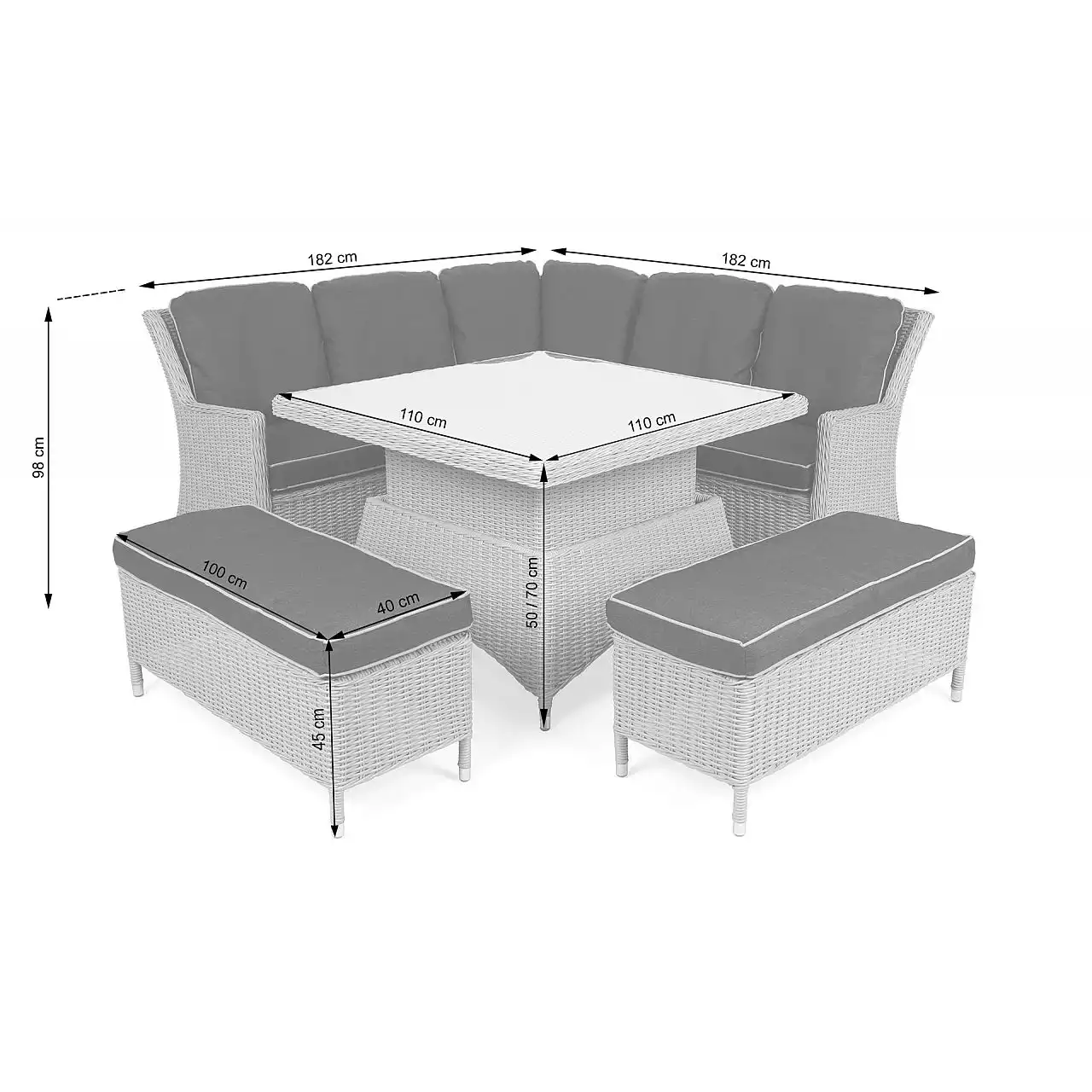Садові меблі Termoli grey можна розмістити на терасі або в просторій альтанці. У комплект входить кутовий диван зі зручною спинкою. Ви можете розмістити подушки на ньому та на двох лавах, щоб забезпечити комфортне сидіння.