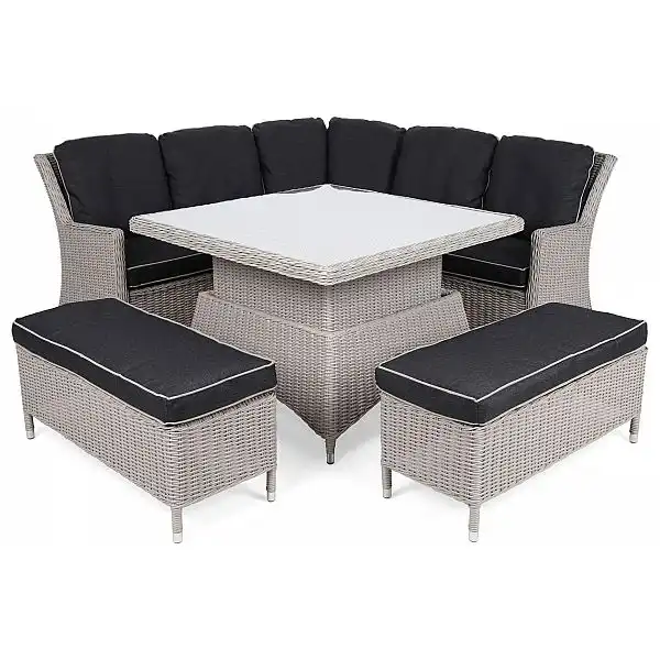 Комплект меблів Termoli розрахований на розміщення до 9 осіб. Сидіння обшиті подушками, завдяки чому ви будете насолоджуватися комфортом під час відпочинку на природі. У комплект входить кутовий диван, дві лавки і стіл з регульованою висотою. Елементи набору вирізняються позачасовим дизайном. Меблі будуть чудово виглядати на будь-якому відтінку фасаду.