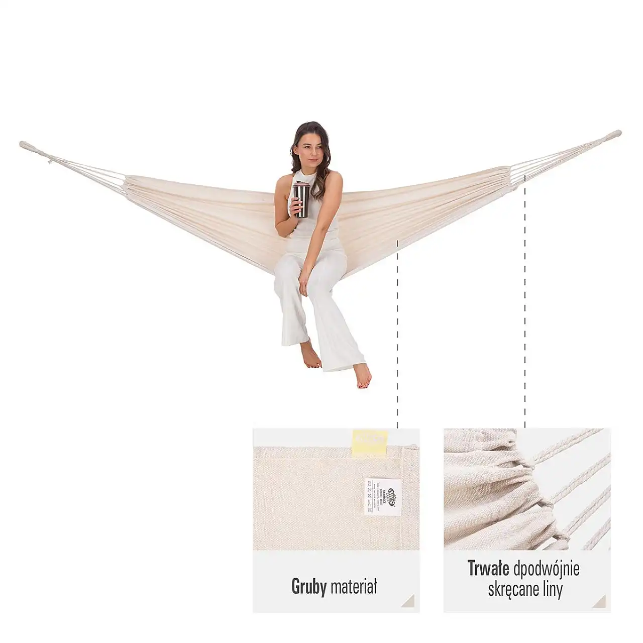Гамак NC0032 має товсте сплетення міцних мотузок, завдяки чому максимально допустиме навантаження становить 120 кг, що гарантує як міцність і безпеку, так і зручність і комфорт використання.