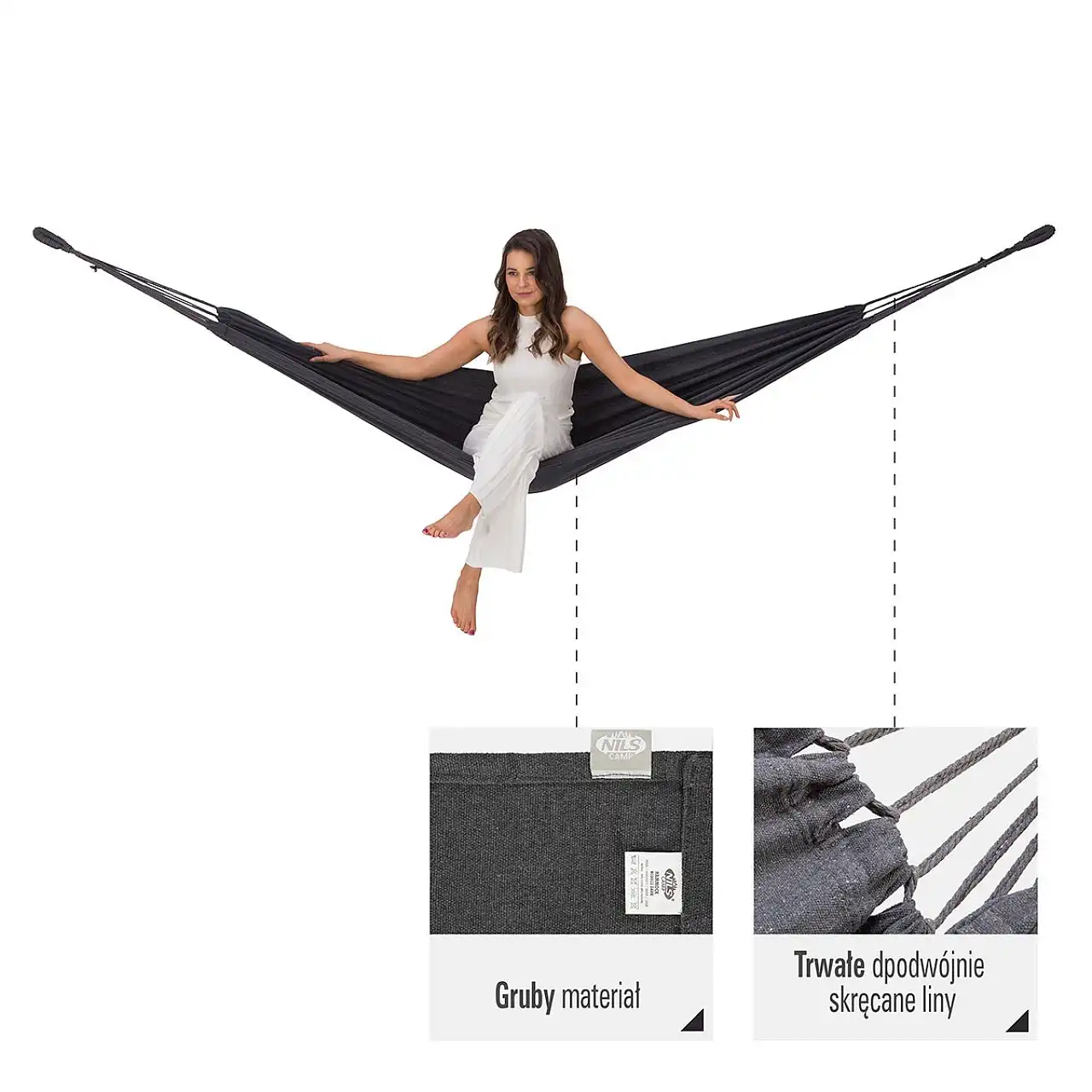 Гамак NC0032 від NILS CAMP - чудове рішення для тих, хто цінує відпочинок на свіжому повітрі в саду, лісі або на березі озера. Це гамак, призначений для підвішування між деревами або на каркасі.