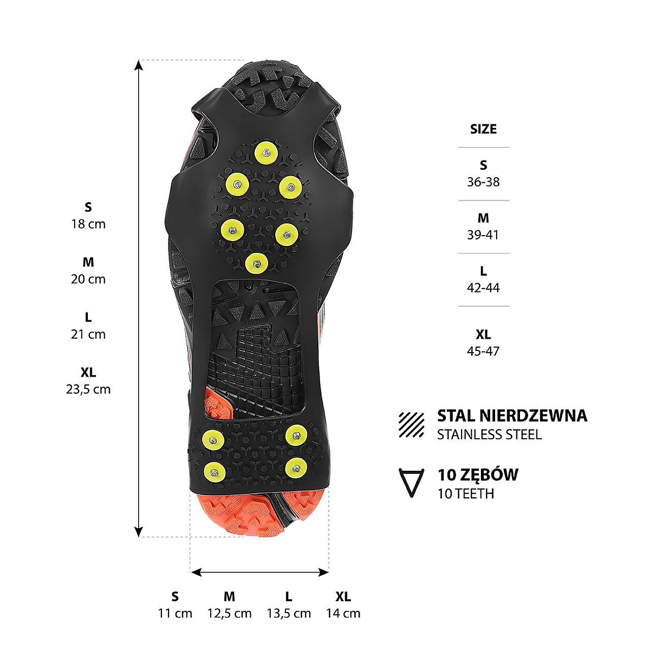 NC1702 має 10 зубів на дні з марганцевої сталі. Верхня частина накладок виготовлена з міцної та еластичної гуми, тому користувач може легко пристосувати їх до свого взуття.