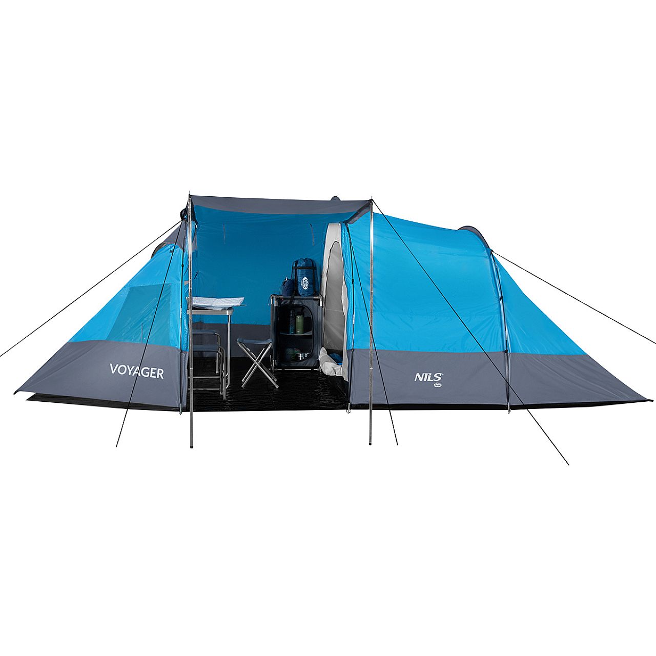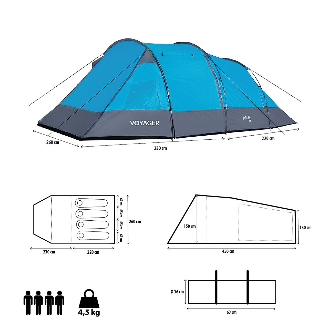 Туристичний намет Nils Camp NC3027 Voyager - найкраще рішення для любителів походів вихідного дня на озеро і тривалого відпочинку в кемпінгу. «Вояджер» — це двокорпусний намет з однією просторою спальнею на чотири людини та великим тамбуром із підлогою, де можна провести дощові вечори чи зберігати туристичне спорядження. У наметі можуть розміститися до чотирьох осіб, що робить його надзвичайно просторим і комфортним.