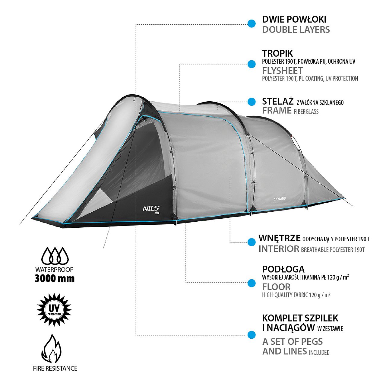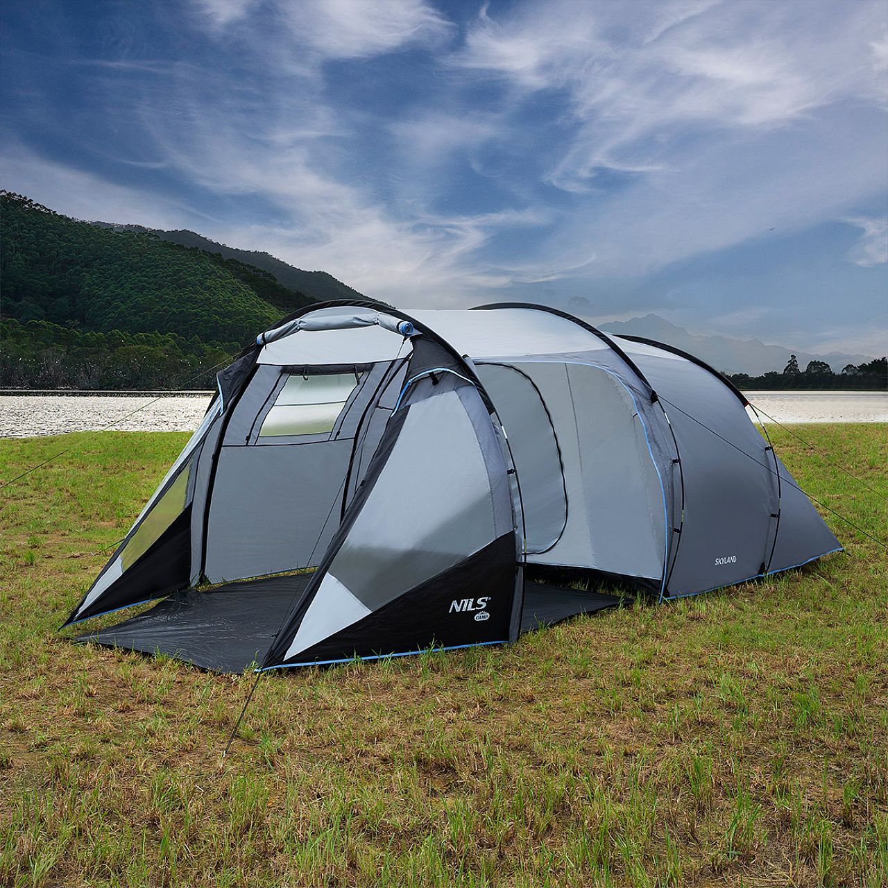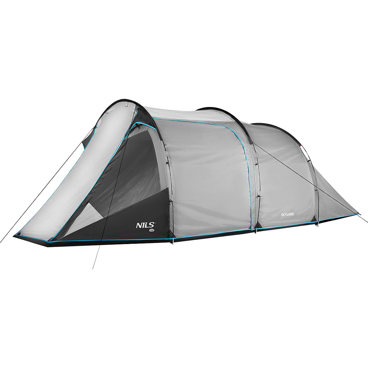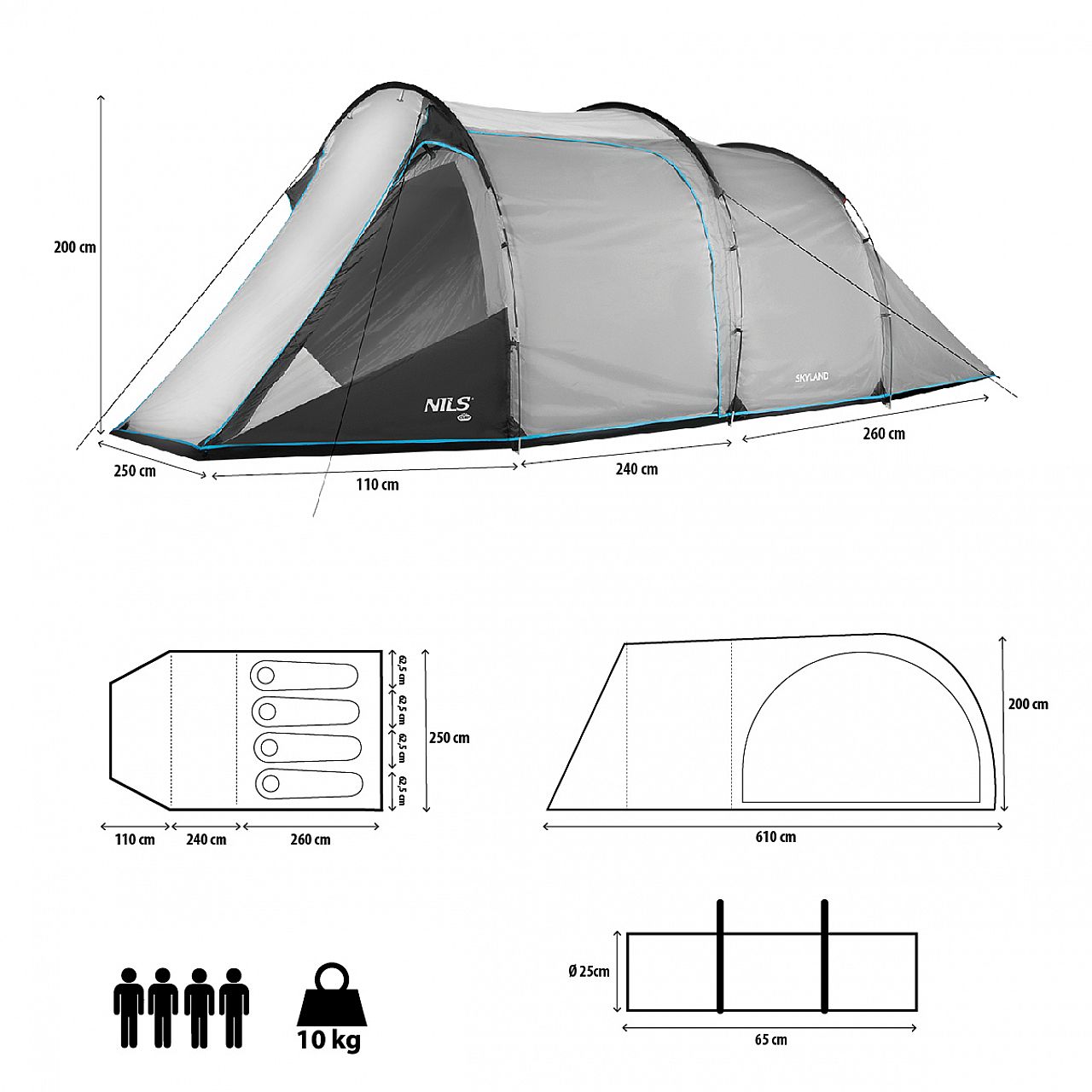 Туристичний намет Nils Camp NC6023 Skyland - найкраще рішення для любителів походів вихідного дня на озеро і тривалого відпочинку в кемпінгу. Skyland — це двокорпусний намет з однією просторою спальнею на чотири людини та великим тамбуром із підлогою, де можна провести дощові вечори чи зберігати туристичне спорядження. У наметі можуть розміститися до чотирьох осіб, що робить його надзвичайно просторим і комфортним.