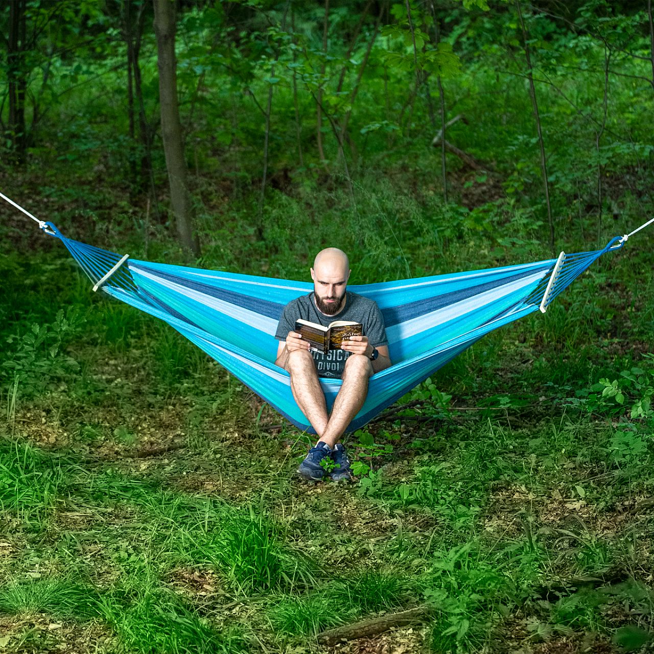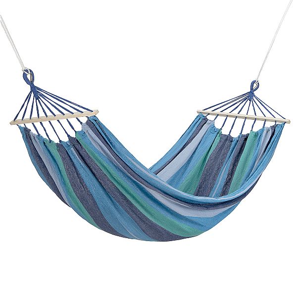 Це гамак, призначений для підвішування, наприклад, між двома деревами. Легко збирається, всі необхідні аксесуари в комплекті. Через кілька хвилин ми зможемо віддатися блаженному відпочинку. Дерев'яний брус довжиною 70 см, розміщений в гамаку як посилення, означає, що матеріал не буде розтягуватися, тому його еластичність завжди буде на одному високому рівні. Завдяки цьому ми будемо відчувати комфорт використання протягом багатьох сезонів. Гамак ідеально облягає наше тіло, а його ширина до 150 см гарантує кожному комфортне положення. Матеріал гамака - поліестер і приємна бавовна щільного переплетення. Таке поєднання дає дуже високу міцність і стійкість до будь-яких деформацій.
