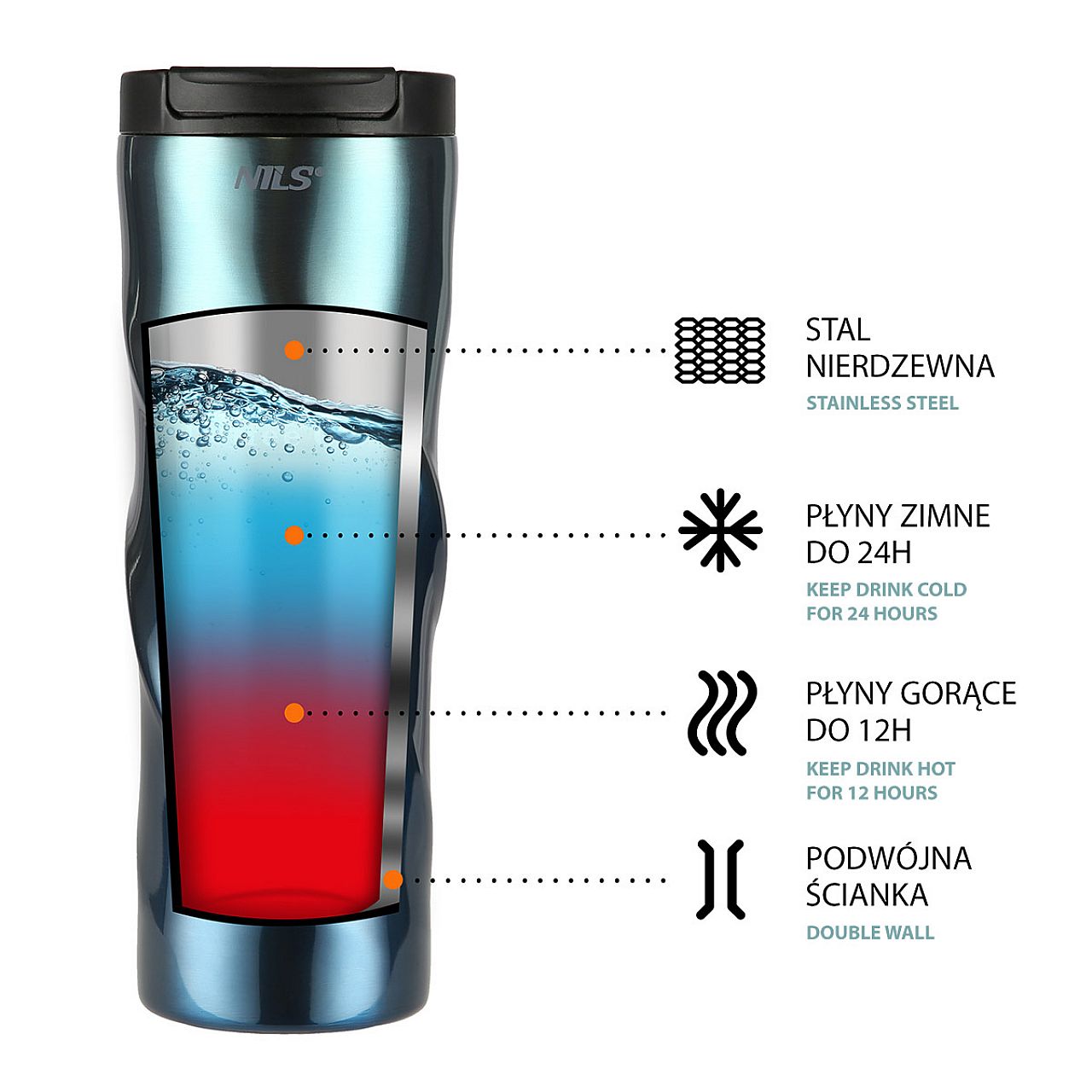Термокружка NCB22 від Nils відрізняється як простою конструкцією, так і оригінальним дизайном! NCB22 - термокружка з двостінної нержавіючої сталі, яка гарантує збереження температури гарячих напоїв протягом 12 годин і холодних протягом 24 годин. Термокружка NCB22 має дуже зручну систему відкривання. Просто потягніть ручку відкривання, і готово. Додатковою перевагою є те, що нижня частина кухля має нековзку гуму, що підвищує безпеку від проливання гарячої кави або чаю, коли кухоль відкрито.