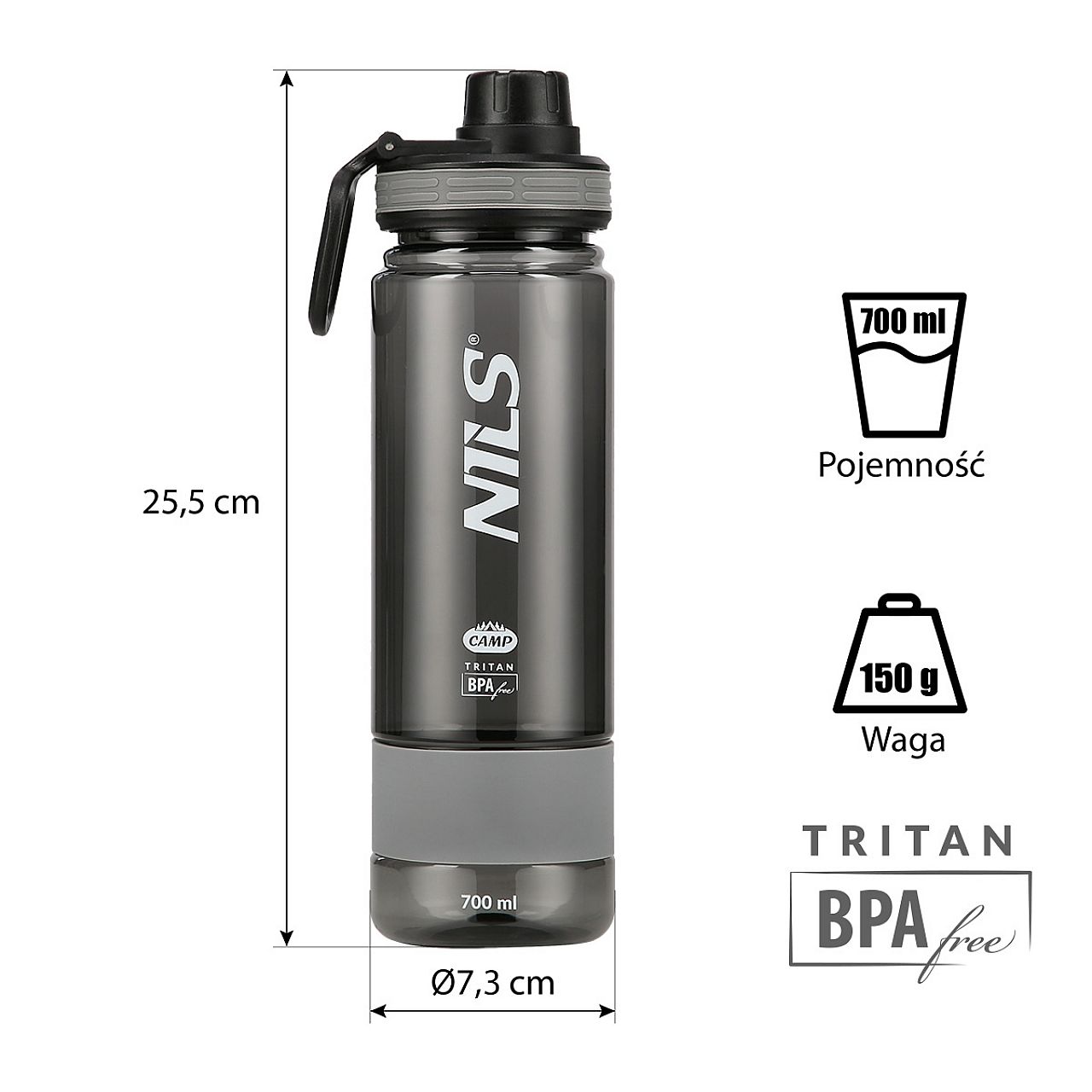 Пляшка з тритану NCD07 від Nils CAMP характеризується надзвичайним поєднанням міцності, ергономічної форми та функціональності. Пляшка Tritan була розроблена таким чином, щоб вона могла супроводжувати нас під час напружених тренувань або тривалих походів. NCD07 має щільний і зручний мундштук, додаткову ручку, яка може стати в нагоді під час транспортування, і гумову вставку, яка полегшує зручне утримання пляшки.
