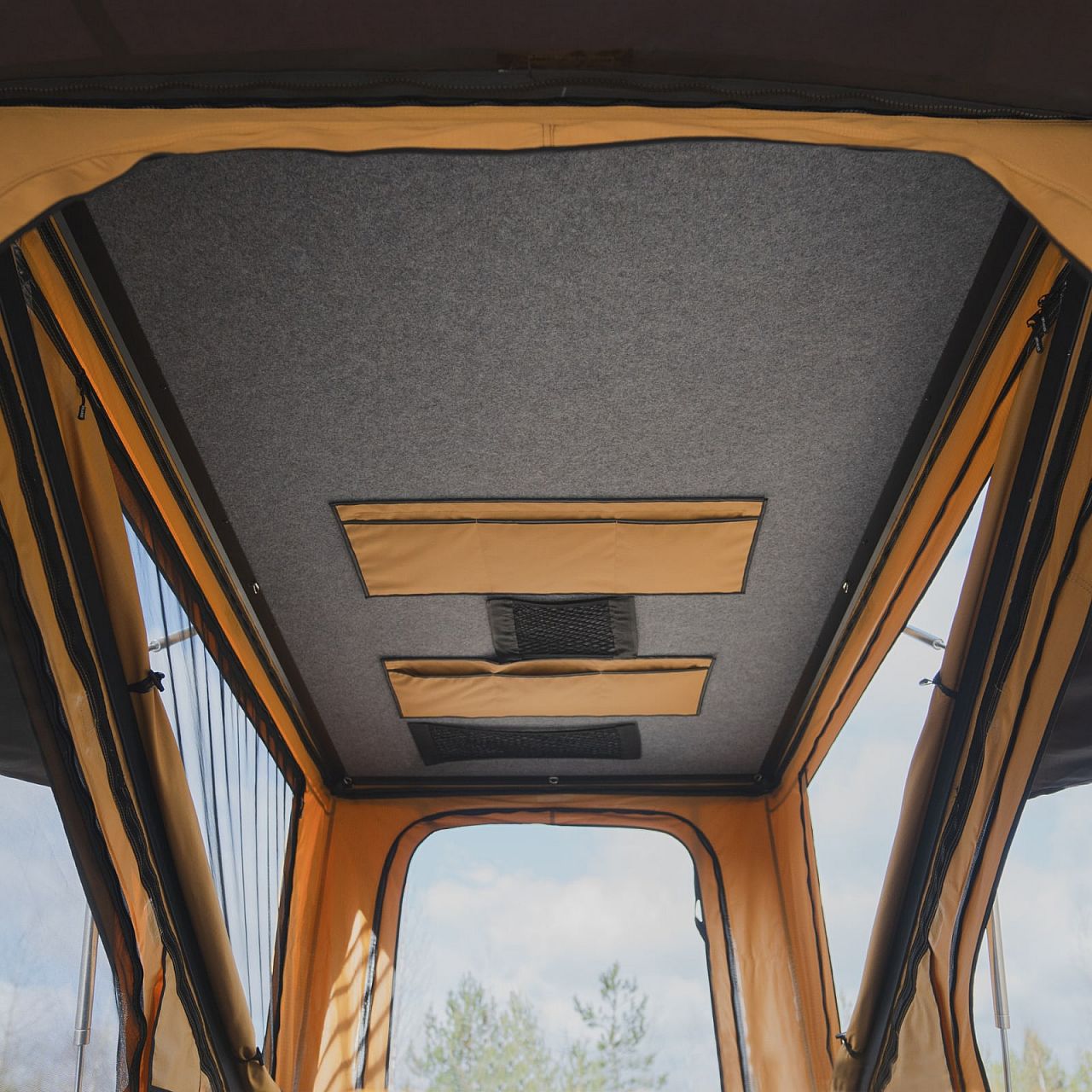 У комплект входить дві багажні сітки і дві великі кишені. З одного боку вони мають липучки, тому ви можете змінювати їх розташування на свій розсуд. Ми також включили постійне світлодіодне освітлення з регульованою інтенсивністю світла. Просто підключіть джерело живлення 5 В через роз'єм USB. На внутрішніх стінках намету ви знайдете чотири додаткові менші кишені для аксесуарів.