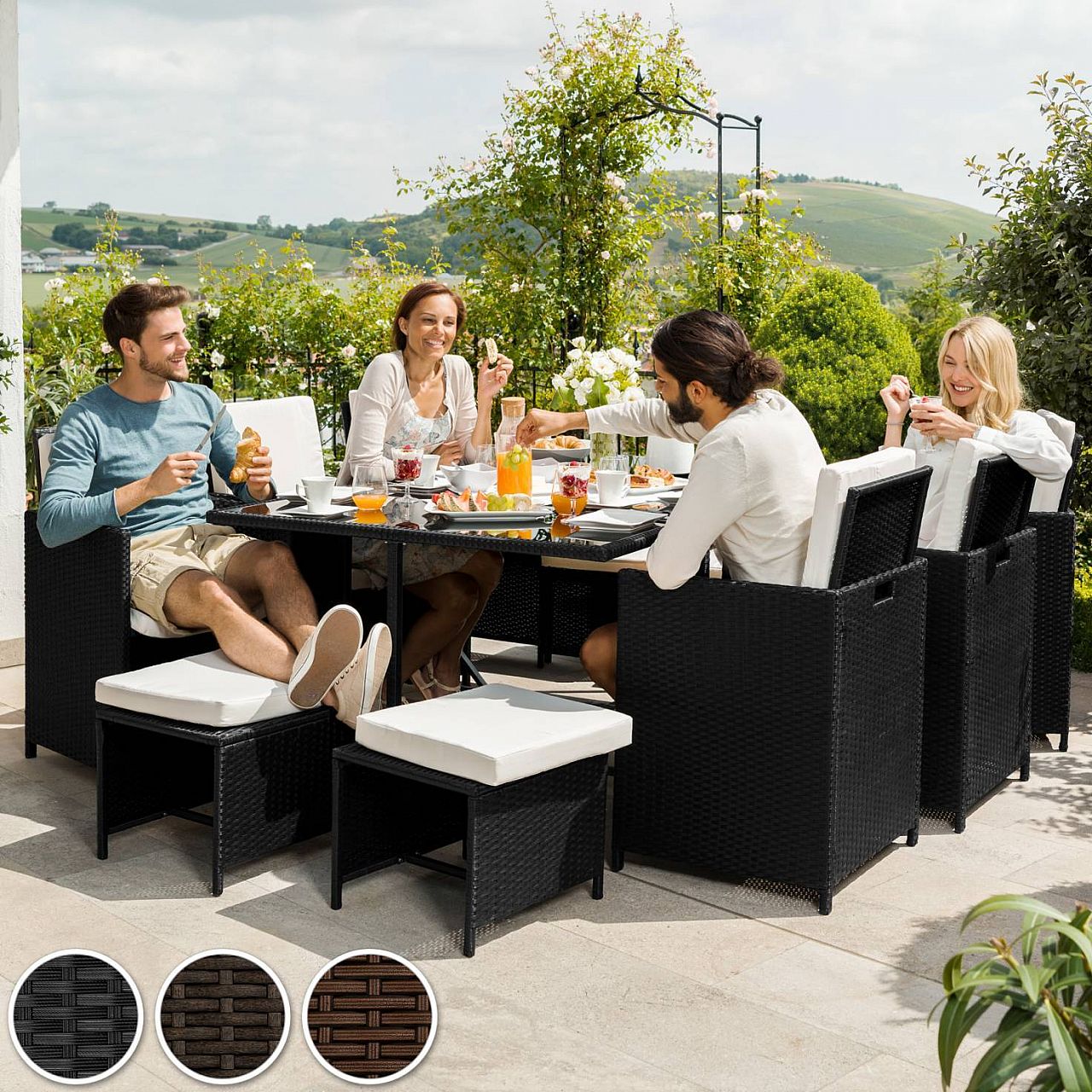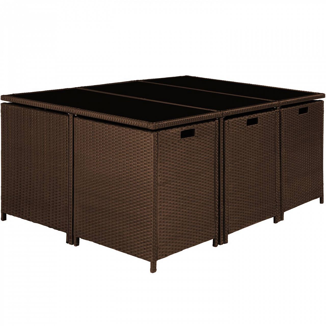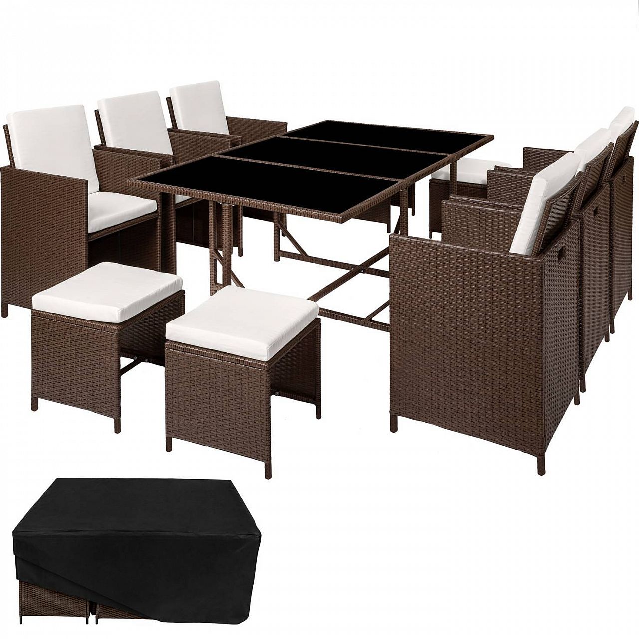 Використовуваний матеріал, тобто поліраттан, був спеціально розроблений для садових меблів. Polyrattan – це загальний термін, який визначає матеріал для плетіння поліуретану, який є промислово підготовленою альтернативою натуральному ротангу. Набір меблів для відпочинку можна мити, легко дбати і він стійкий до погодних умов. М'які подушки кремового кольору водонепроникні та можуть бути легко видалені завдяки вшитим кришкам. Загартоване скло знизу пофарбоване в чорний колір, що надає йому елегантного вигляду. Стільці можна легко переміщати завдяки поглибленню, встановленому з обох боків. Завдяки складеній спинці стільці та табурети можна скласти у модульну систему. Чохол, що додається, забезпечує додатковий захист для продовження терміну використання цього чудового набору для відпочинку.