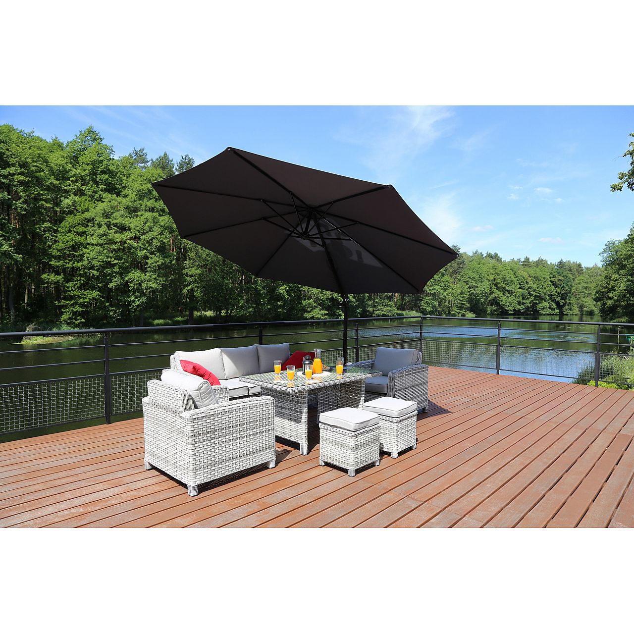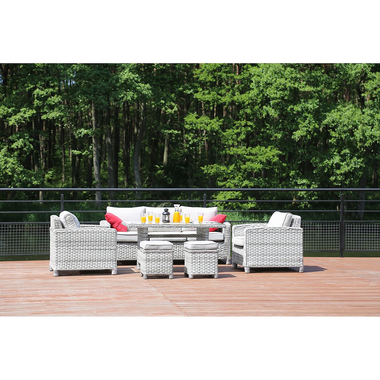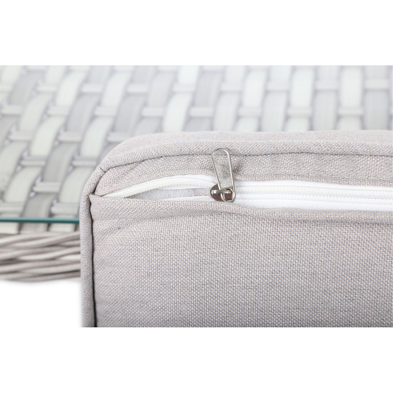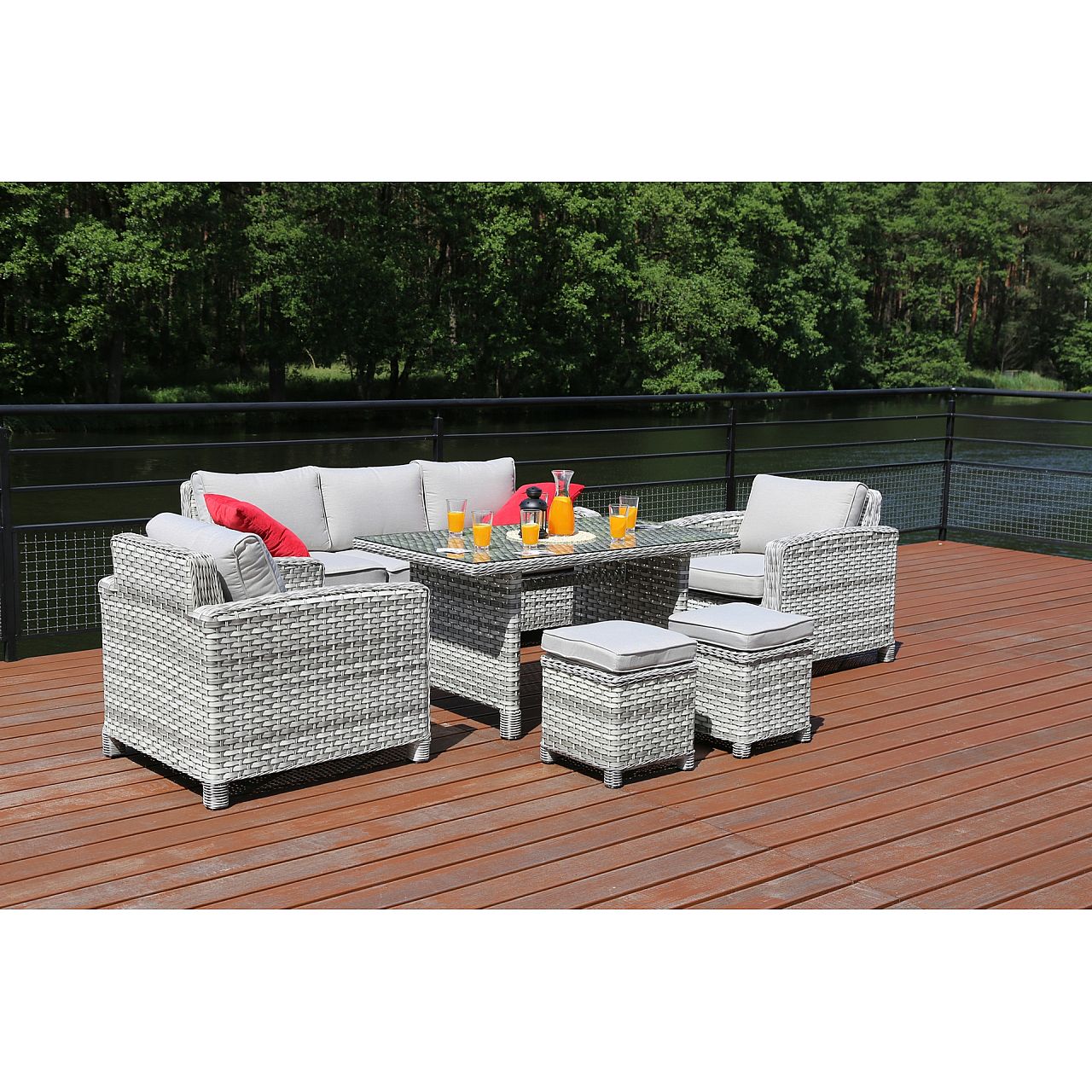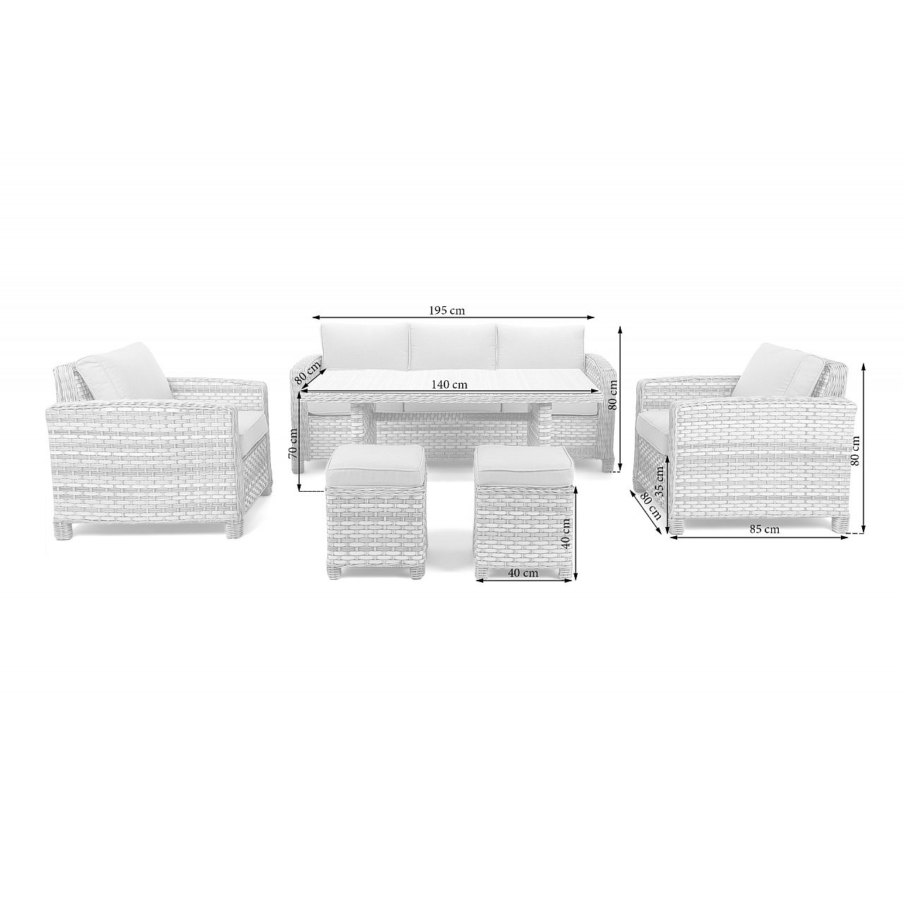 Садові меблі з техноратангу Montana - це великий лаунж-набір , за допомогою якого ми можемо облаштувати терасу, а також вітальню вдома або простір у зимовому саду. Надійна робота гарантує його корисність протягом багатьох років. Алюмінієві профілі з порошковим покриттям утворюють міцний і легкий каркас. Чохол виготовлений з ручного плетеного техноратанга - матеріалу, надзвичайно стійкого до УФ-променів, вологи та перепадів температури. Він також гнучкий і ефективно протистоїть механічним пошкодженням. Комплект садових меблів Монтана складається з дивана, 2 крісел, 2 пуфів і журнального столика - тому в ньому зможе розміститися досить велика сім'я або компанія друзів. Стіл оснащений склопакетом із загартованого скла. 5 мм. Комфорт відпочинку забезпечують товсті подушки, оббиті приємним на дотик матеріалом. Чохол застібається на блискавку, тому його можна легко зняти і випрати.