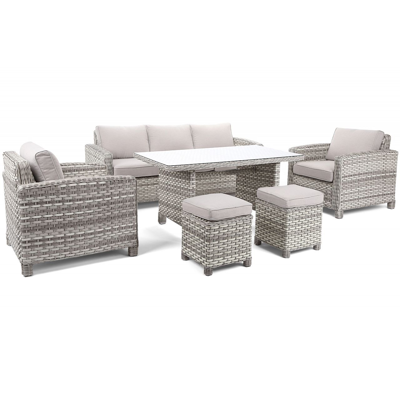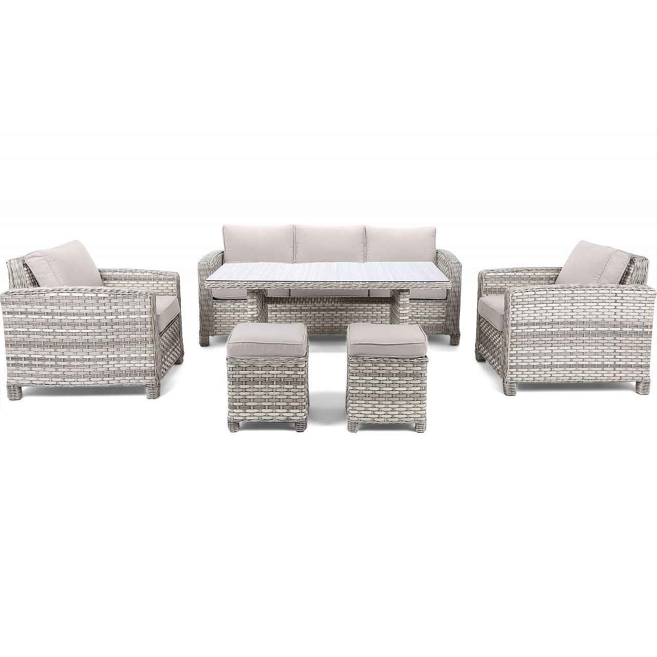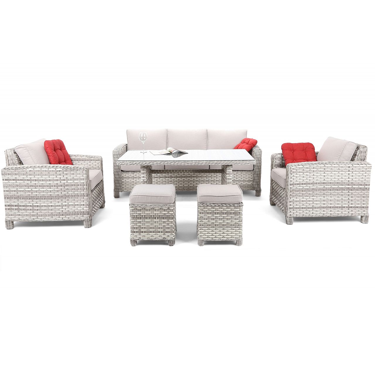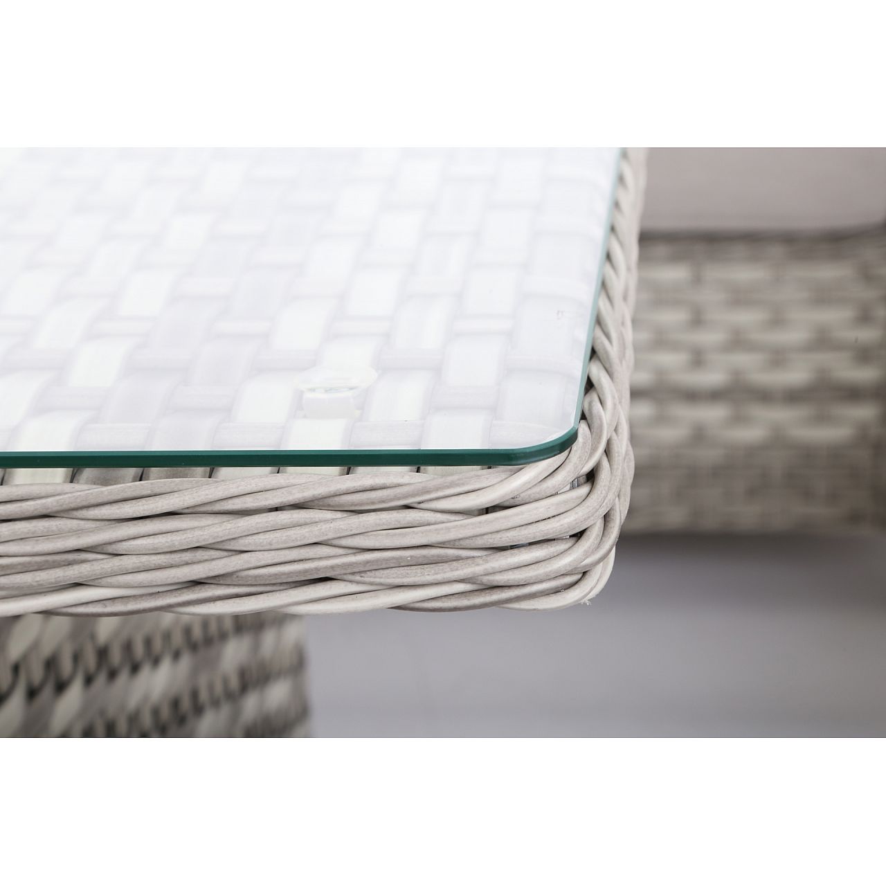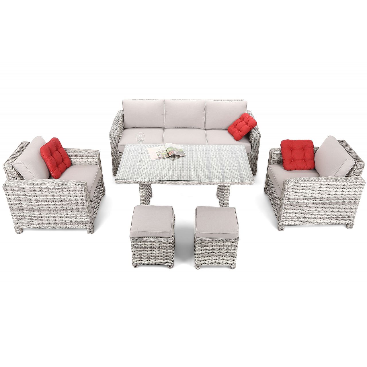 Садові меблі з техноратангу Montana - це великий лаунж-набір , за допомогою якого ми можемо облаштувати терасу, а також вітальню вдома або простір у зимовому саду. Надійна робота гарантує його корисність протягом багатьох років. Алюмінієві профілі з порошковим покриттям утворюють міцний і легкий каркас. Чохол виготовлений з ручного плетеного техноратанга - матеріалу, надзвичайно стійкого до УФ-променів, вологи та перепадів температури. Він також гнучкий і ефективно протистоїть механічним пошкодженням. Комплект садових меблів Монтана складається з дивана, 2 крісел, 2 пуфів і журнального столика - тому в ньому зможе розміститися досить велика сім'я або компанія друзів. Стіл оснащений склопакетом із загартованого скла. 5 мм. Комфорт відпочинку забезпечують товсті подушки, оббиті приємним на дотик матеріалом. Чохол застібається на блискавку, тому його можна легко зняти і випрати.