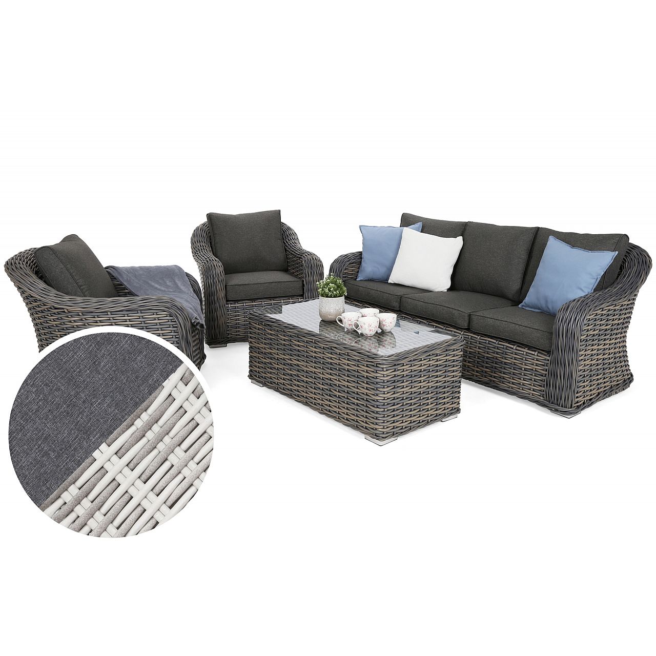 Гарнітур Foggia також вирізняється своїм класичним стилем, який ідеально доповнює різні садові композиції. Меблі виконані в сірому кольорі, що додає елегантності та бездоганно поєднується з зеленим оточенням. Крім того, зручні подушки підвищують комфорт меблів та забезпечують тривалий відпочинок.