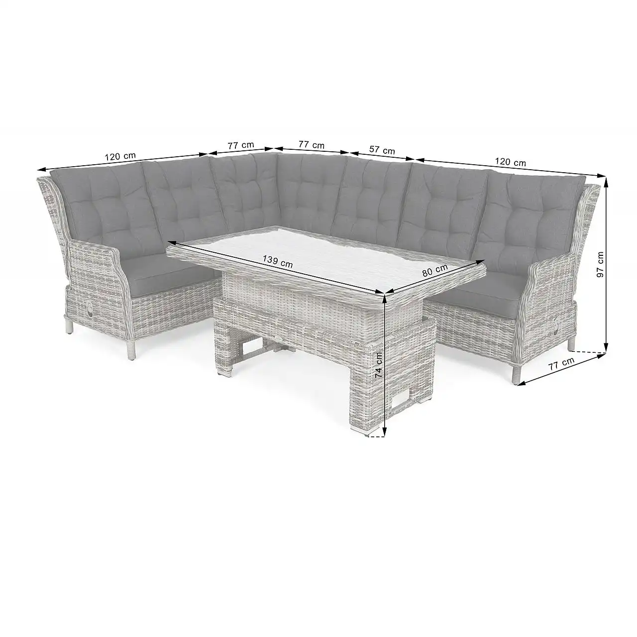 Бажаєте зручно розмістити гостей і знайти рішення для великої родини, проводячи час на терасі чи в саду? Кутовий диван Trivento - це елегантний, функціональний і надзвичайно комфортний садових меблів, розрахований на 6 осіб. Це точно виправдає ваші очікування.