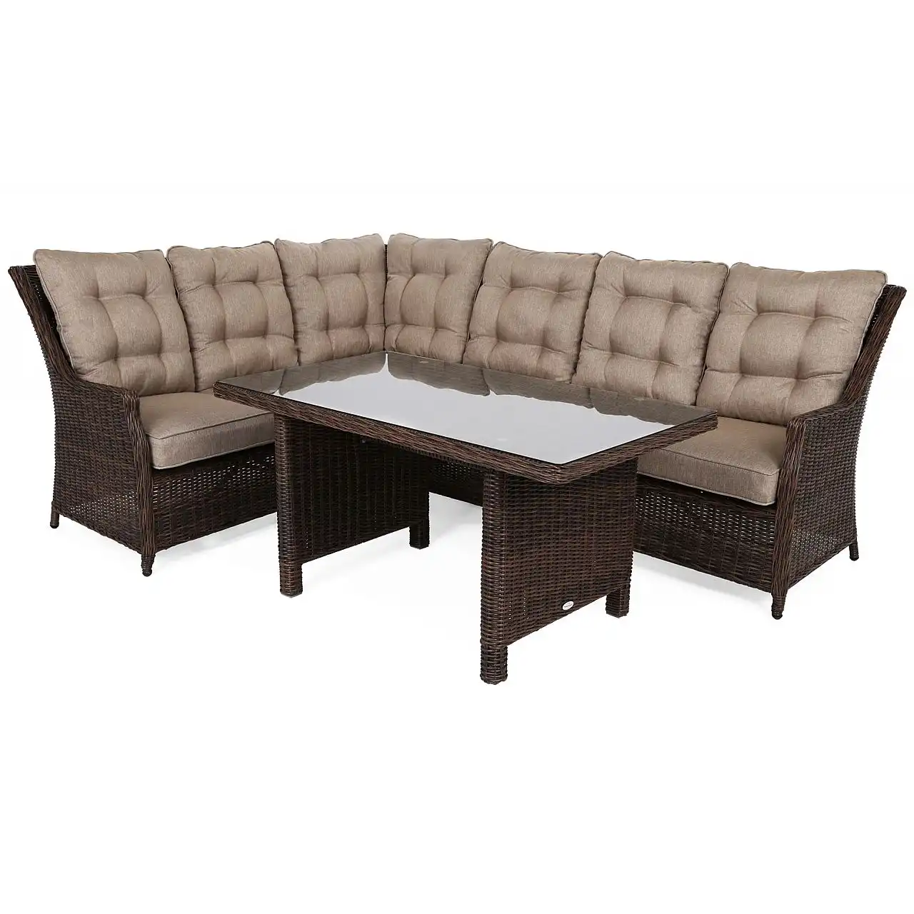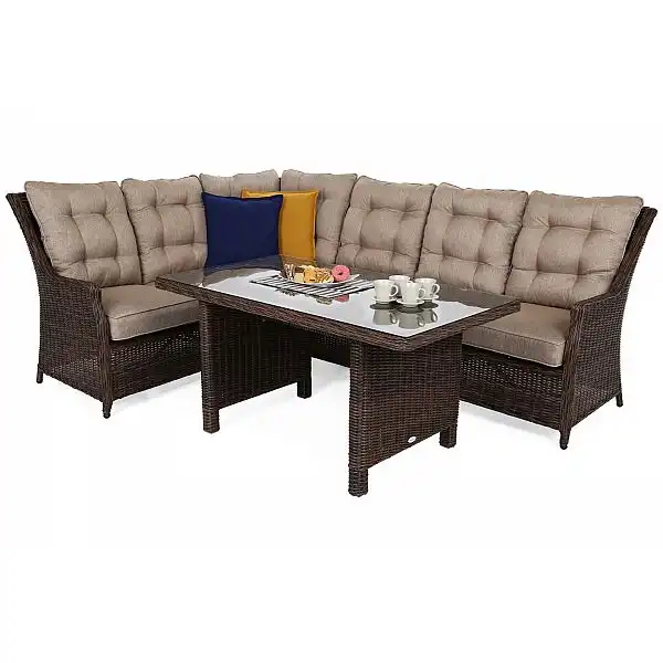 Кутовий диван Alicante техноротанг - садові меблі, на яких можуть розміститися до 6 осіб. Комплект складається зі столу та двох диванів, які створюють садовий куточок. Довговічність забезпечує алюмінієва конструкція з порошковим покриттям, вкрита техноратангом ручної роботи. Товсті подушки і високі спинки забезпечують комфорт використання. Подушки виготовлені з високоякісного поліестеру, який гарантує стійкість до несприятливих погодних умов. Застібка-блискавка, яка використовується в подушках, дозволяє швидко та легко знімати та чистити. Аліканте – це комфорт і найвища якість.