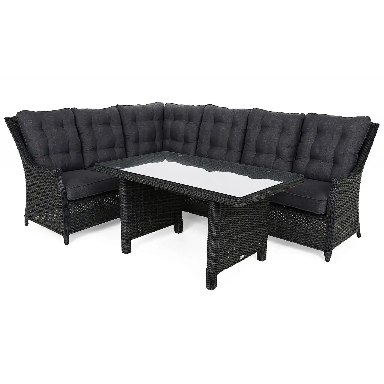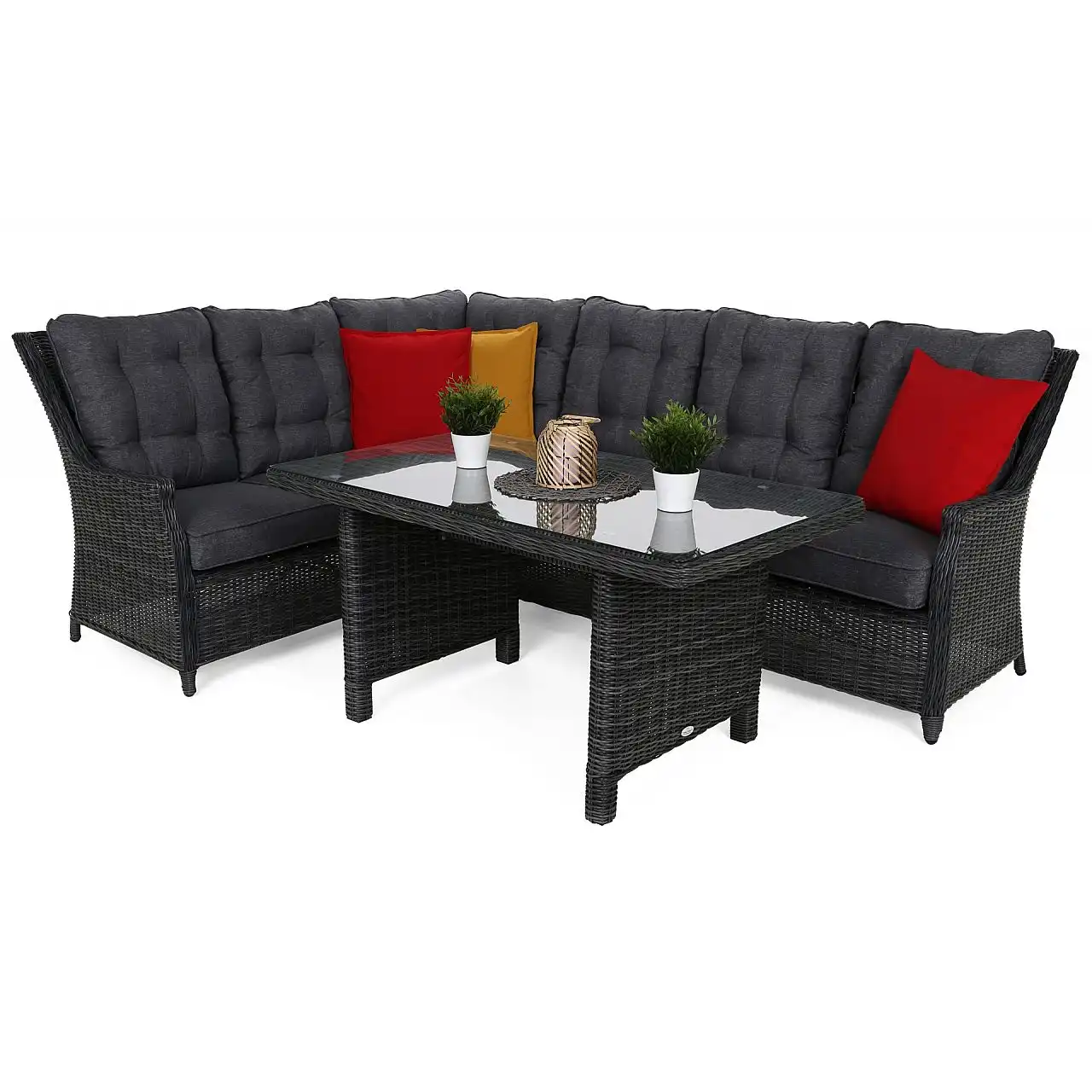 На кутовому дивані з техноратангу Alicante grey комфортно розмістяться шість осіб. Завдяки цьому ви створите простір, ідеальний для проведення часу на свіжому повітрі. Сірий колір чудово виглядає на сучасних терасах, а приємні на дотик подушки забезпечують ще більший комфорт. Ви можете зручно розташуватися і поставити на стіл чашку кави або розкласти столовий посуд.
