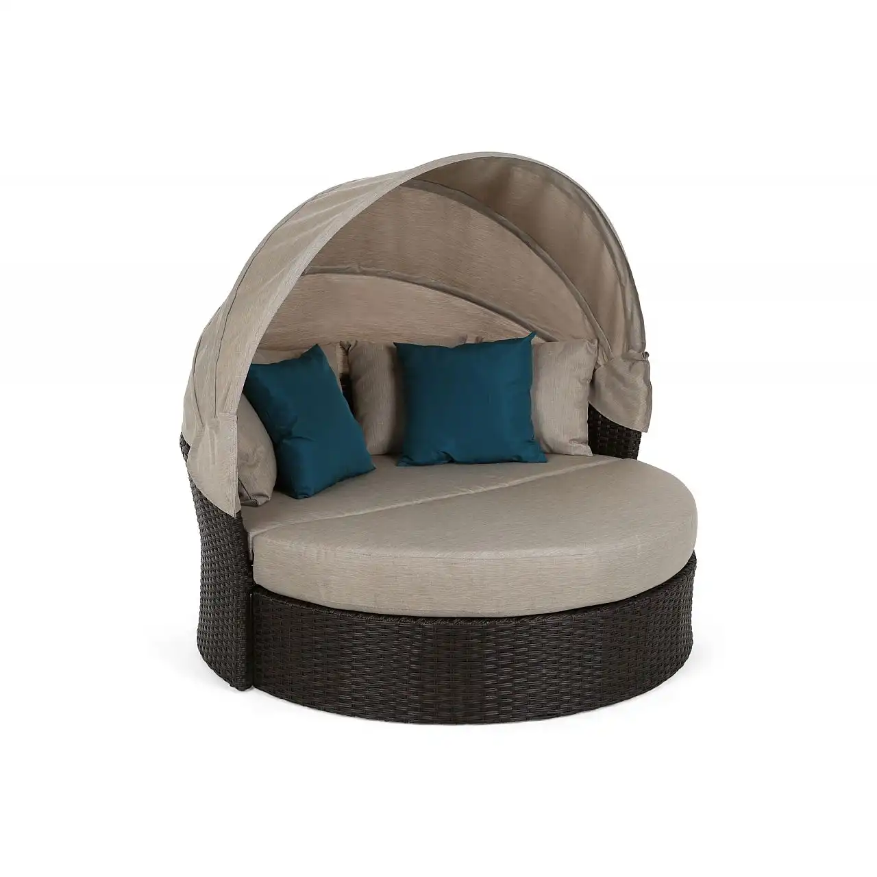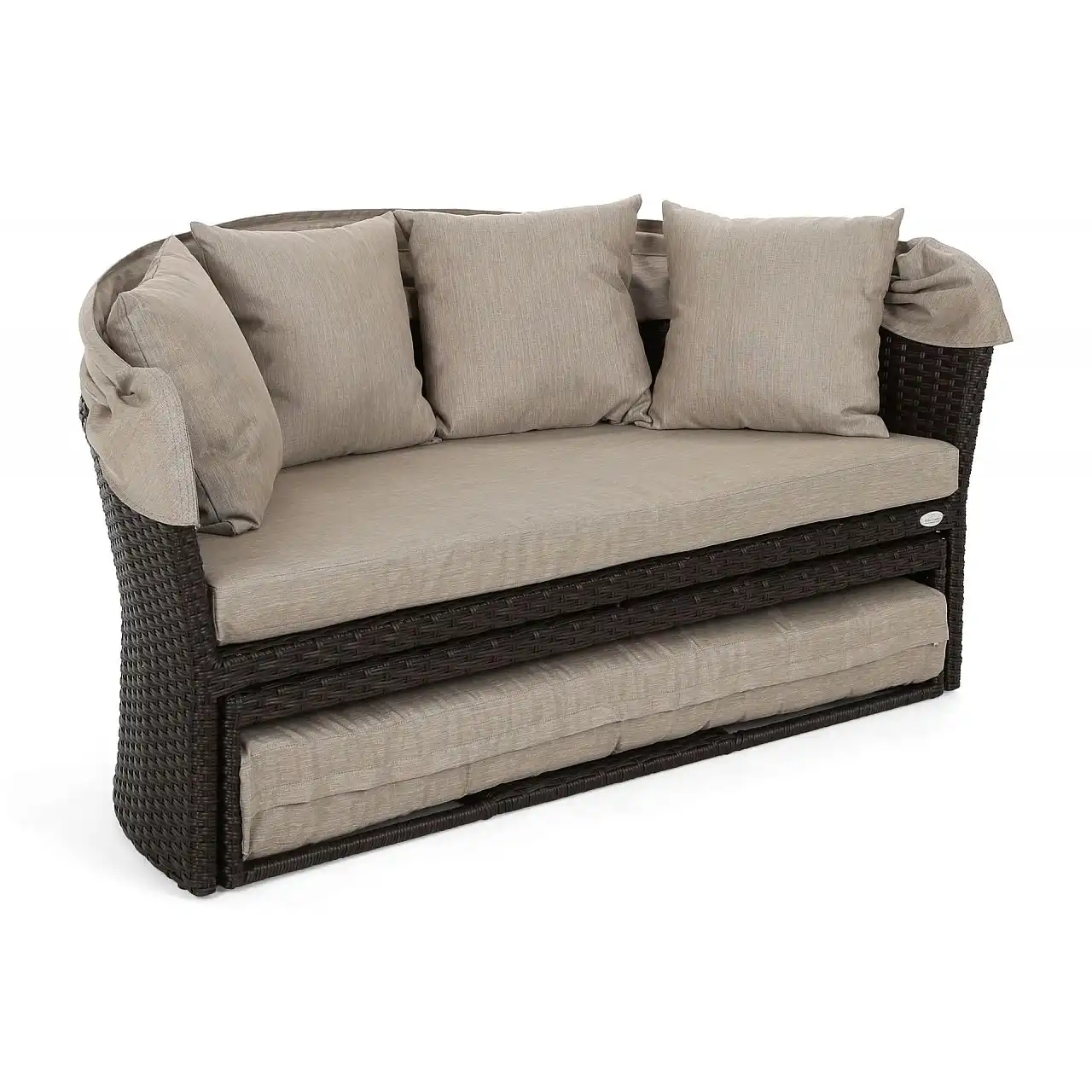 Диван з колекції «Сідней» ідеально впишеться в сучасний дизайн тераси. Найпривабливішими елементами дивана, безумовно, є розкладний тент та кругла форма. Також варто відзначити місце для зберігання, розташоване під сидінням, завдяки якому меблі можна легко трансформувати в зручний двомісний шезлонг, лежак з навісом, а також садову лавку або пляжний кошик.