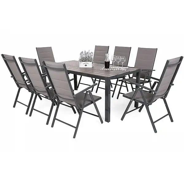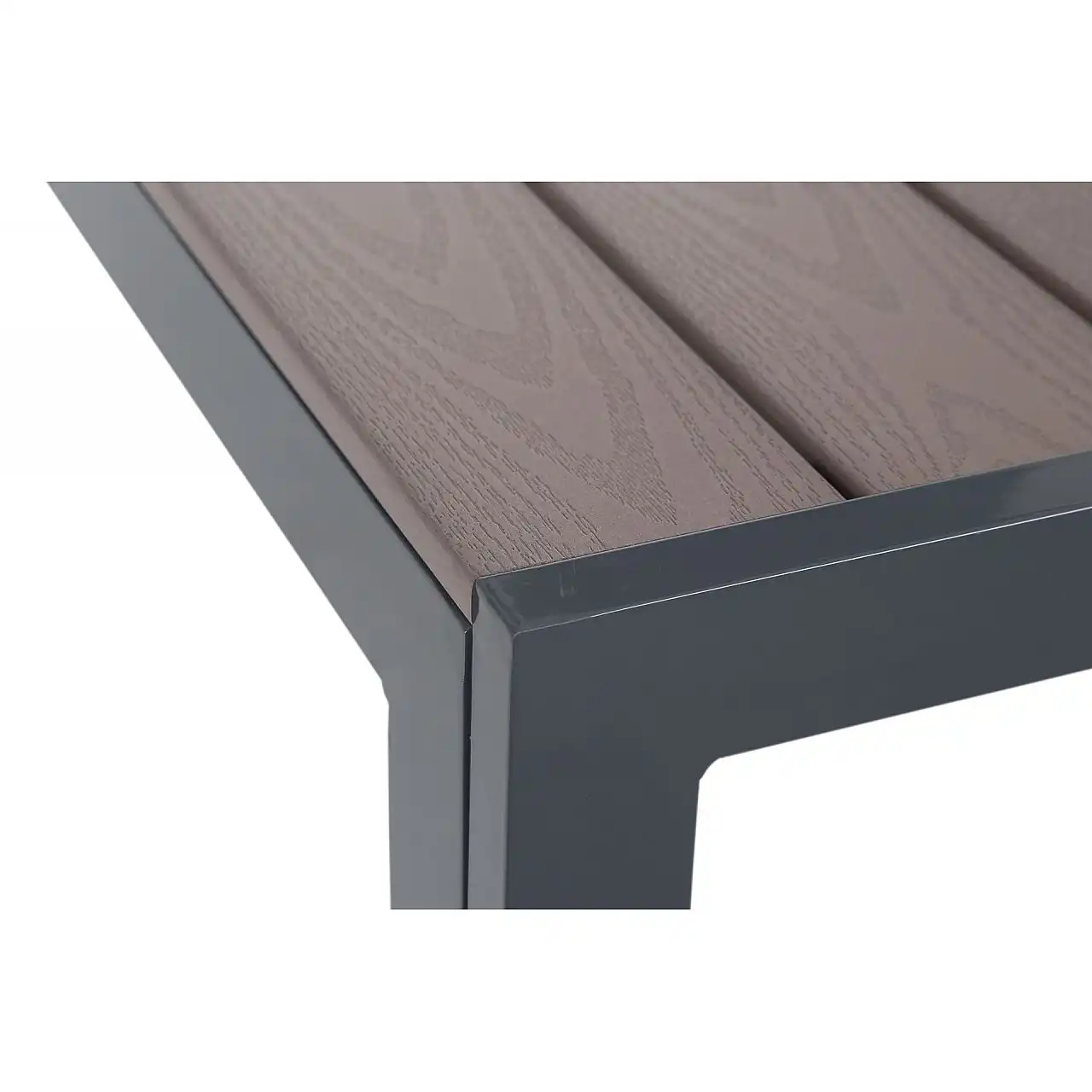 Стіл і стільці виготовлені з високоякісного алюмінію з порошковим покриттям. Пропонований набір включає стільницю з неводовбираючих композитних плит WPC, які використовуються, в тому числі, для виробництва сучасних терасових і фасадних систем. Найважливішим конструктивним елементом столу є 4 П-подібних алюмінієвих профілю. Їх використання робить стіл надзвичайно стійким після складання! Таке рішення дозволило звільнити простір під столом і уникнути непотрібних додаткових конструкцій, які заважають комфортному користуванню меблями.