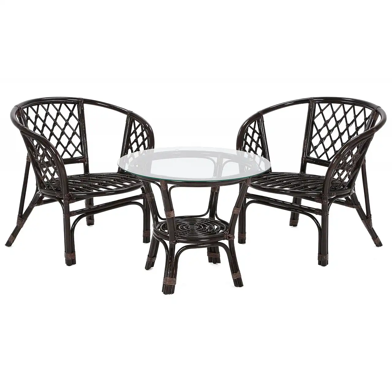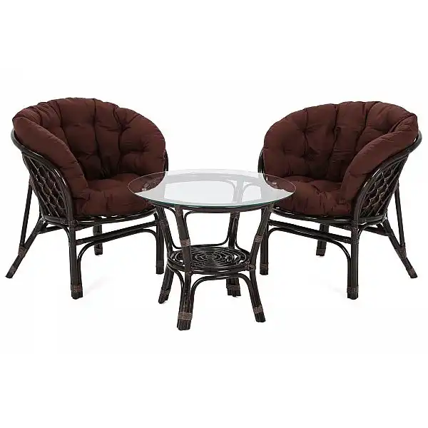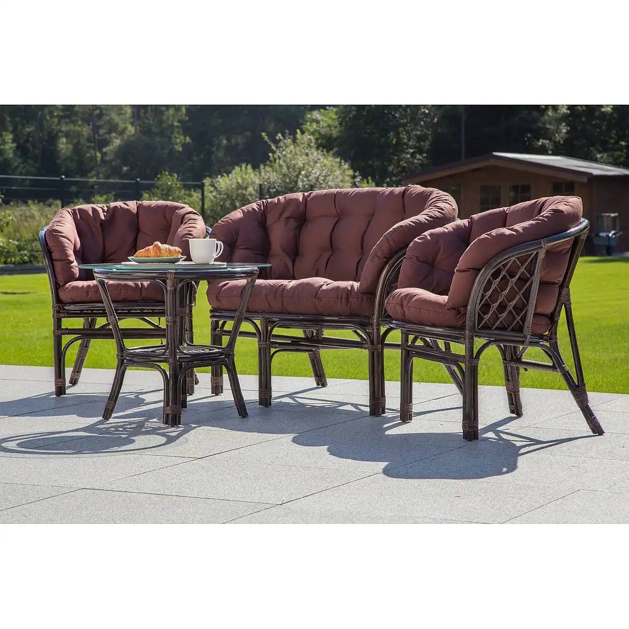 Меблі з натурального ротанга завойовує все більше прихильників. Завдяки тому, що цей матеріал не деформується, гнучкий і легкий, і в той же час стійкий до механічних пошкоджень, він давно замінив лозу. Садові меблі з ротанга Bahama — це елегантний і зручний набір для двох, який можна використовувати в різних місцях. Чудово виглядає в саду, але також часто прикрашає інтер'єри віталень, ексклюзивних кафе і терас. Комфортні подушки, оббиті тканиною, яка є сумішшю бавовни та поліестеру, у поєднанні з відповідною формою сидінь забезпечують комфорт кожному користувачеві. У комплект також входить стильний круглий стіл зі стільницею із загартованого скла. Меблі з коричневого ротанга Bahama задовольнять навіть найвишуканіші смаки.
