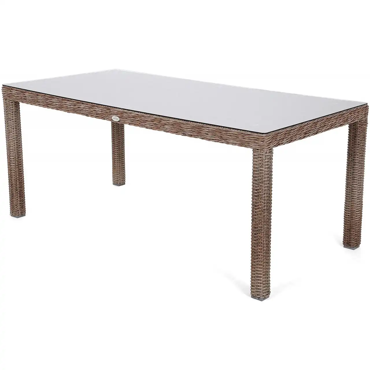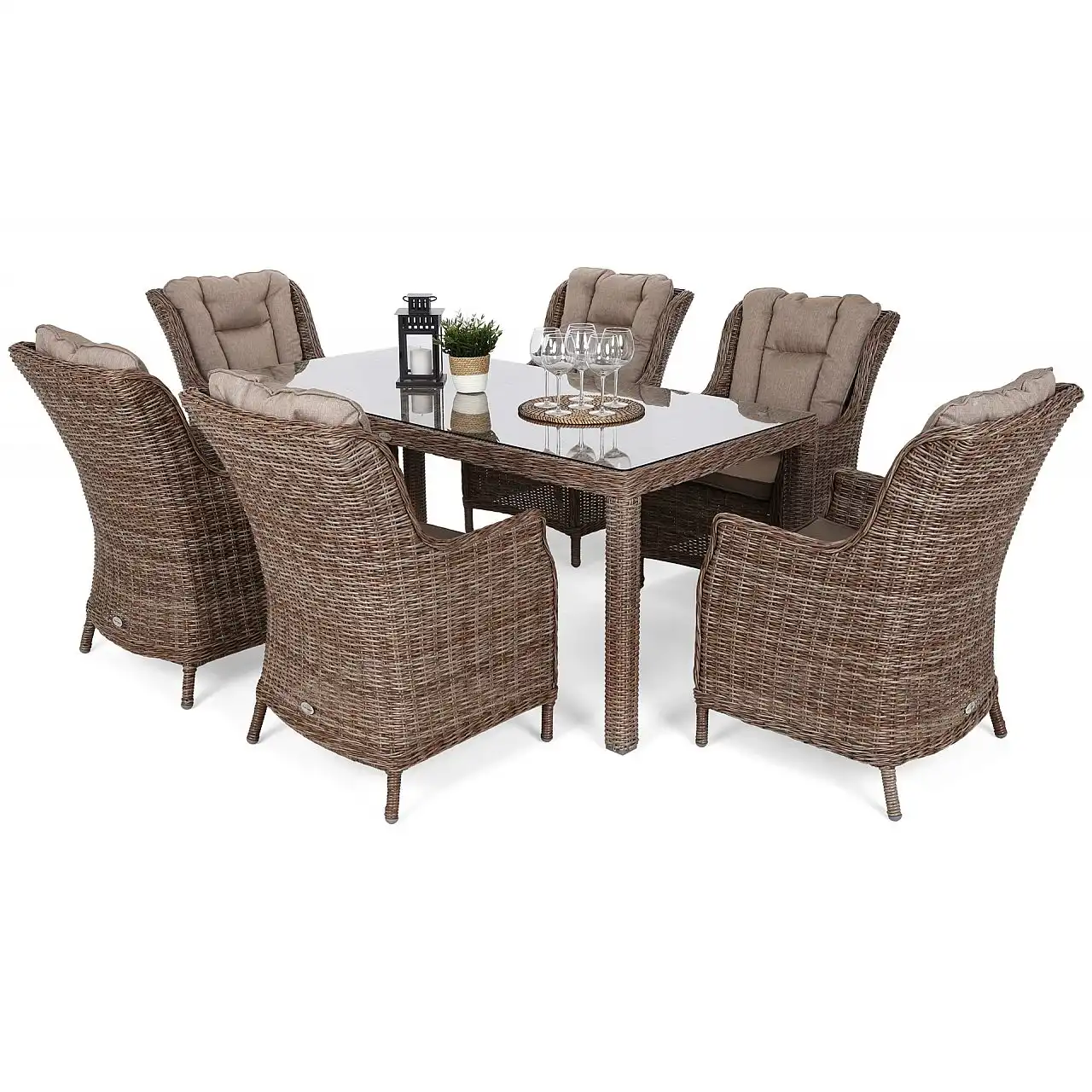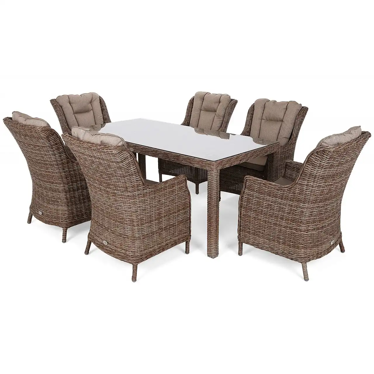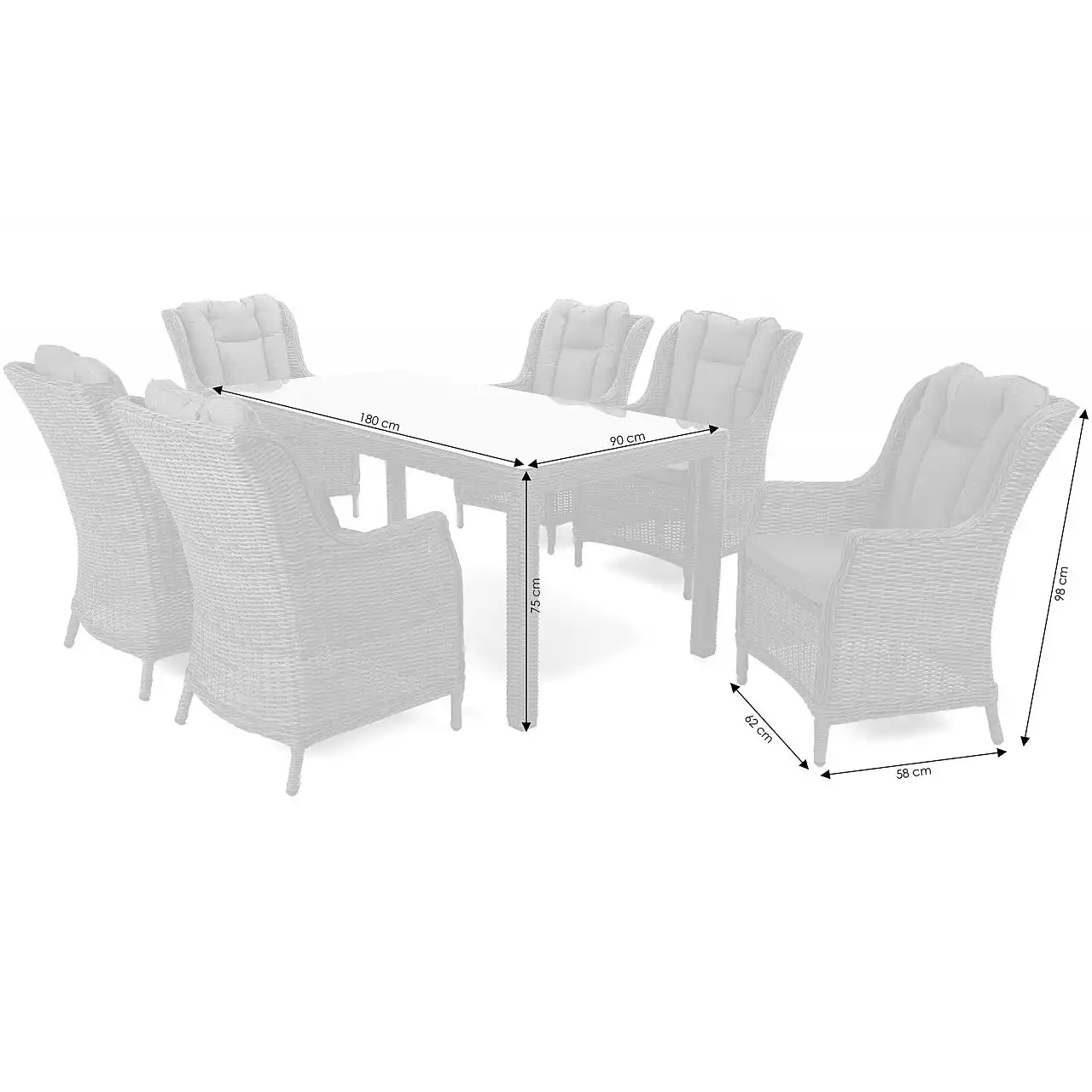 Набір меблів з техноротанга для їдальні, ідеально підходить для тераси або для організації урочистих заходів з найближчими друзями. Зручний і комфортний, він задовольнить найвишуканіші смаки. Набір складається зі столу з міцною стільницею із загартованого скла товщиною 5 мм і 6 зручних крісел з подушками. Конструкція столу виготовлена з алюмінієвих профілів, покритих техноротангом ручної роботи в елегантному стилі. Текстура техноротанга нагадує лозу, гладка і приємна на дотик. Подушки оброблені водонепроникним матеріалом, який легко знімається та чиститься за допомогою блискавки. Садові меблі Bristol - це розкіш для людей, які цінують цікавий дизайн і функціональність.