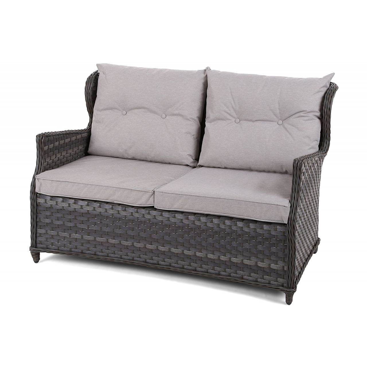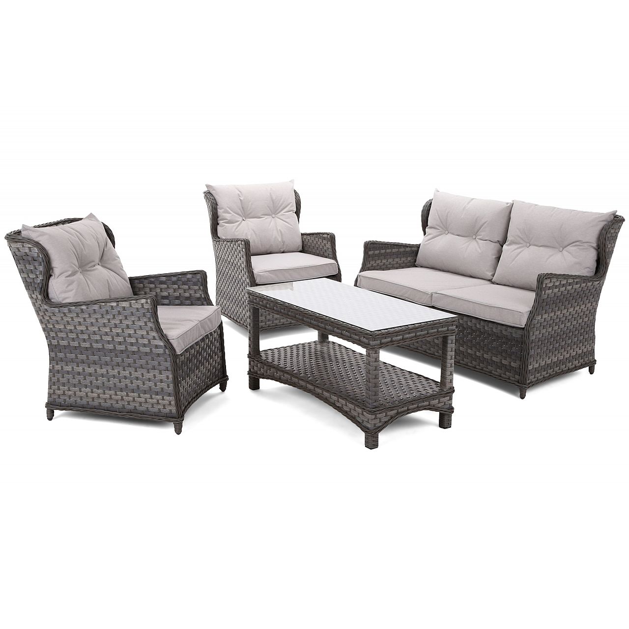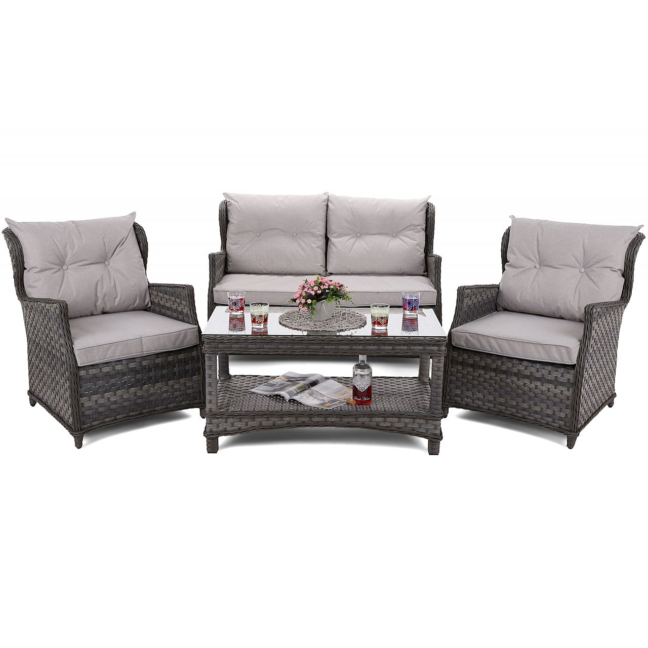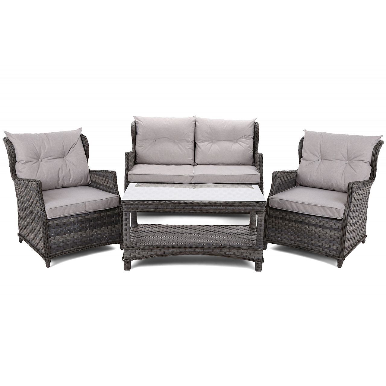 Міцний металевий каркас покритий порошковою фарбою, що підвищує стійкість конструкції до погодних умов. Оздоблення - плетіння з техно-ротангу, що дуже нагадує натуральний ротанг. У комплект також входять дуже зручні подушки.